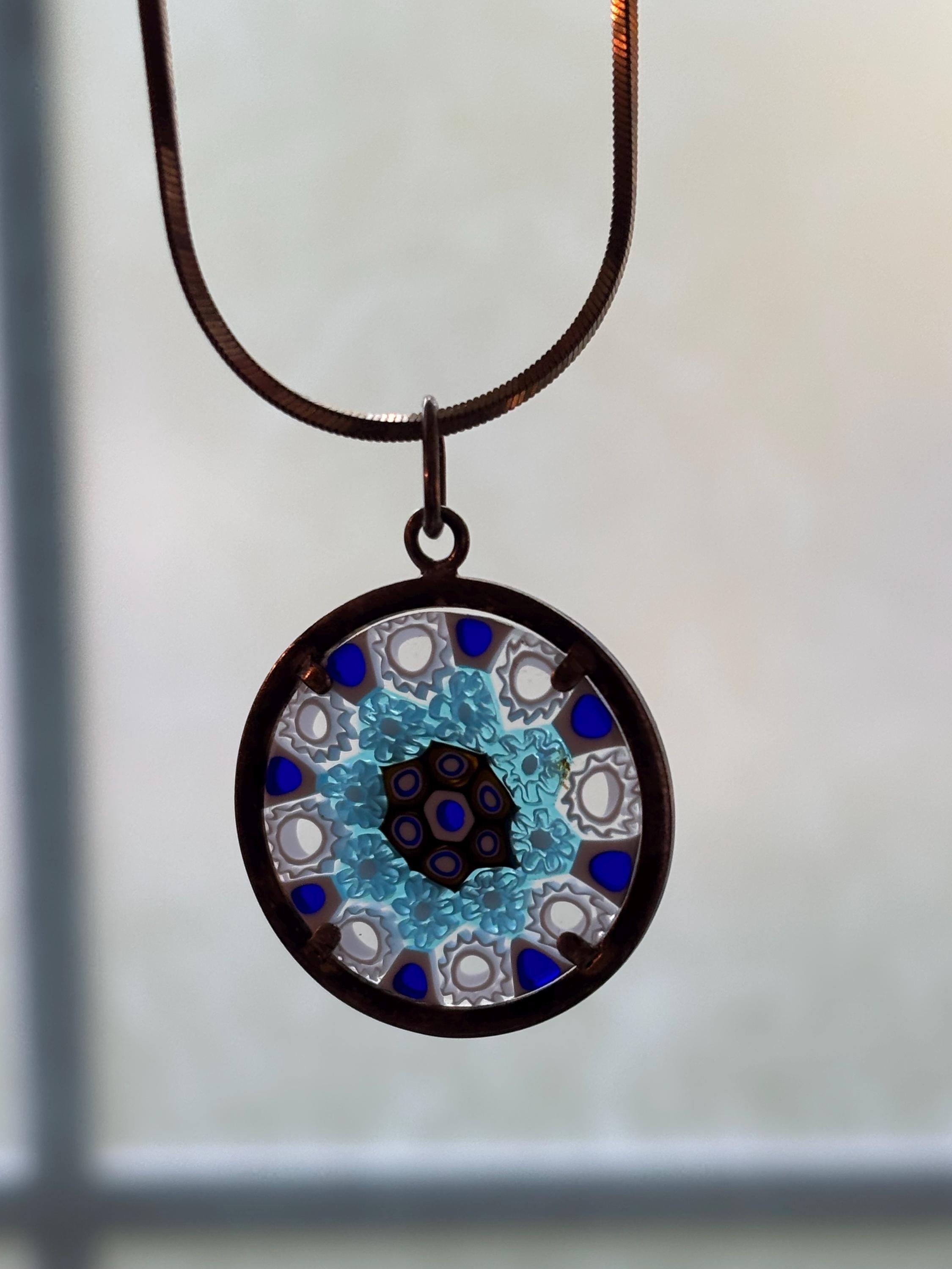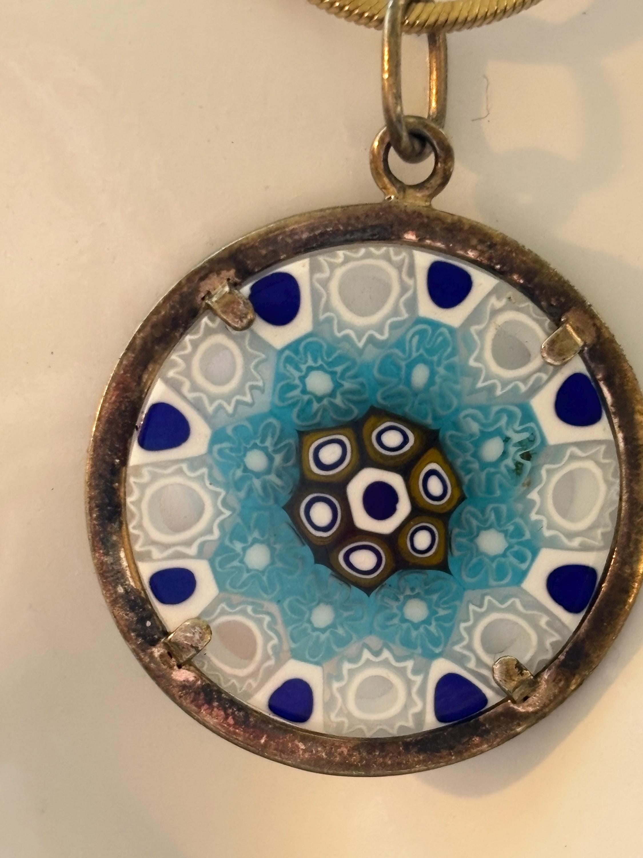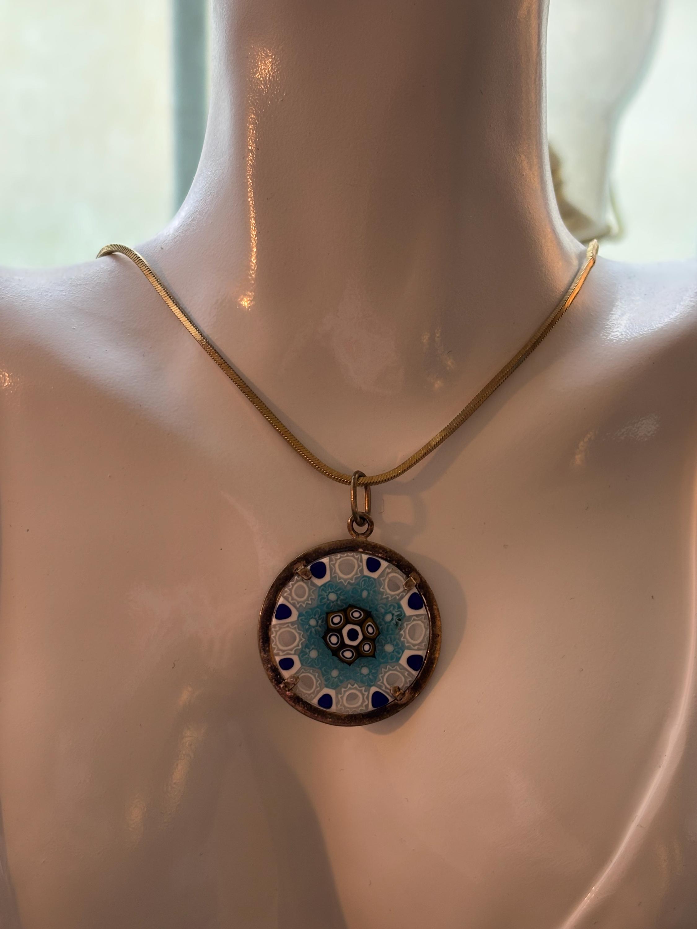 This listing is for a gold tone box chain with a beautiful glass millefiori pendant. It looks like stained glass and is absolutely lovely. With several hues of blue and contrasting white and darker colors- its a standout piece. It's in really good condition and the clasp is in perfect working order. A very unique, pretty necklace! Chain length is 8" and pendant is almost 1" across.
