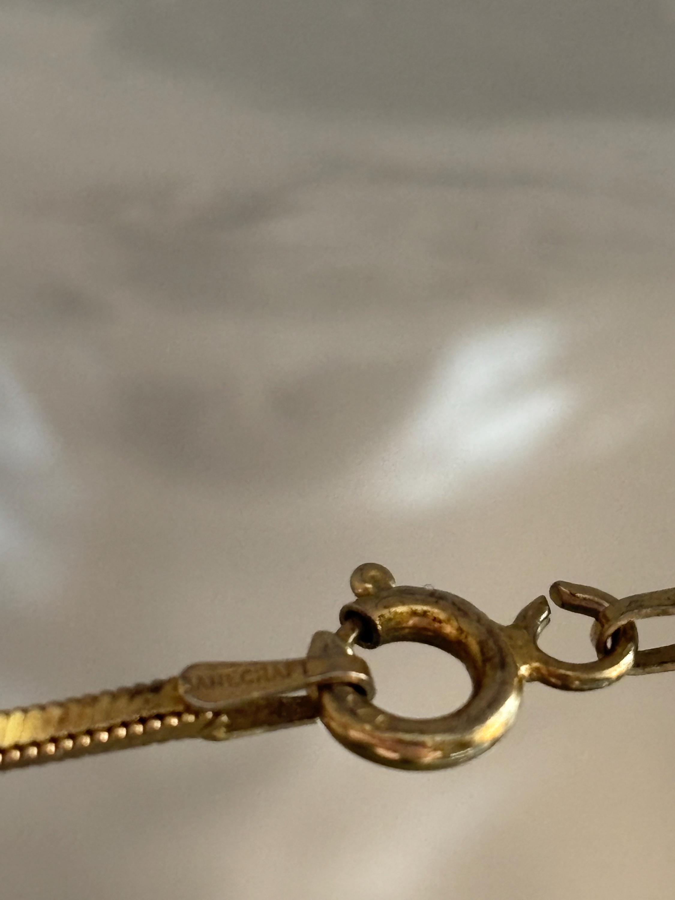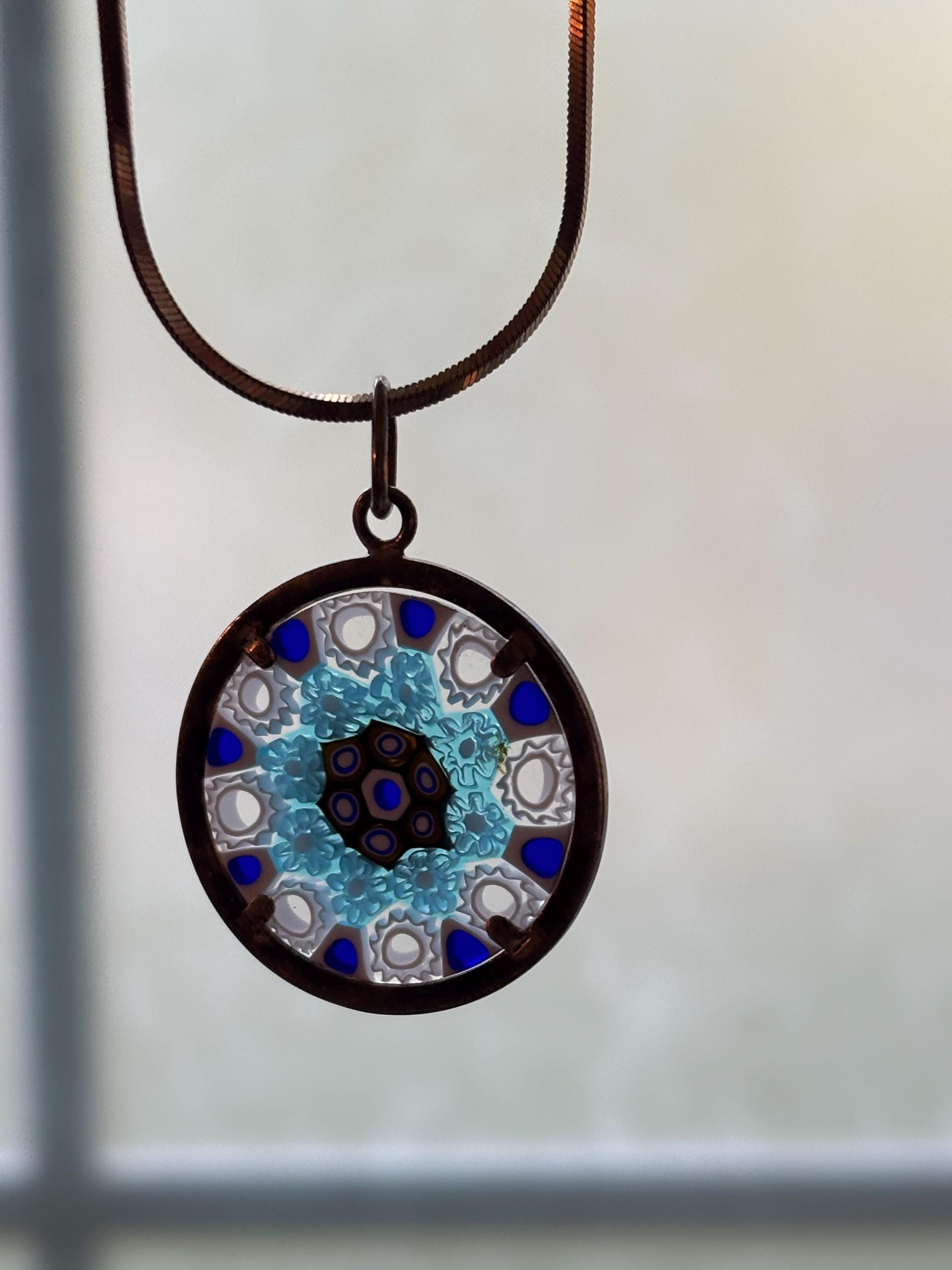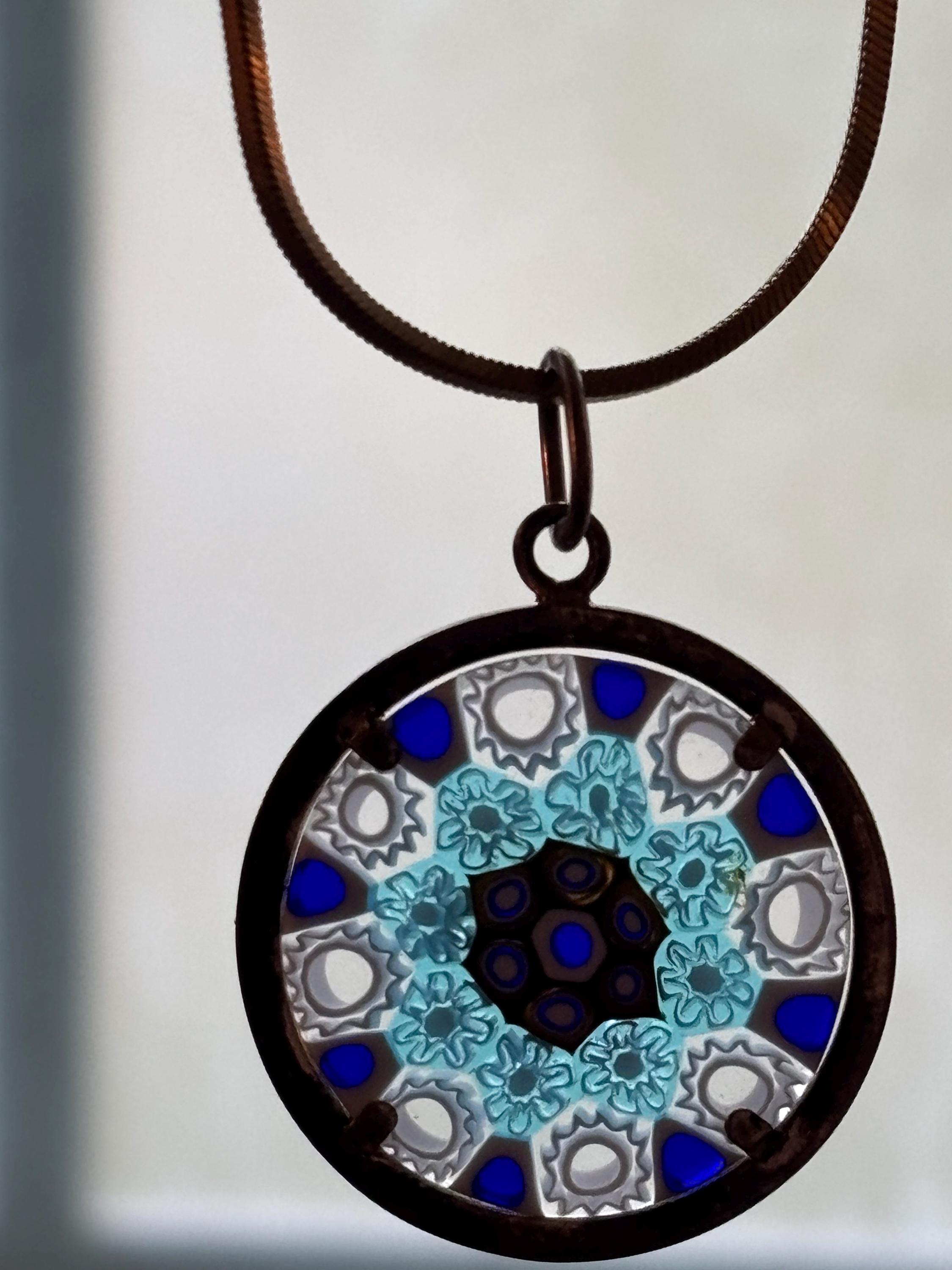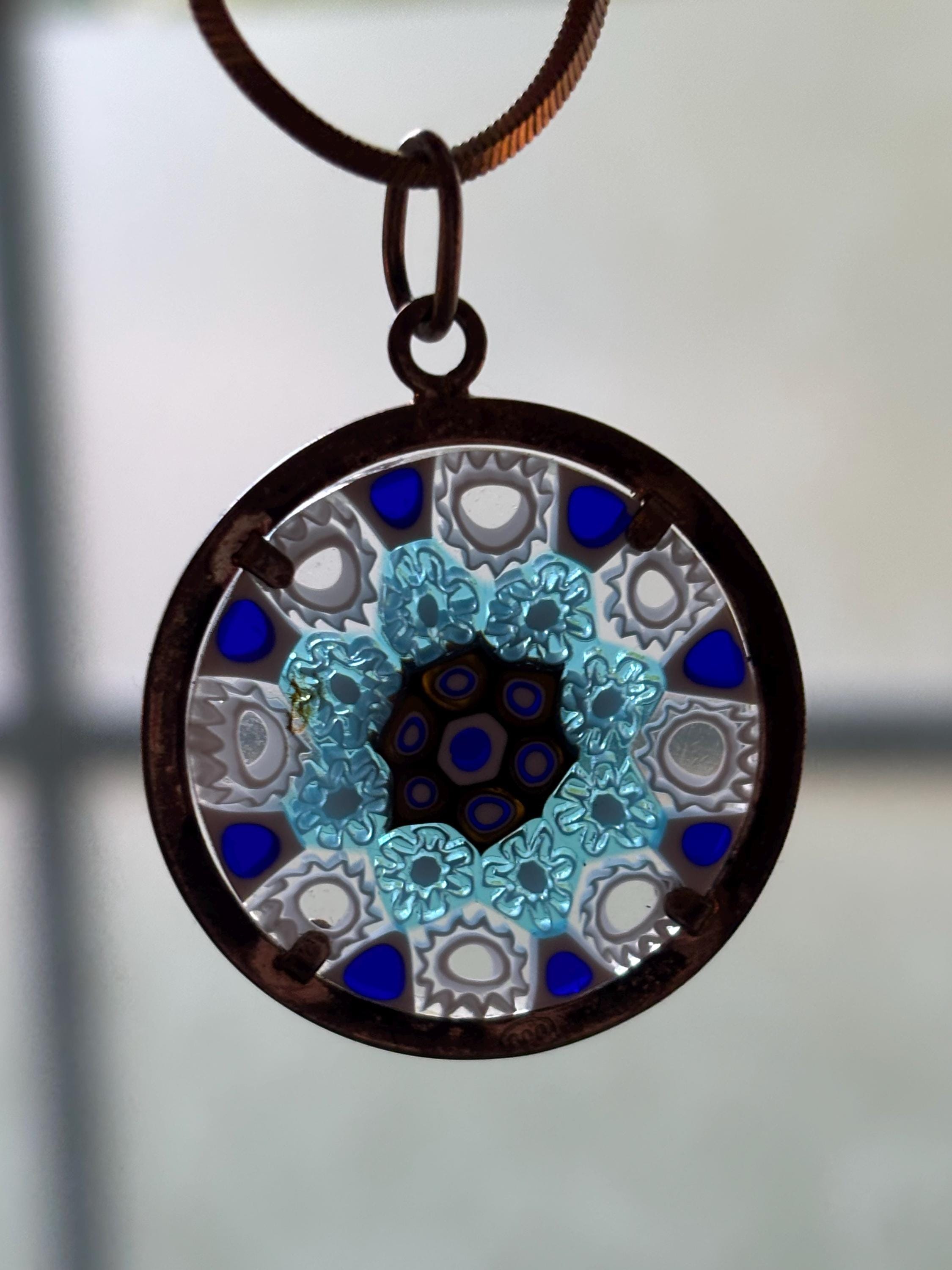This listing is for a gold tone box chain with a beautiful glass millefiori pendant. It looks like stained glass and is absolutely lovely. With several hues of blue and contrasting white and darker colors- its a standout piece. It's in really good condition and the clasp is in perfect working order. A very unique, pretty necklace! Chain length is 8" and pendant is almost 1" across.
