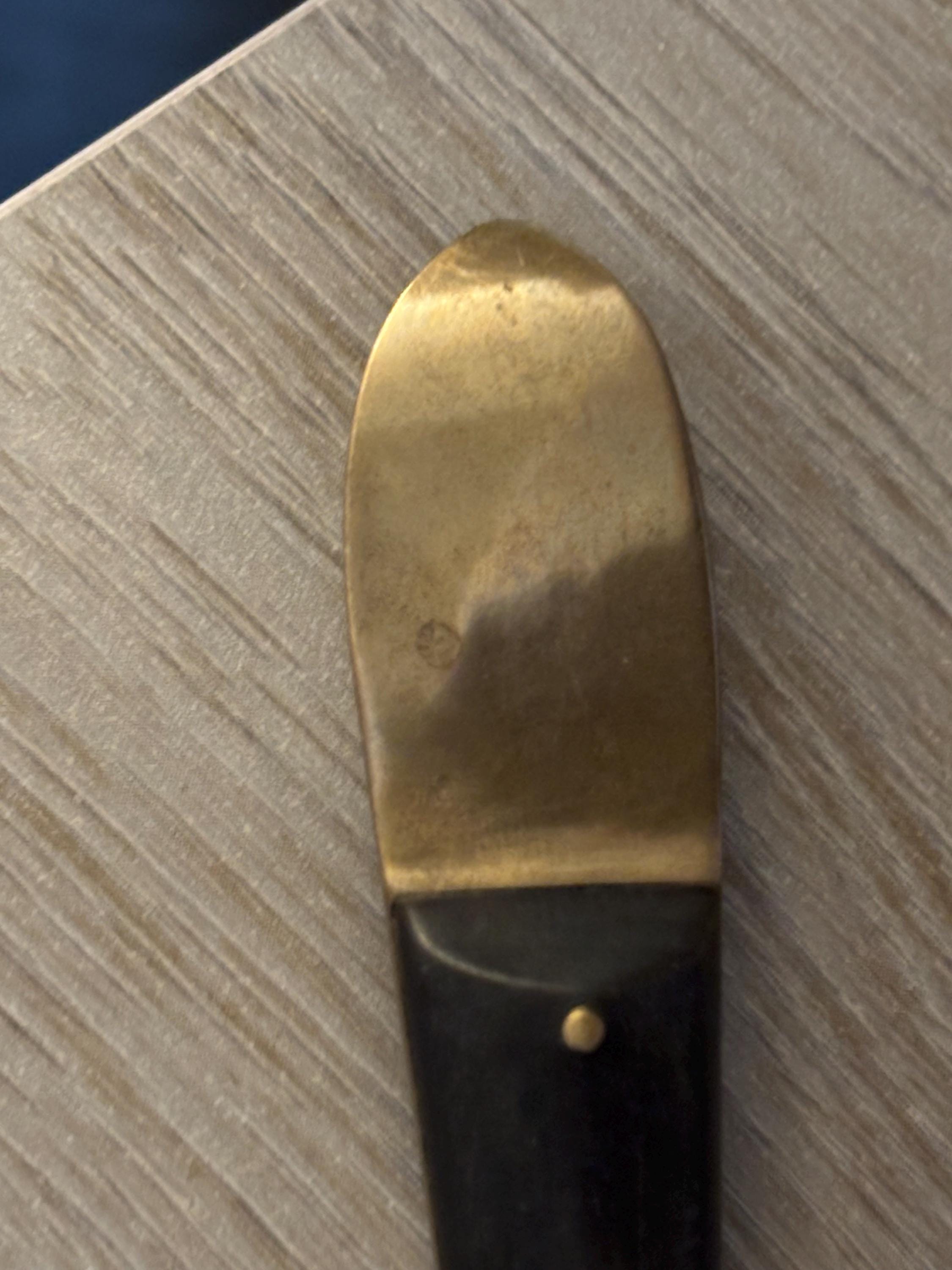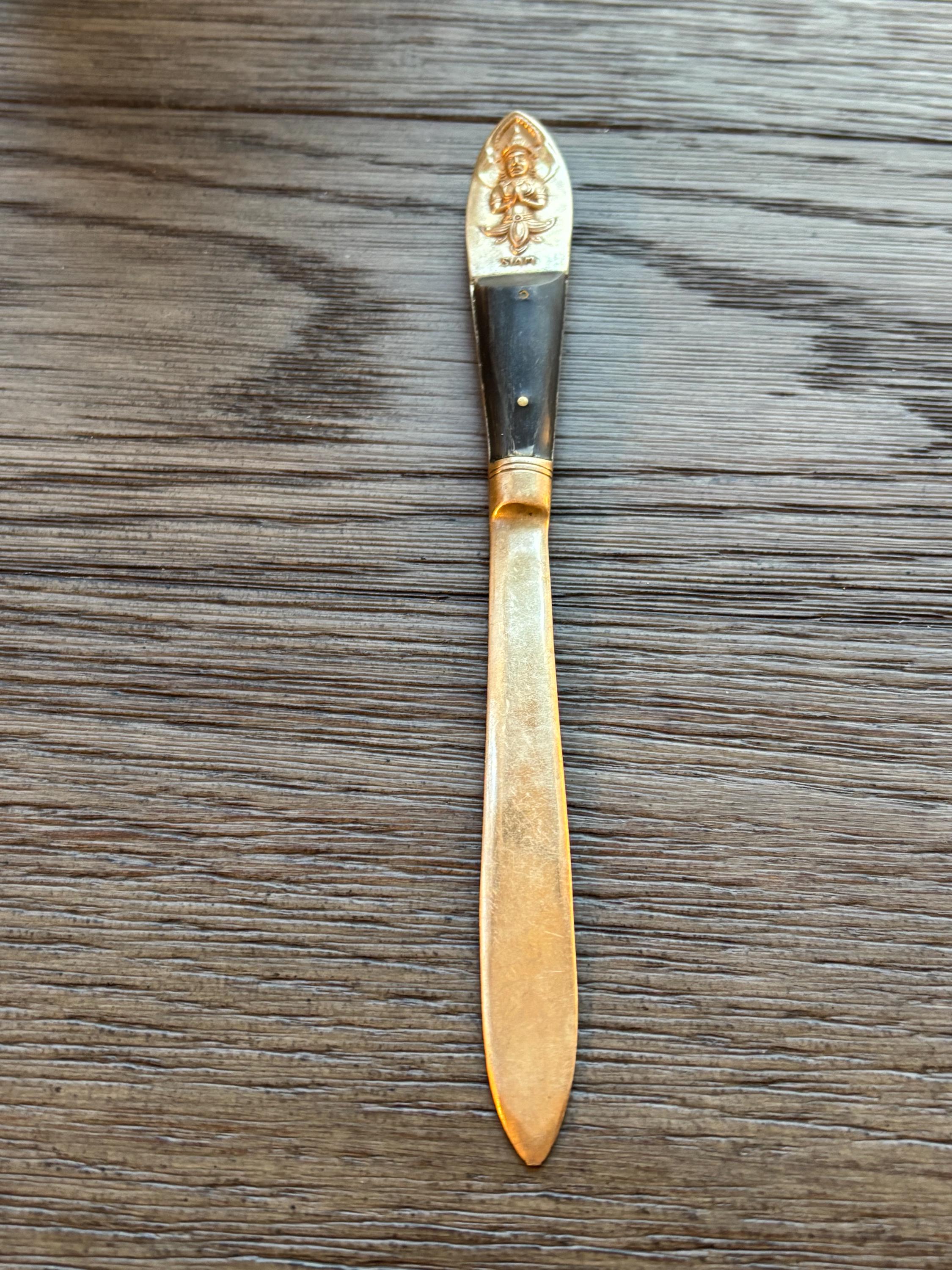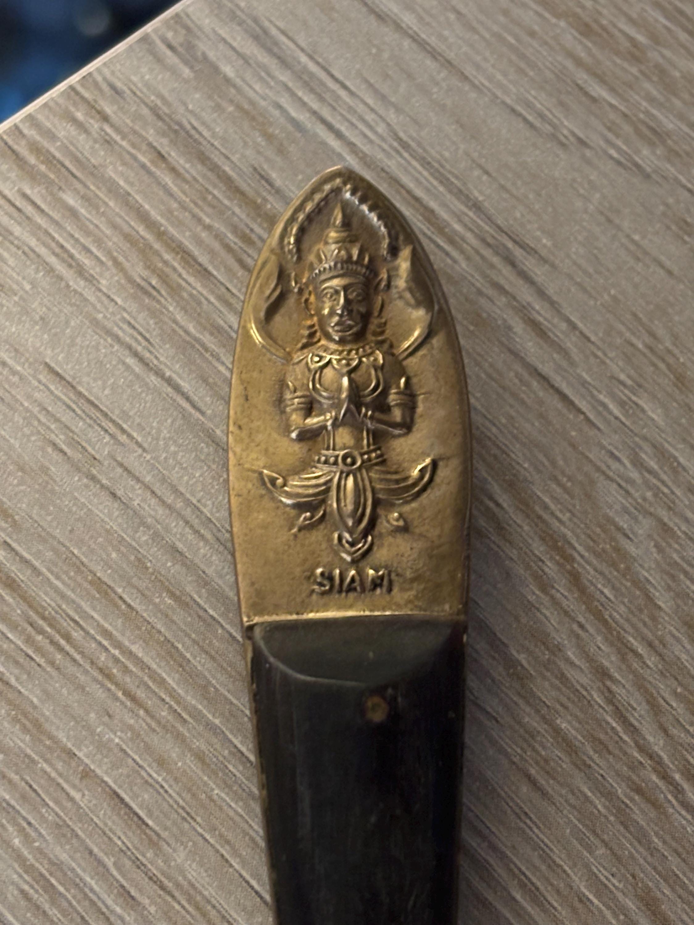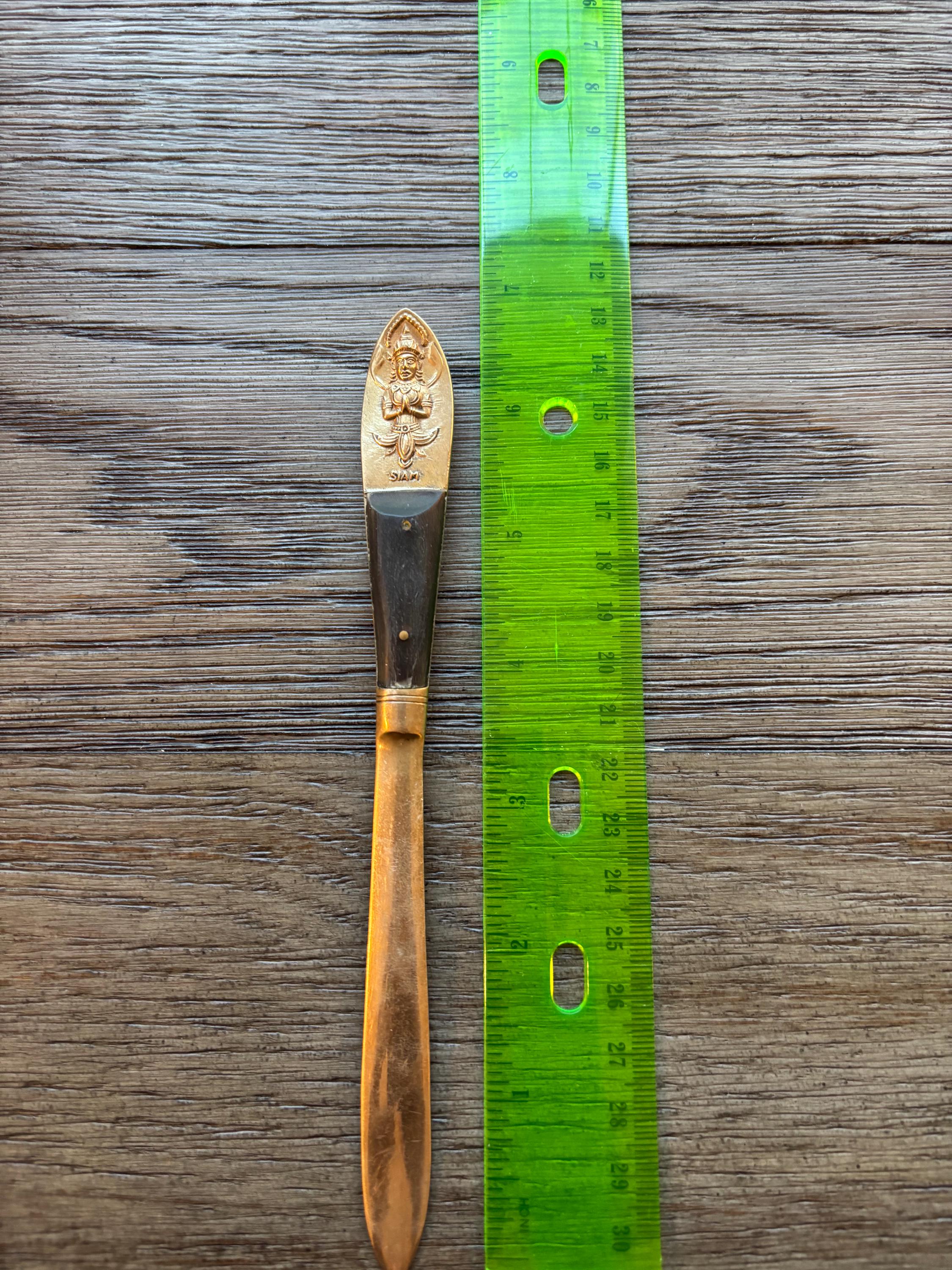 The item is a Mid Century brass letter opener from Siam. The top features a wooden handle and Buddha carved into the metal. Truly unique and a gorgeous addition to any collection or decor. The item displays wear consistent with age and use, but is in good condition. Buyer can polish it if desired. Sold as is.