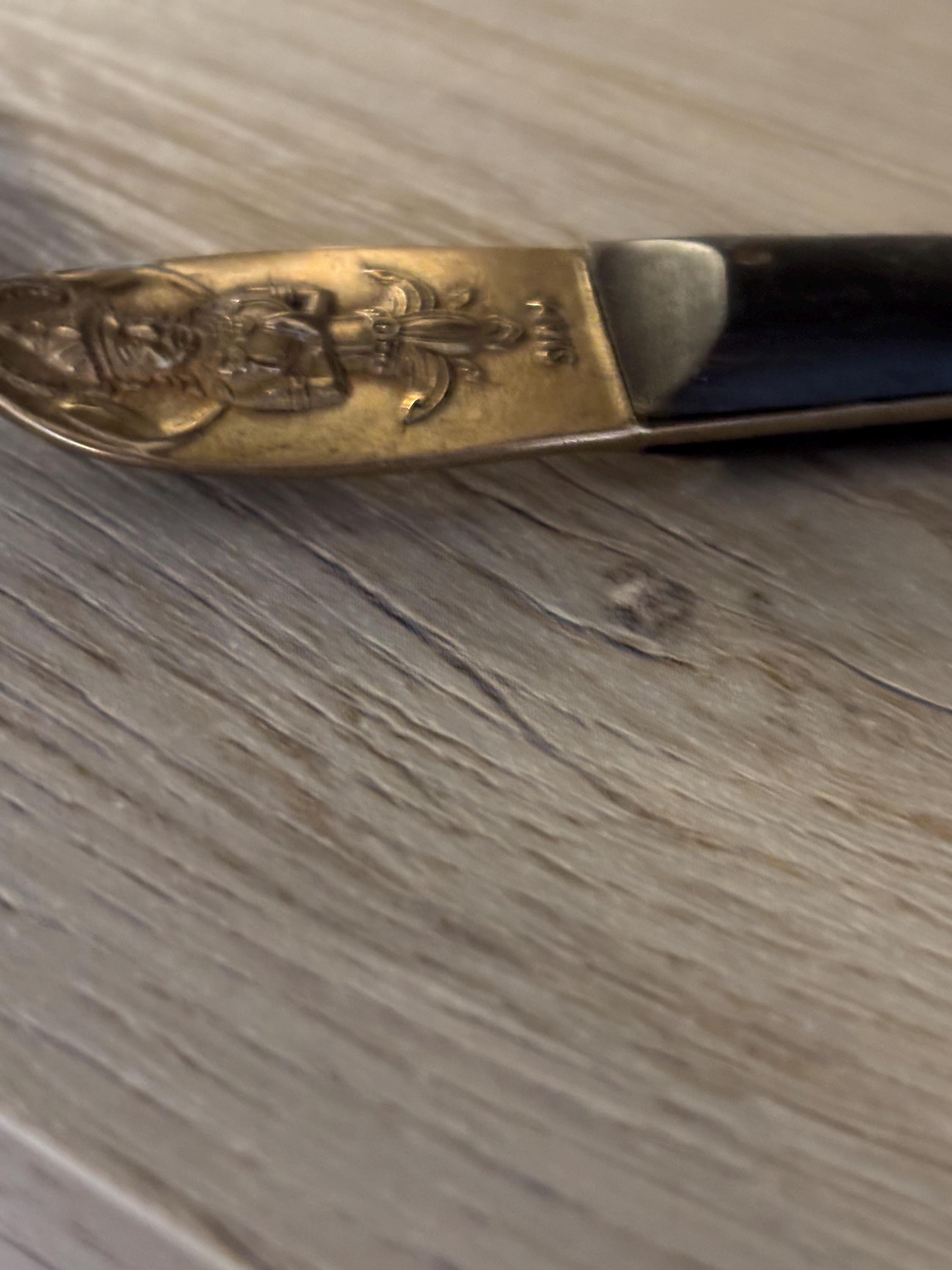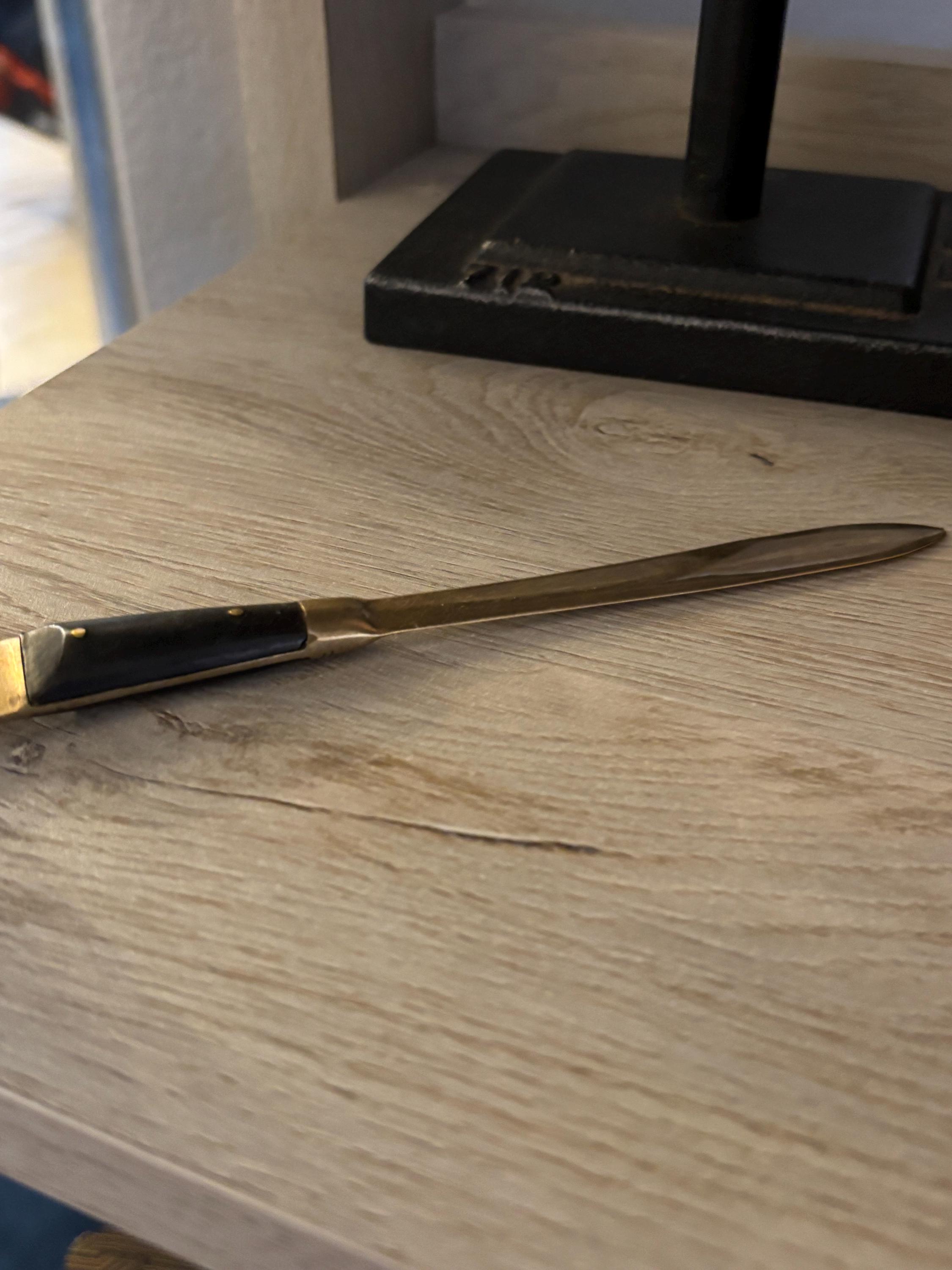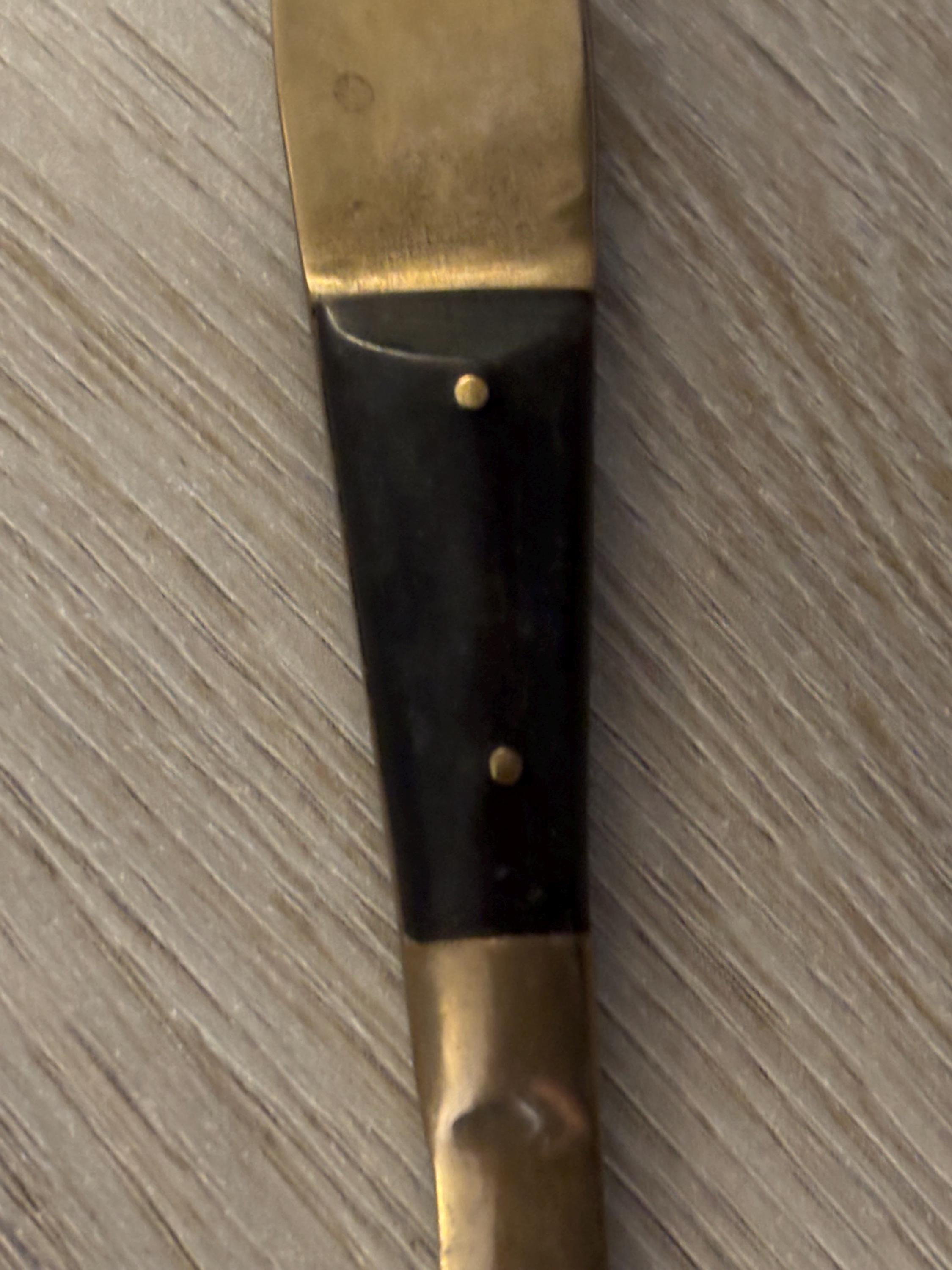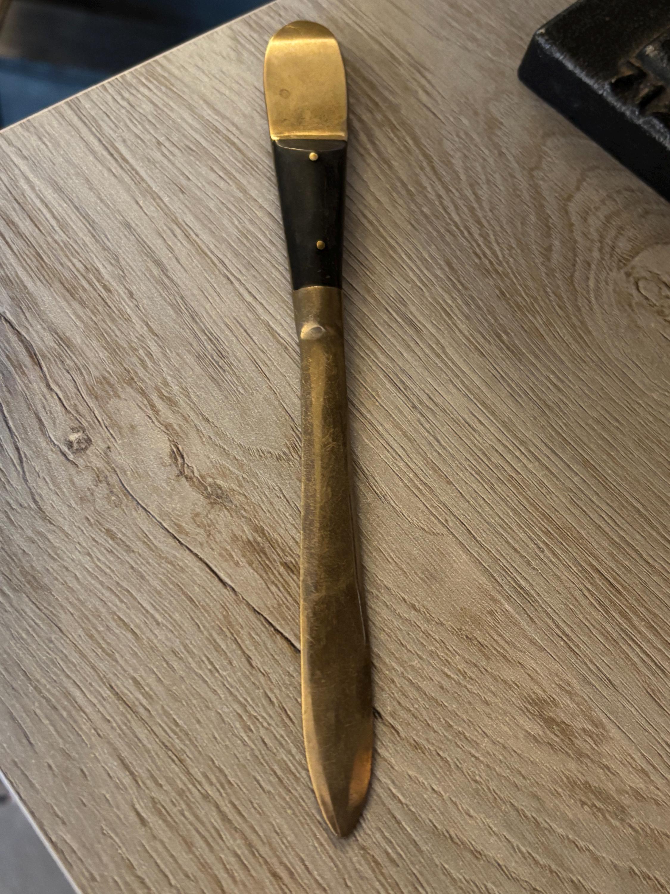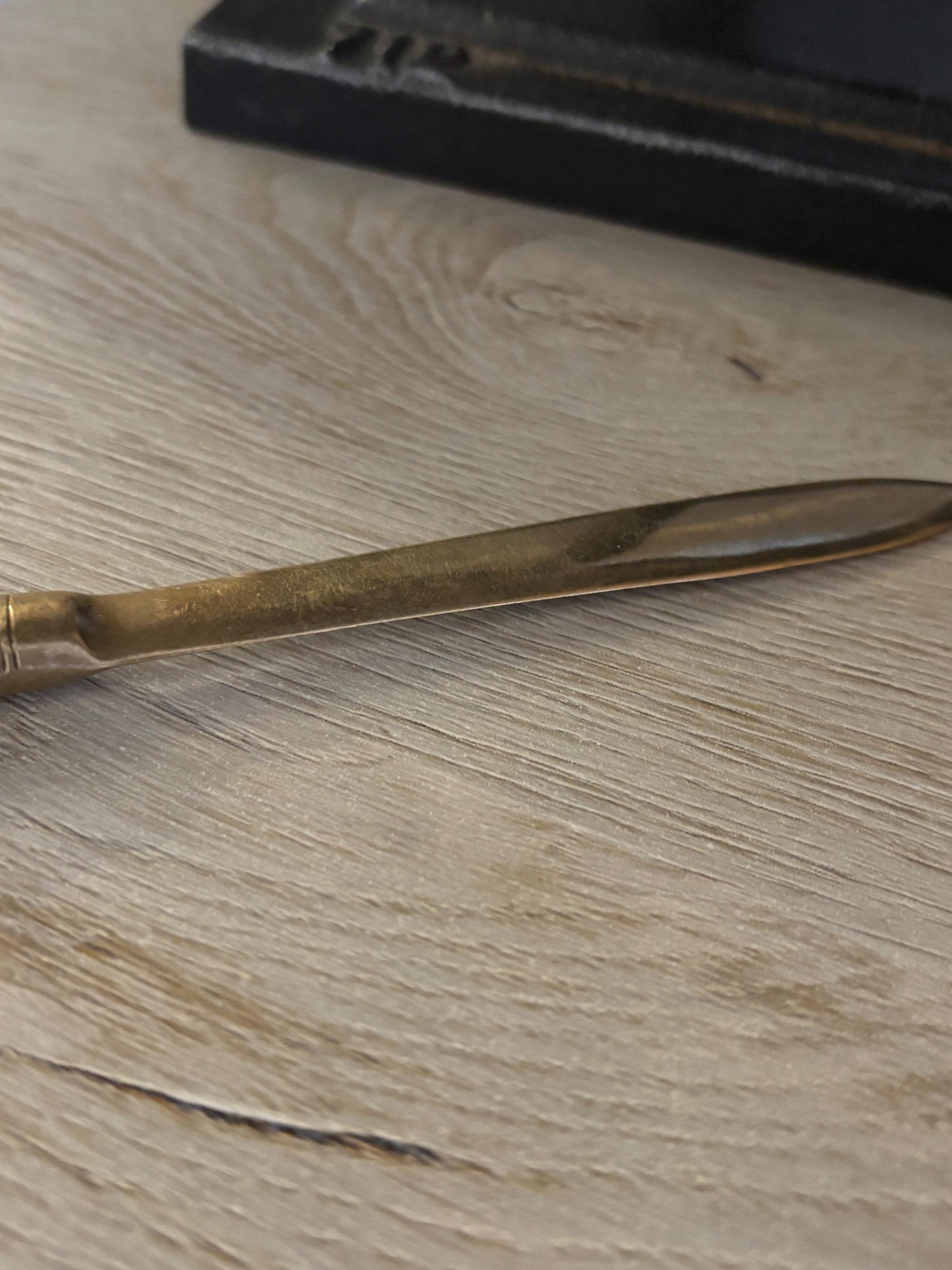 The item is a Mid Century brass letter opener from Siam. The top features a wooden handle and Buddha carved into the metal. Truly unique and a gorgeous addition to any collection or decor. The item displays wear consistent with age and use, but is in good condition. Buyer can polish it if desired. Sold as is.
