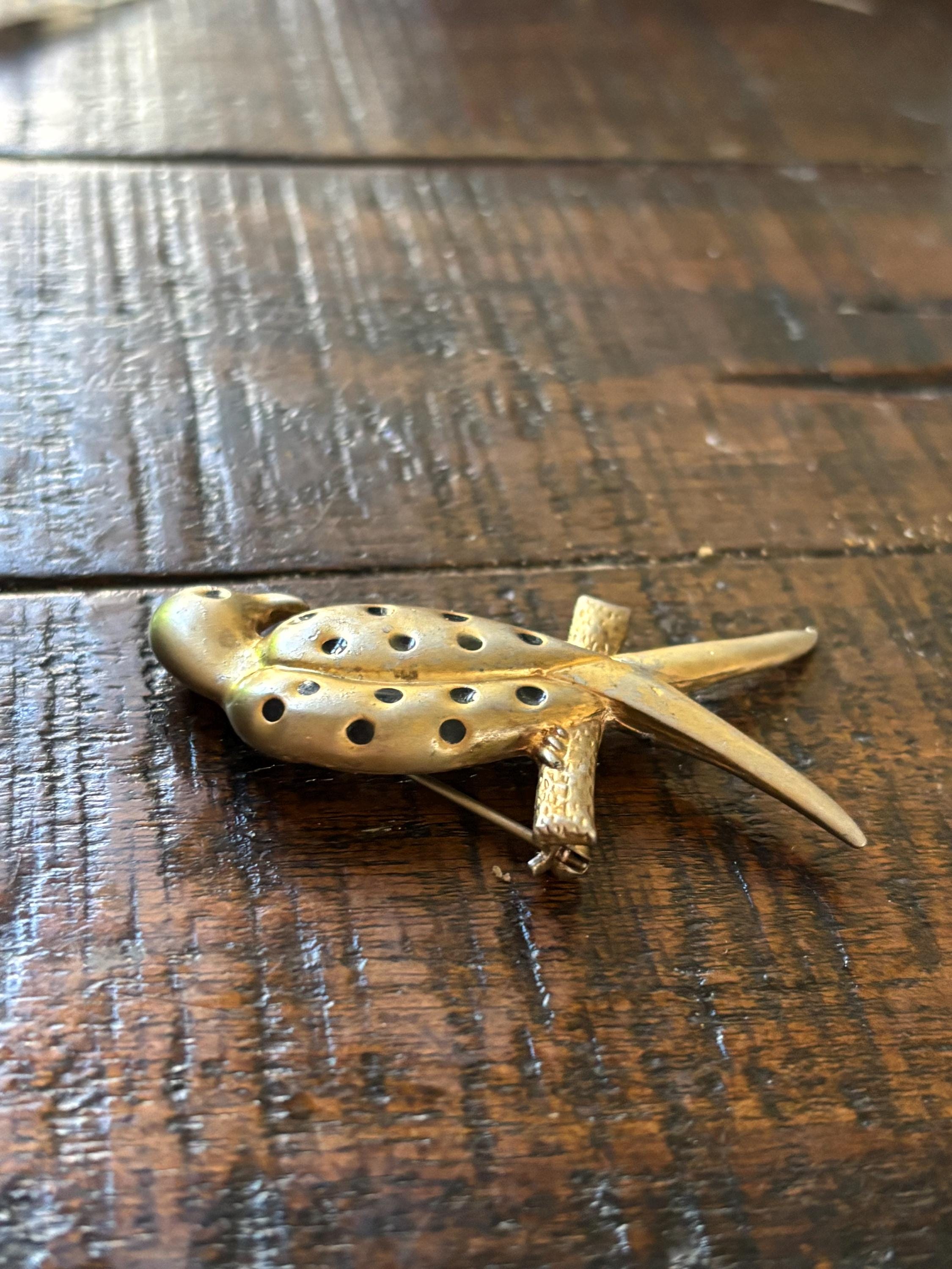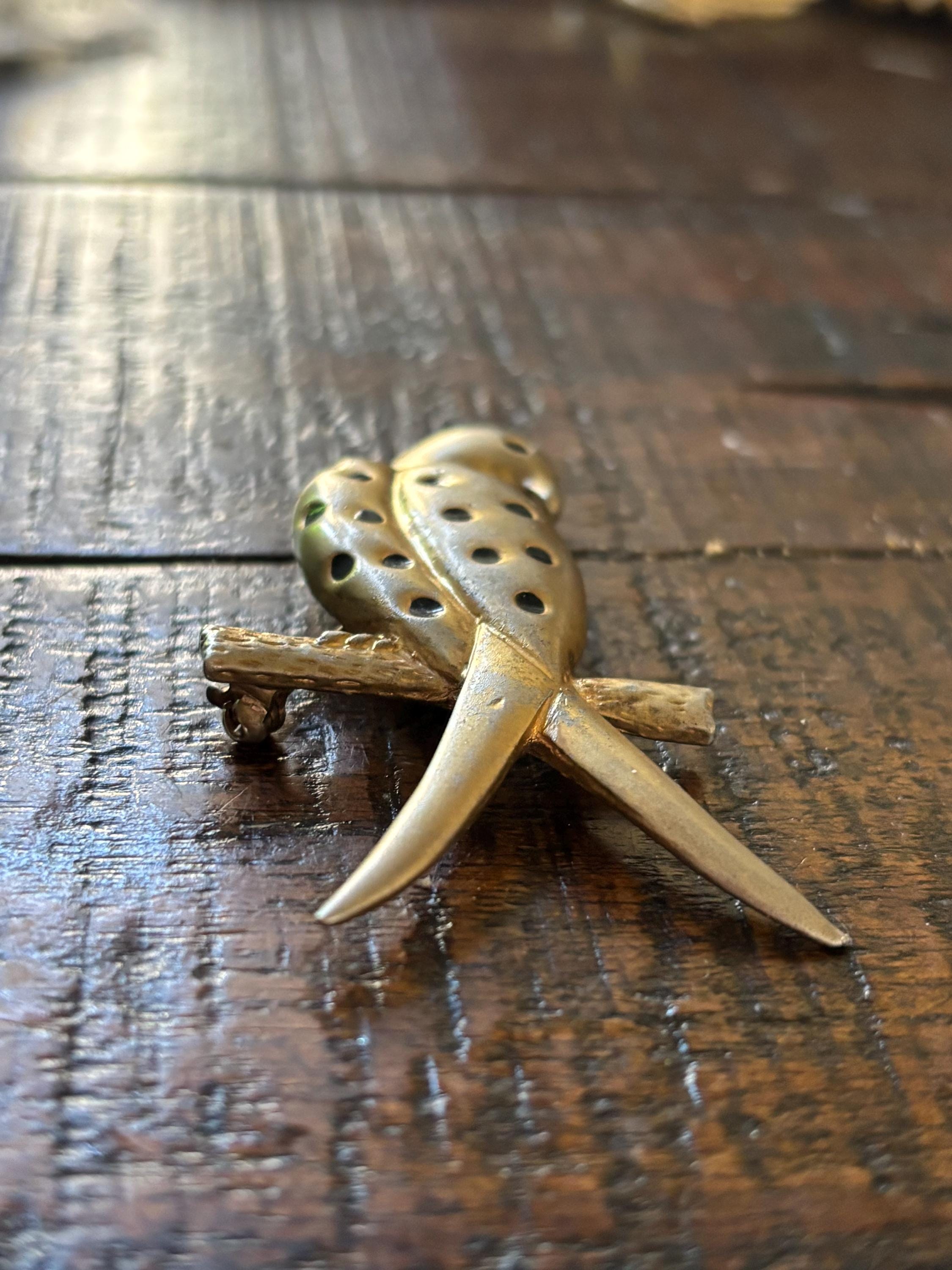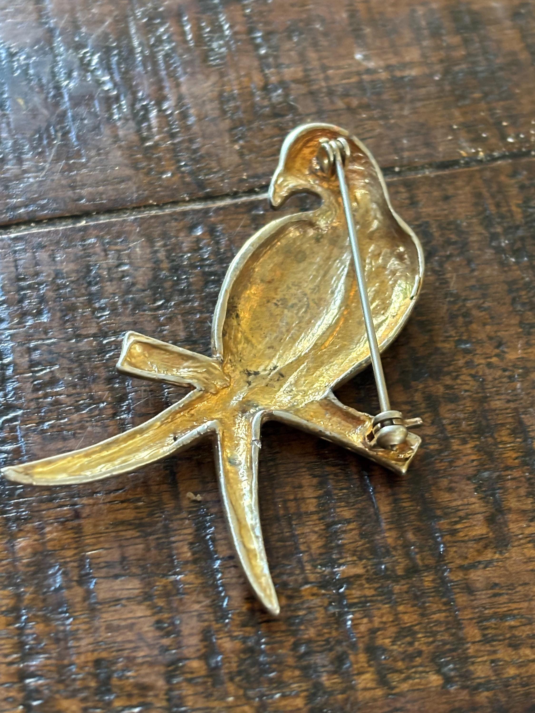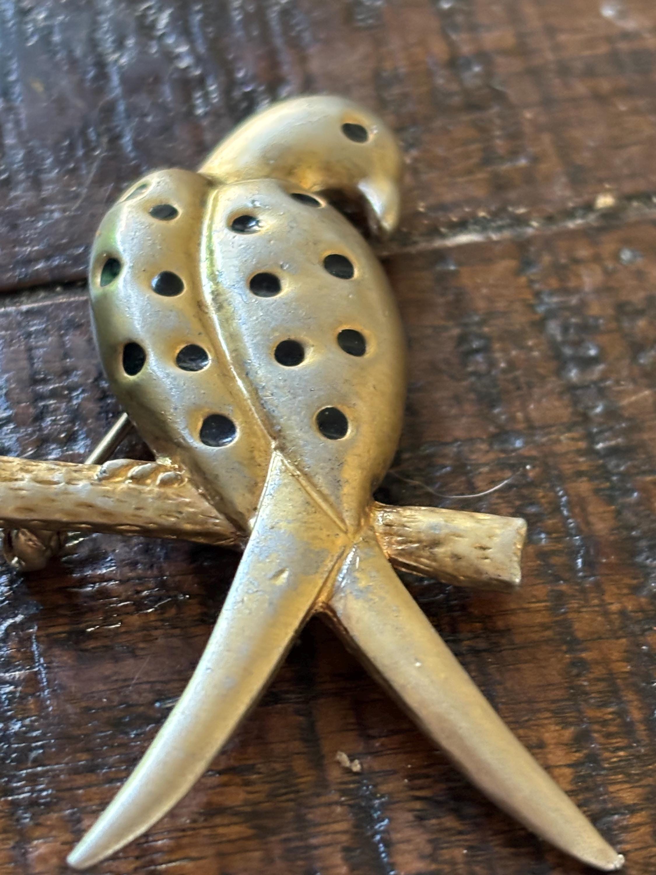 This birdie is super cute. The brooch is about 2-1/4" tall and roughly 3/4" at largest width. It is very detailed with indents as spots. Absolutely adorable. The bird does have some wear, particularly by his tail feathers, but don't we all. Definitely a sweet, cute addition to a jewelry collection.