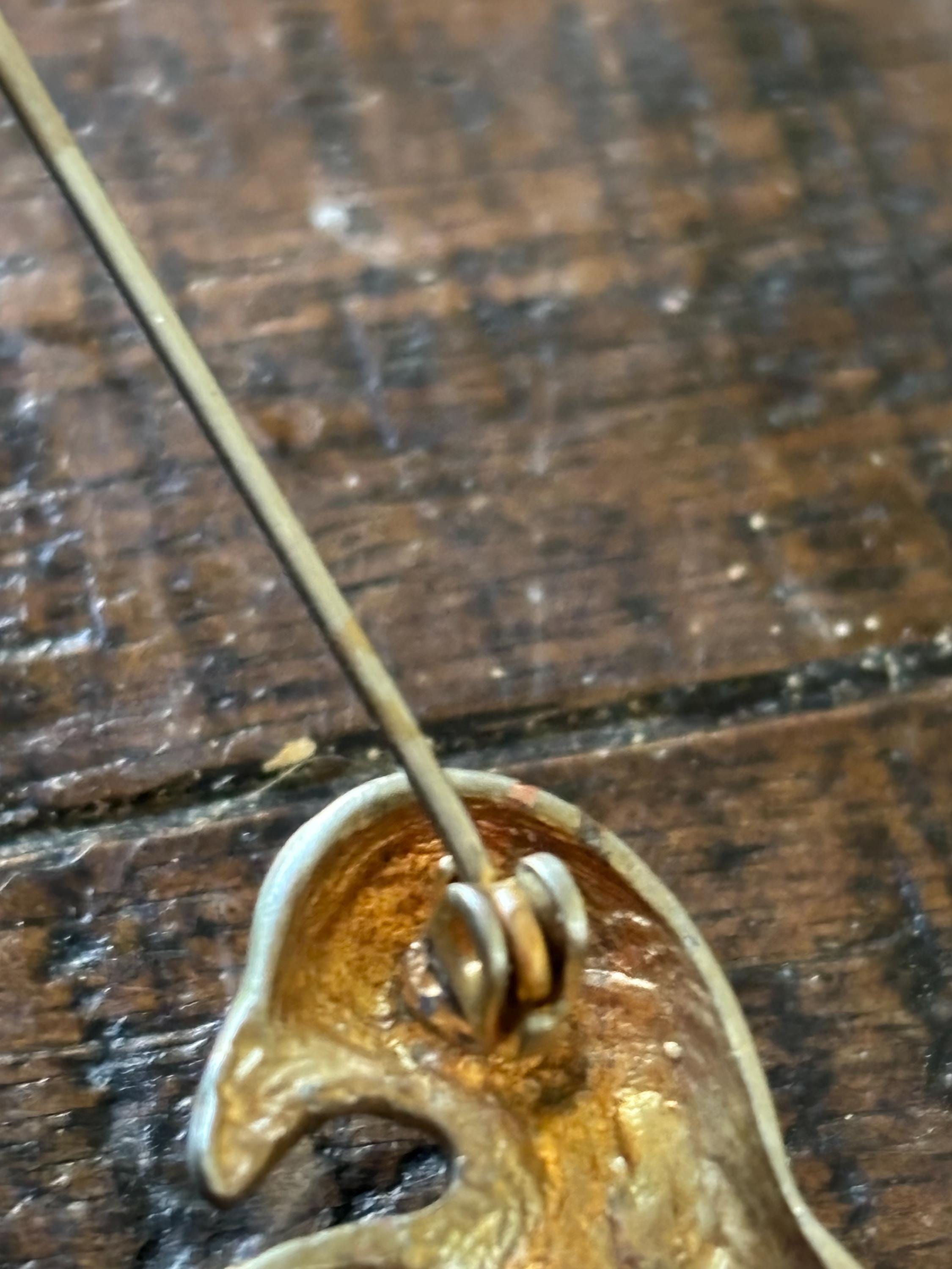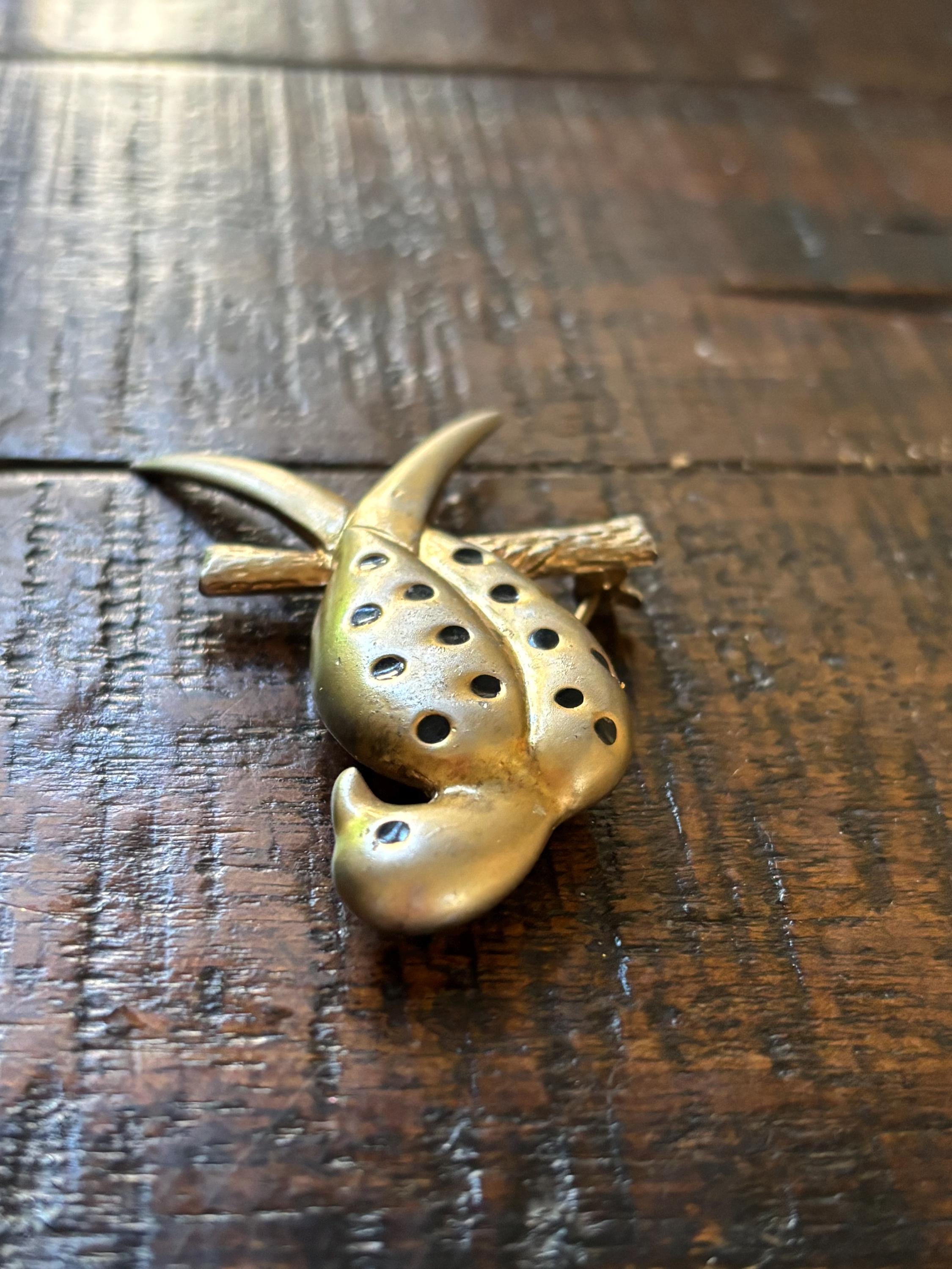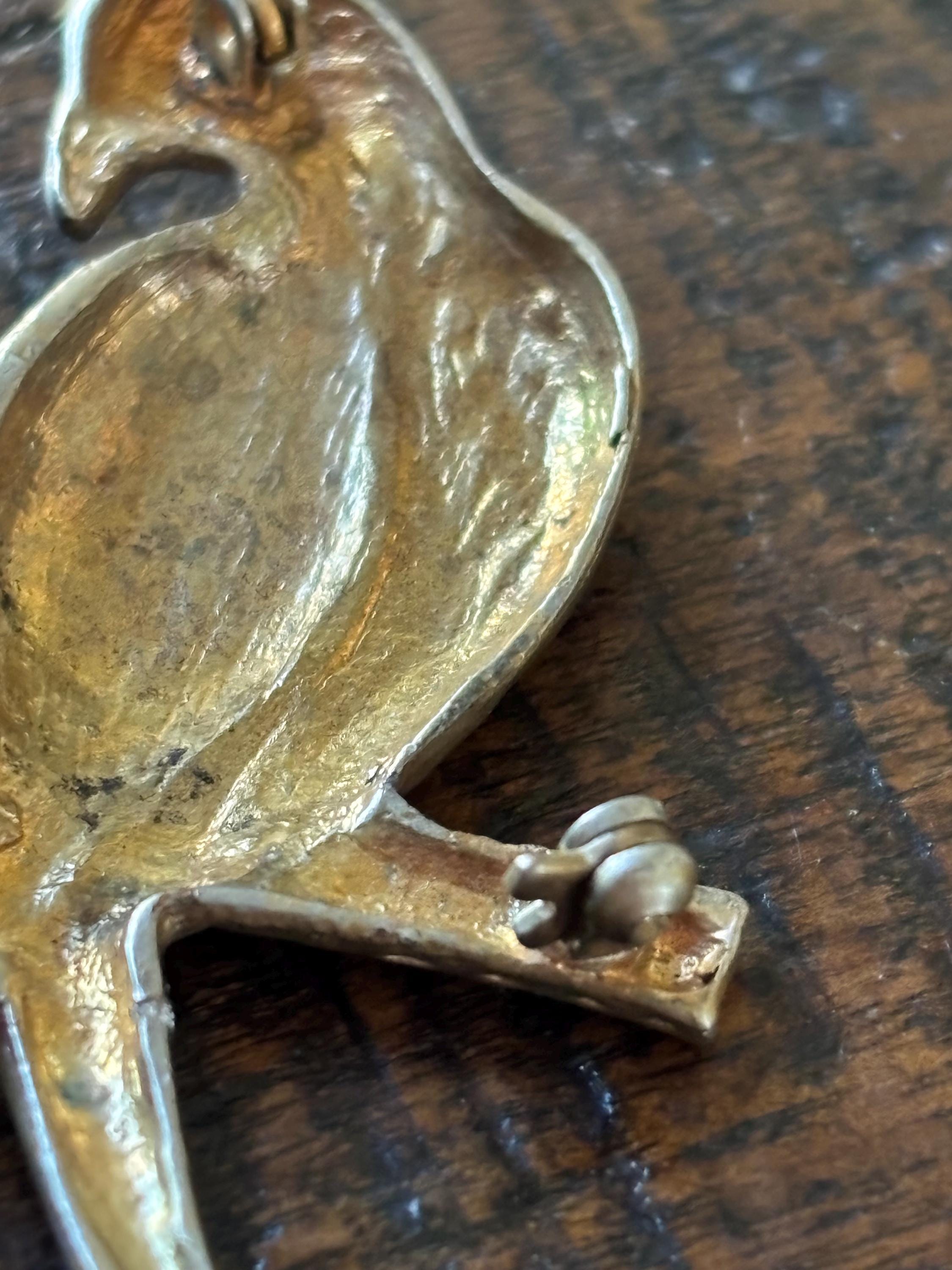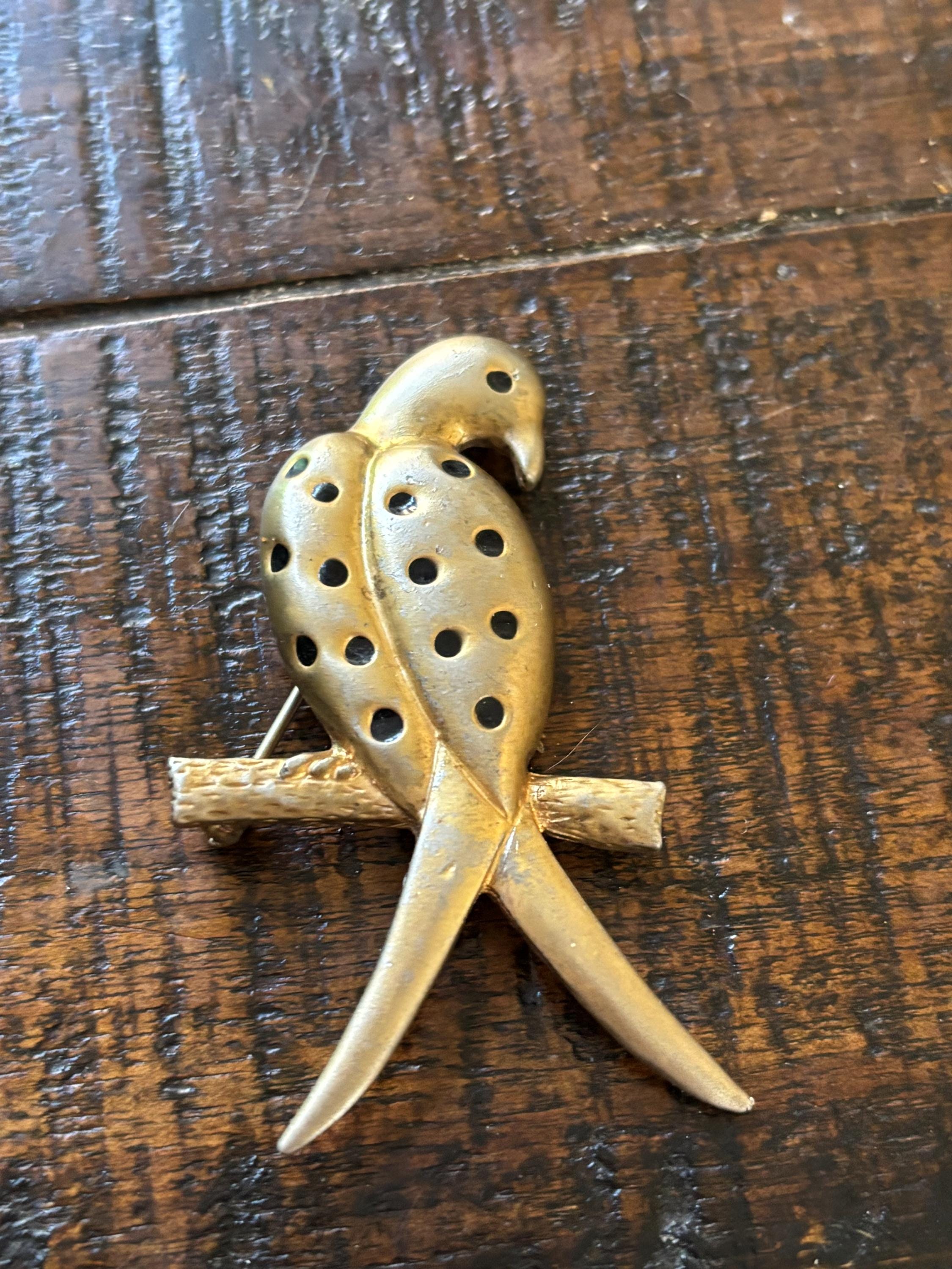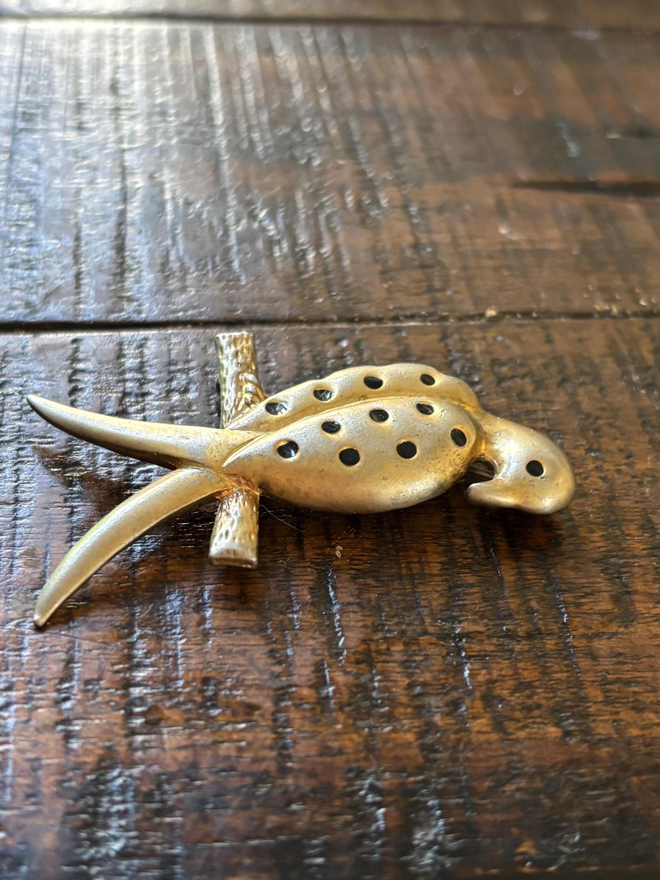 This birdie is super cute. The brooch is about 2-1/4" tall and roughly 3/4" at largest width. It is very detailed with indents as spots. Absolutely adorable. The bird does have some wear, particularly by his tail feathers, but don't we all. Definitely a sweet, cute addition to a jewelry collection.
