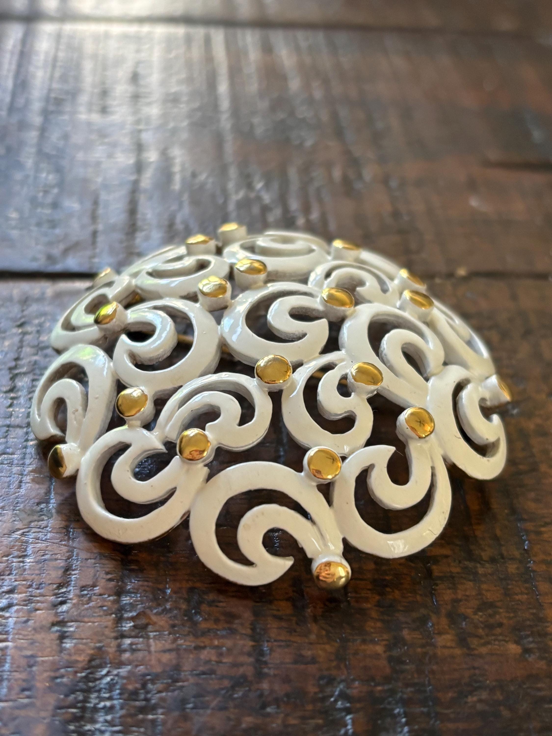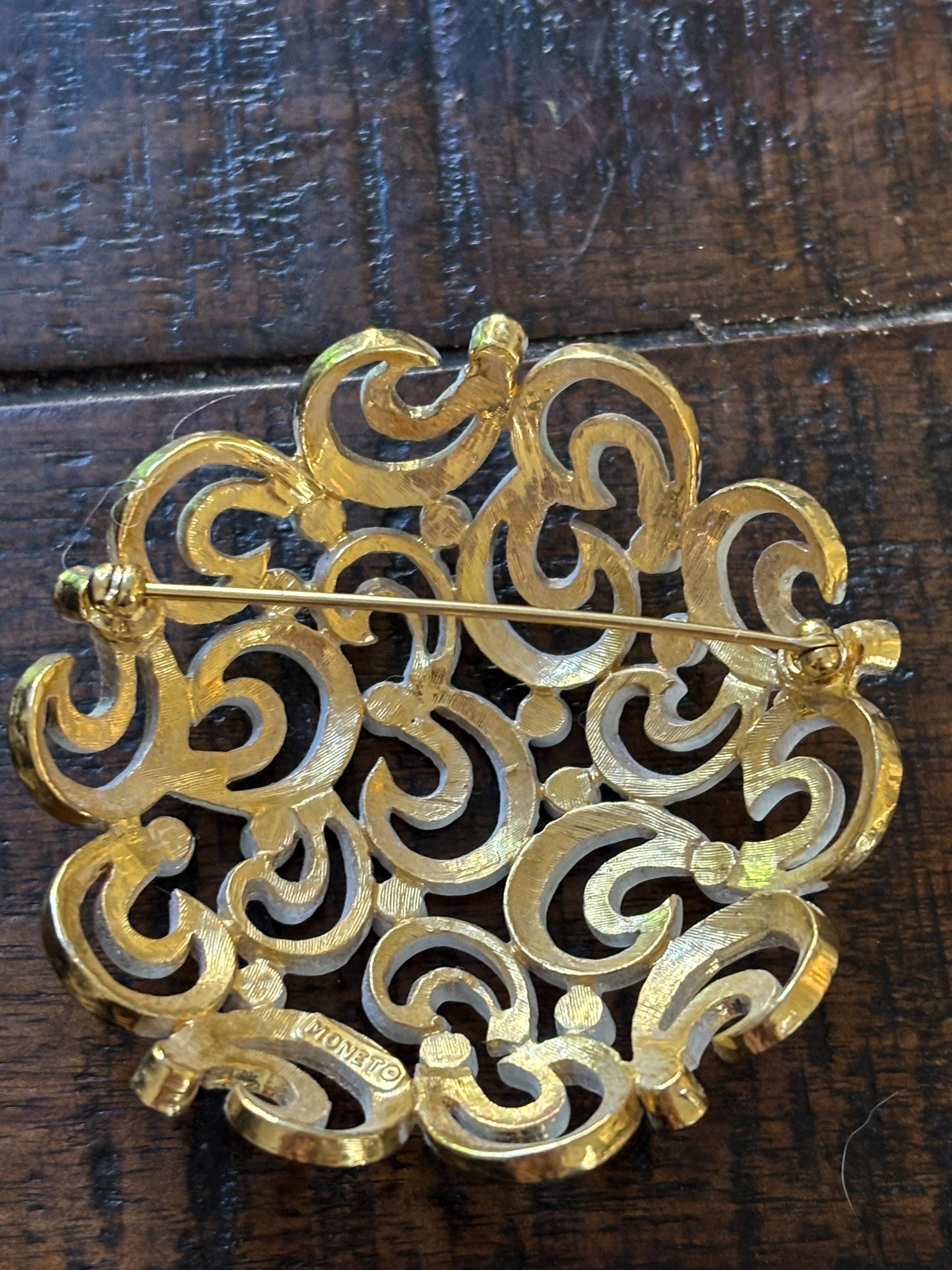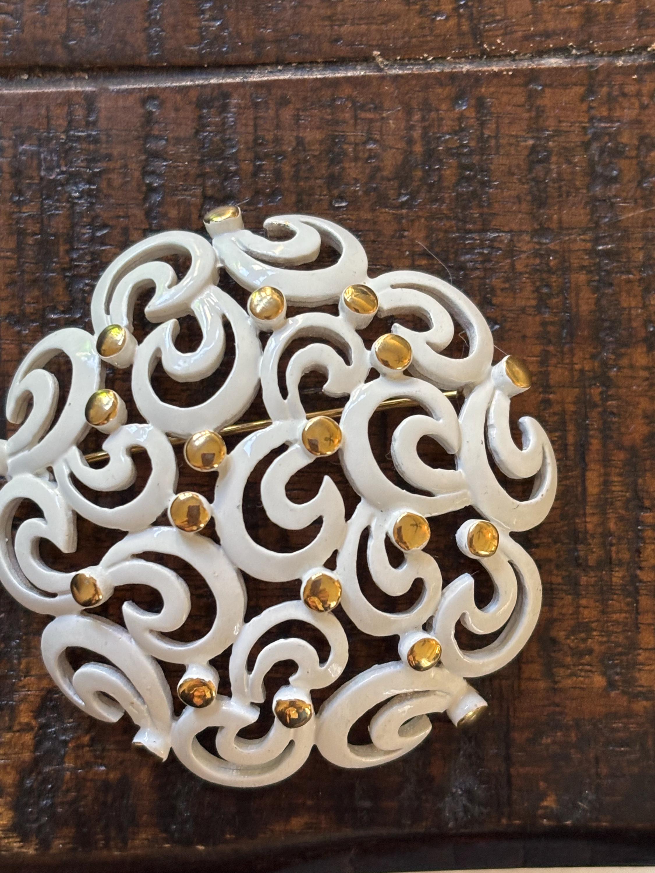 This is a stamped Monet vintage brooch with white and gold tone accents throughout. It measures 2.25" in diameter and is in great condition. The clasp is in working order. This is a beautiful piece to add to any collection! Very little to no signs of wear. Very pretty fashion statement.