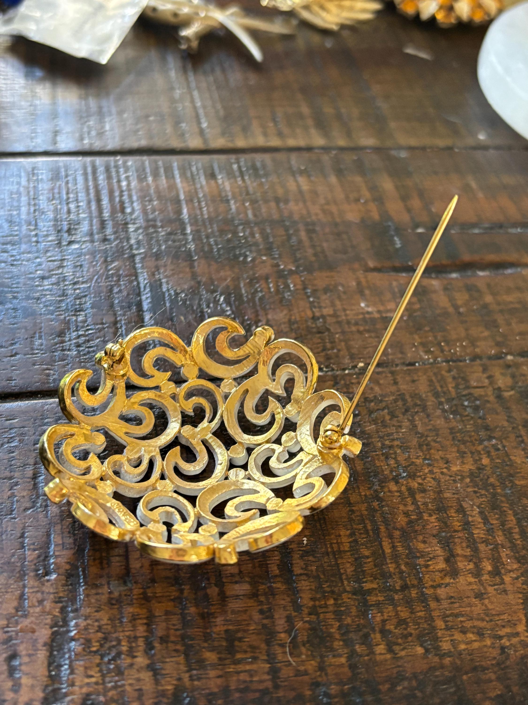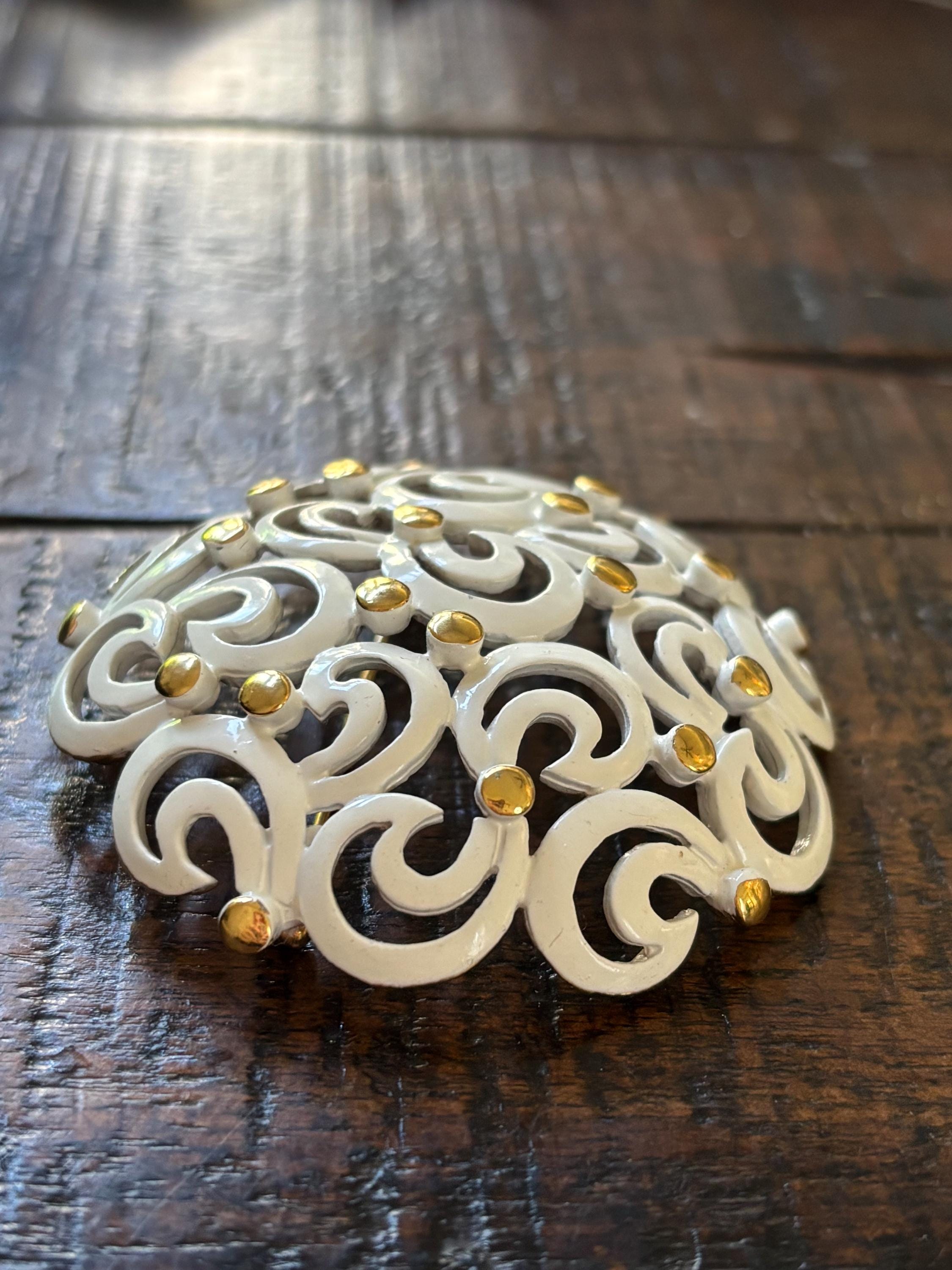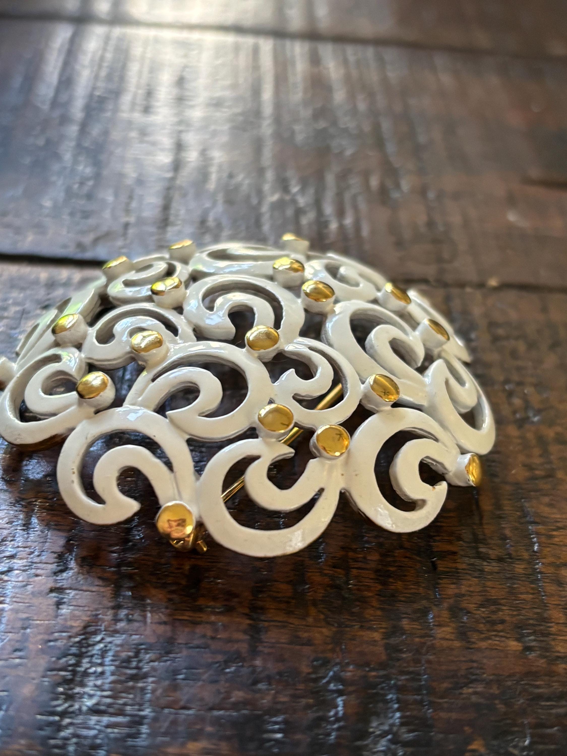 This is a stamped Monet vintage brooch with white and gold tone accents throughout. It measures 2.25" in diameter and is in great condition. The clasp is in working order. This is a beautiful piece to add to any collection! Very little to no signs of wear. Very pretty fashion statement.