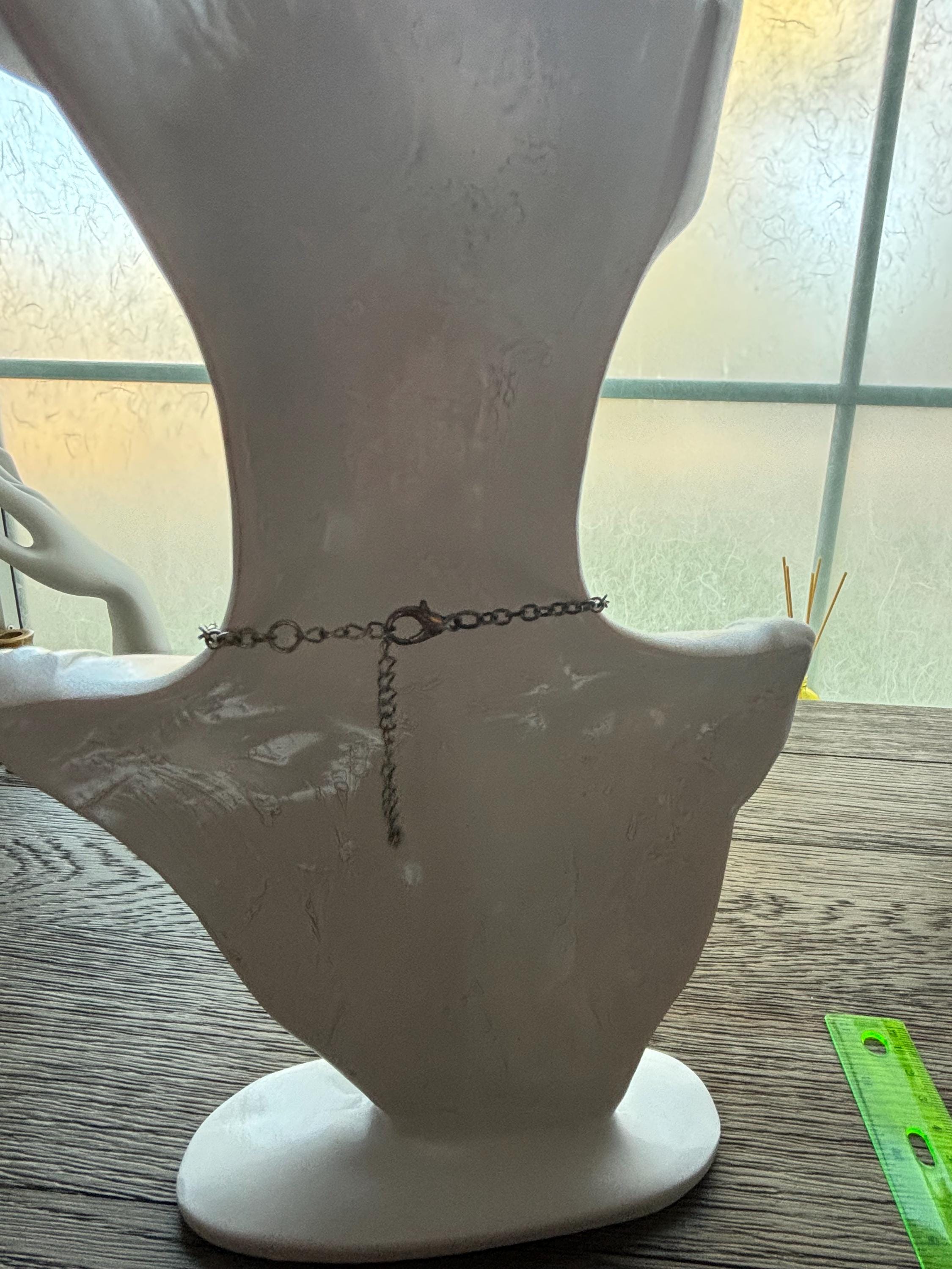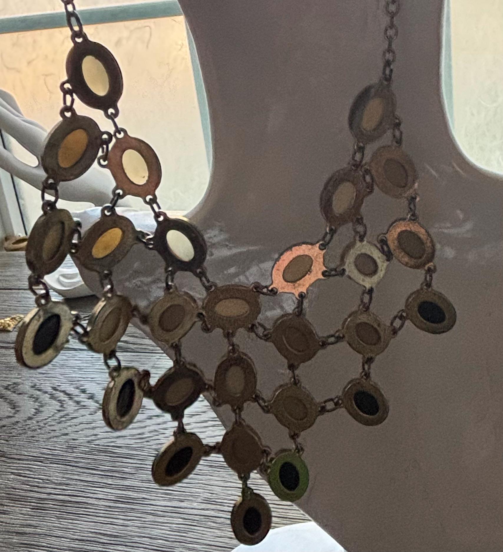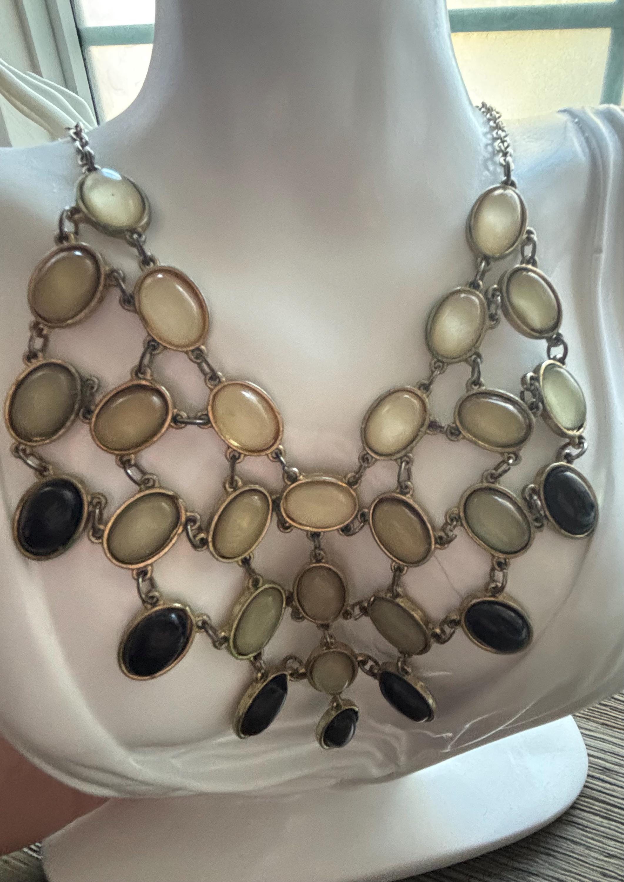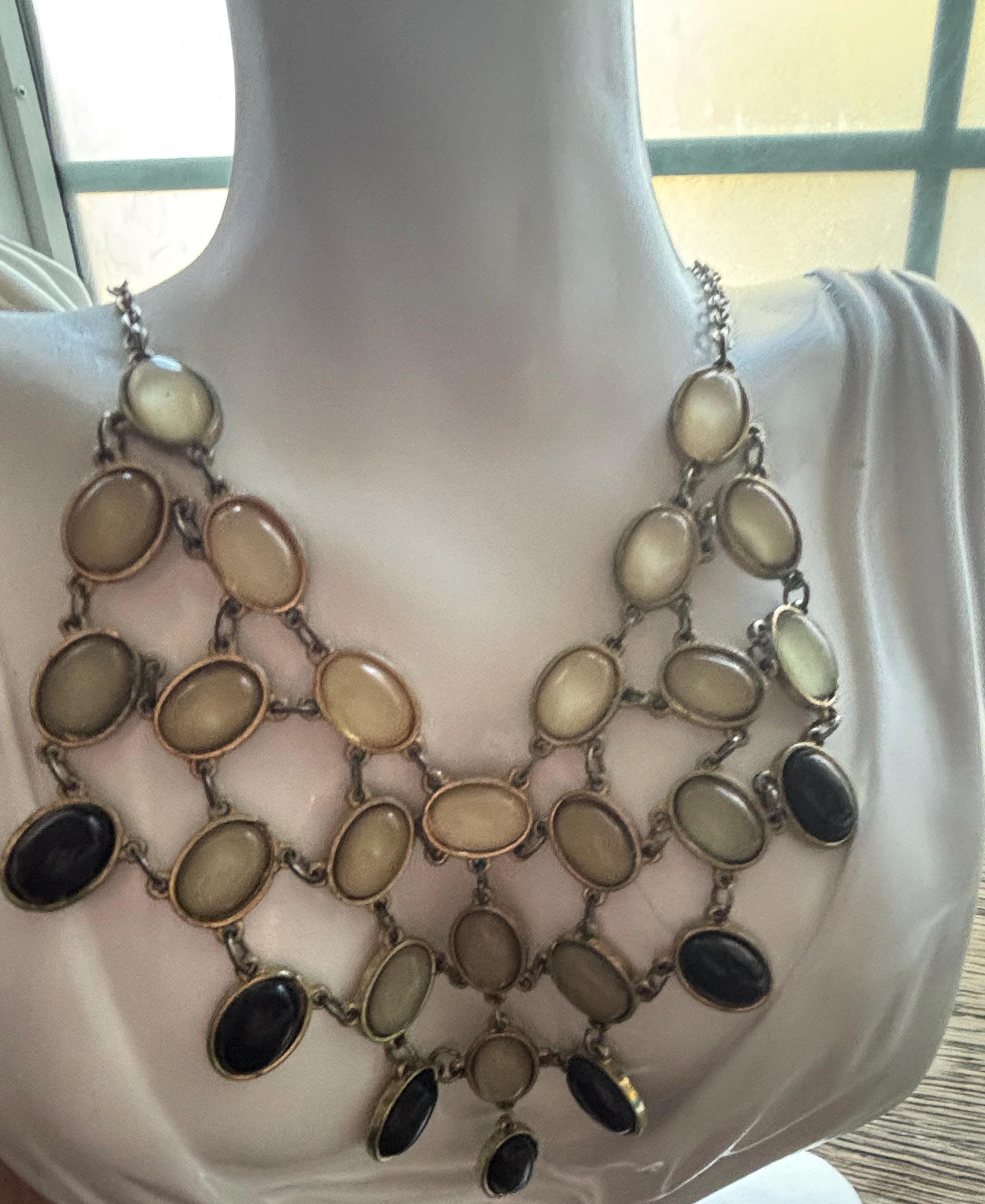 This listing is for a bib style necklace. It's a statement, but also elegant at the same time. It features soft toned semi opaque beads, terminating with solid black beads. It's in great condition and very pretty. The clasp is in working order and the chain is silver toned. Very pretty!! Wear is consistent with age and use. Sold as is.