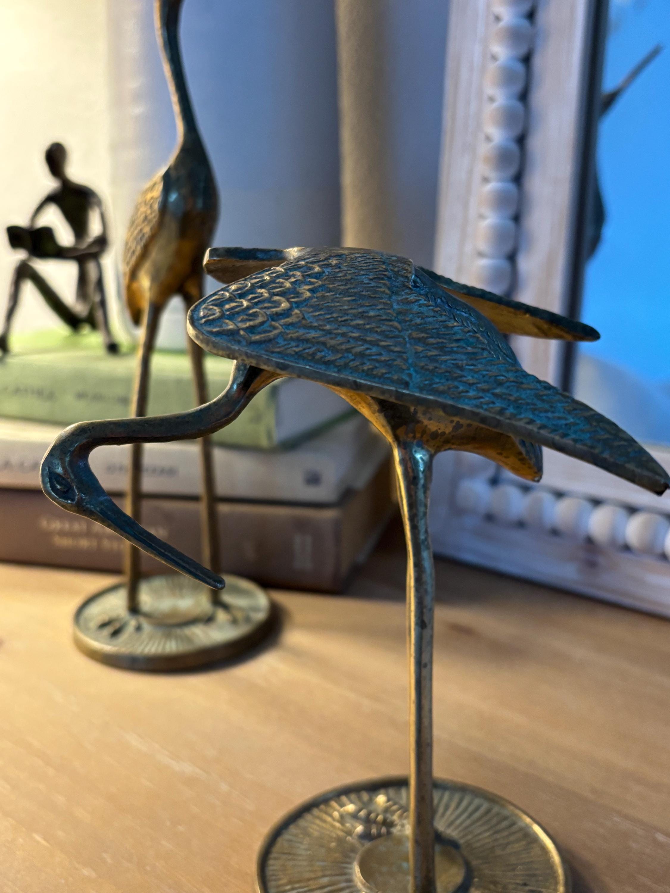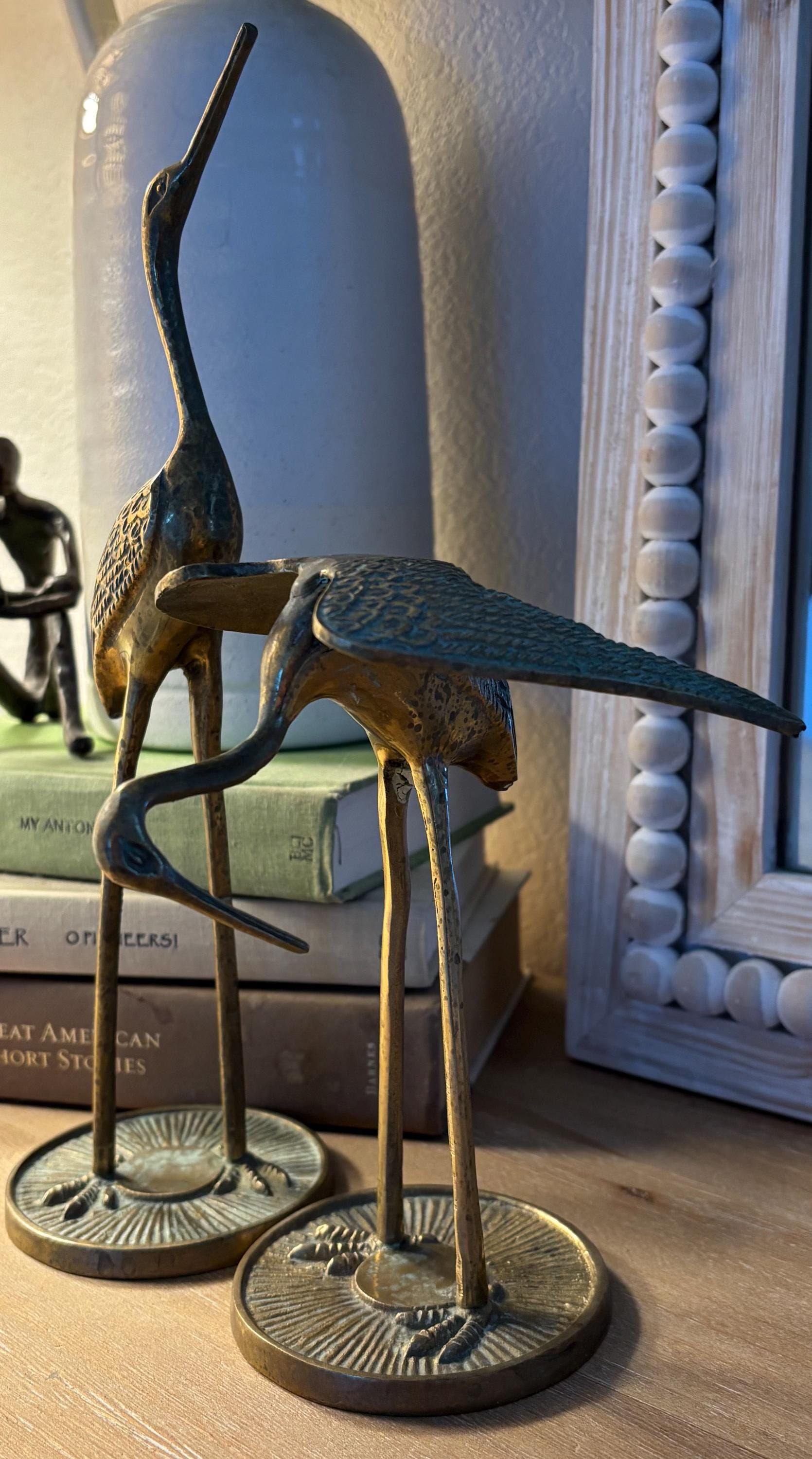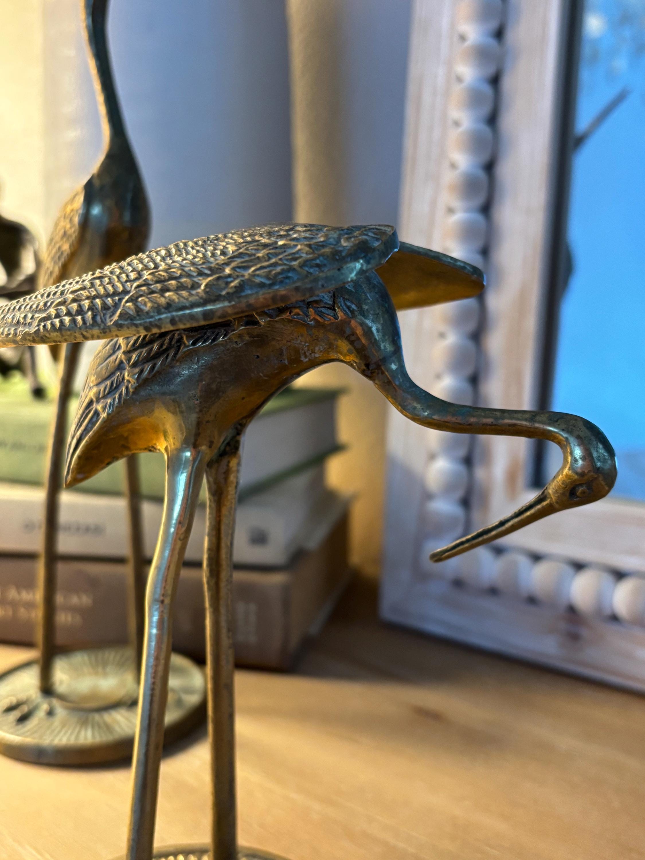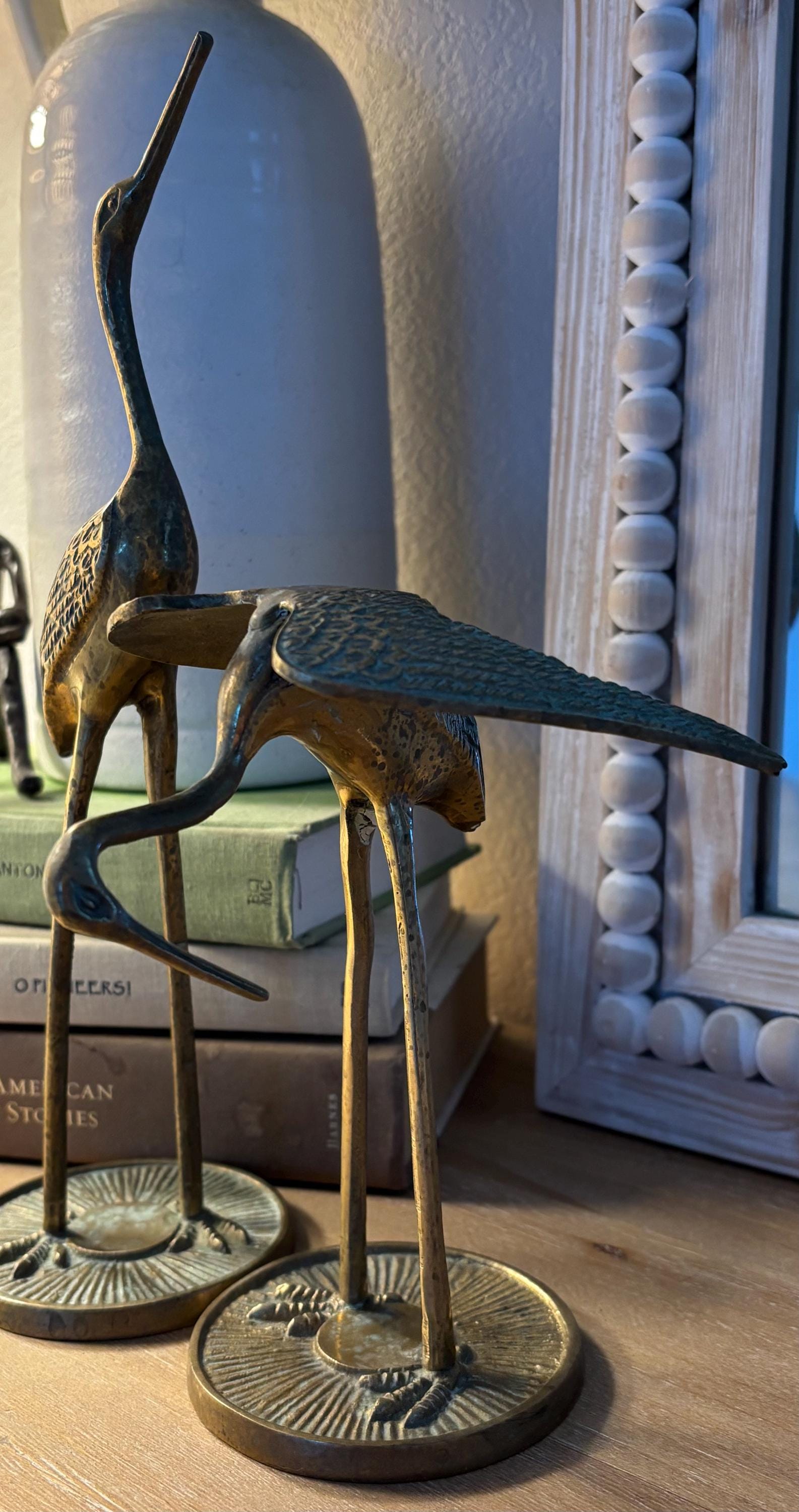 This a beautiful set of two brass vintage crane sculptures. Dating back to Mid Century, they have slight signs of wear and beginnings of patina. They have not been polished, but they still glow wonderfully in the light. I will eave polishing up the buyer in case the aged look is desired. These are elegant and quite sophisticated. Perfect for any decor!