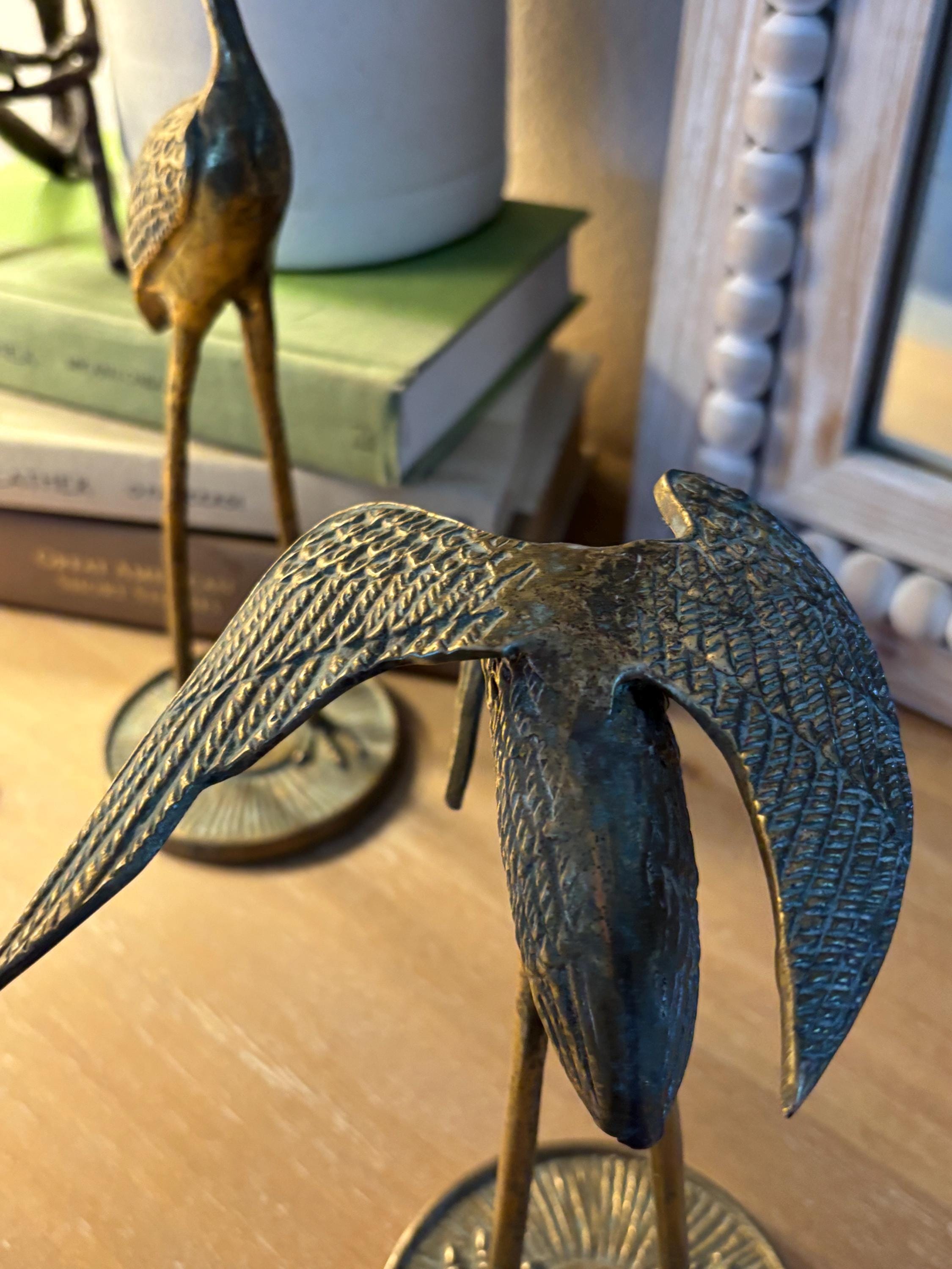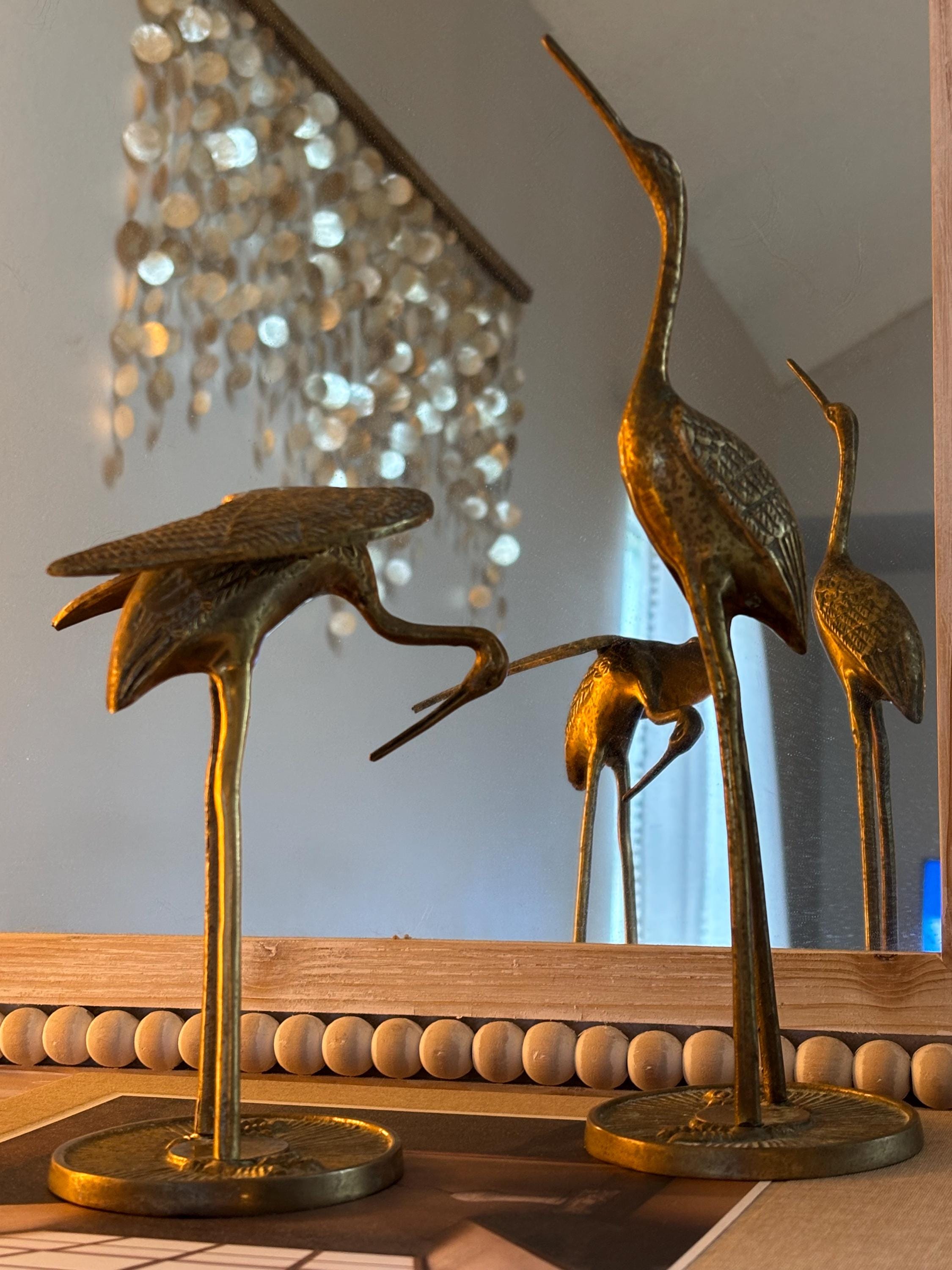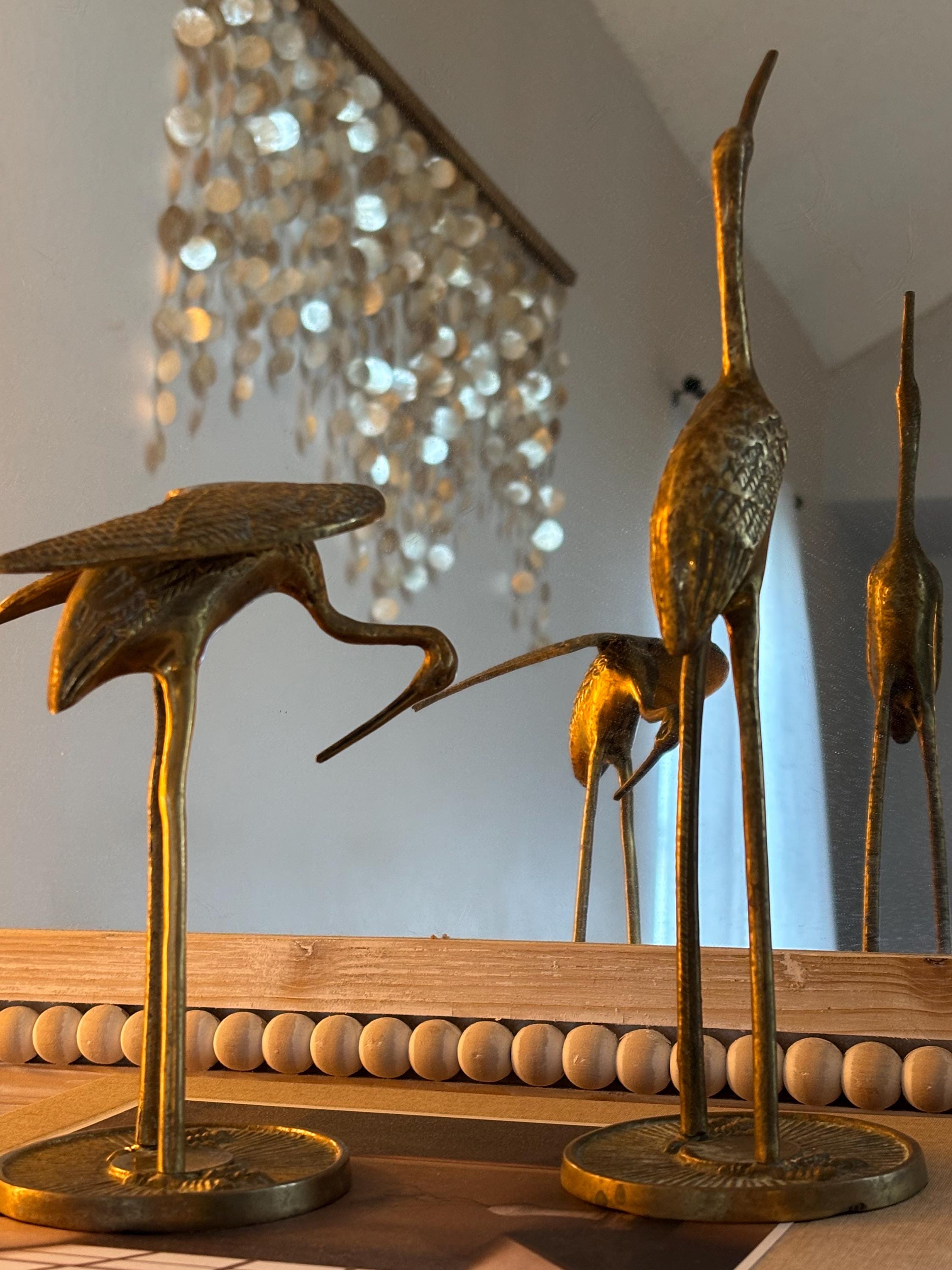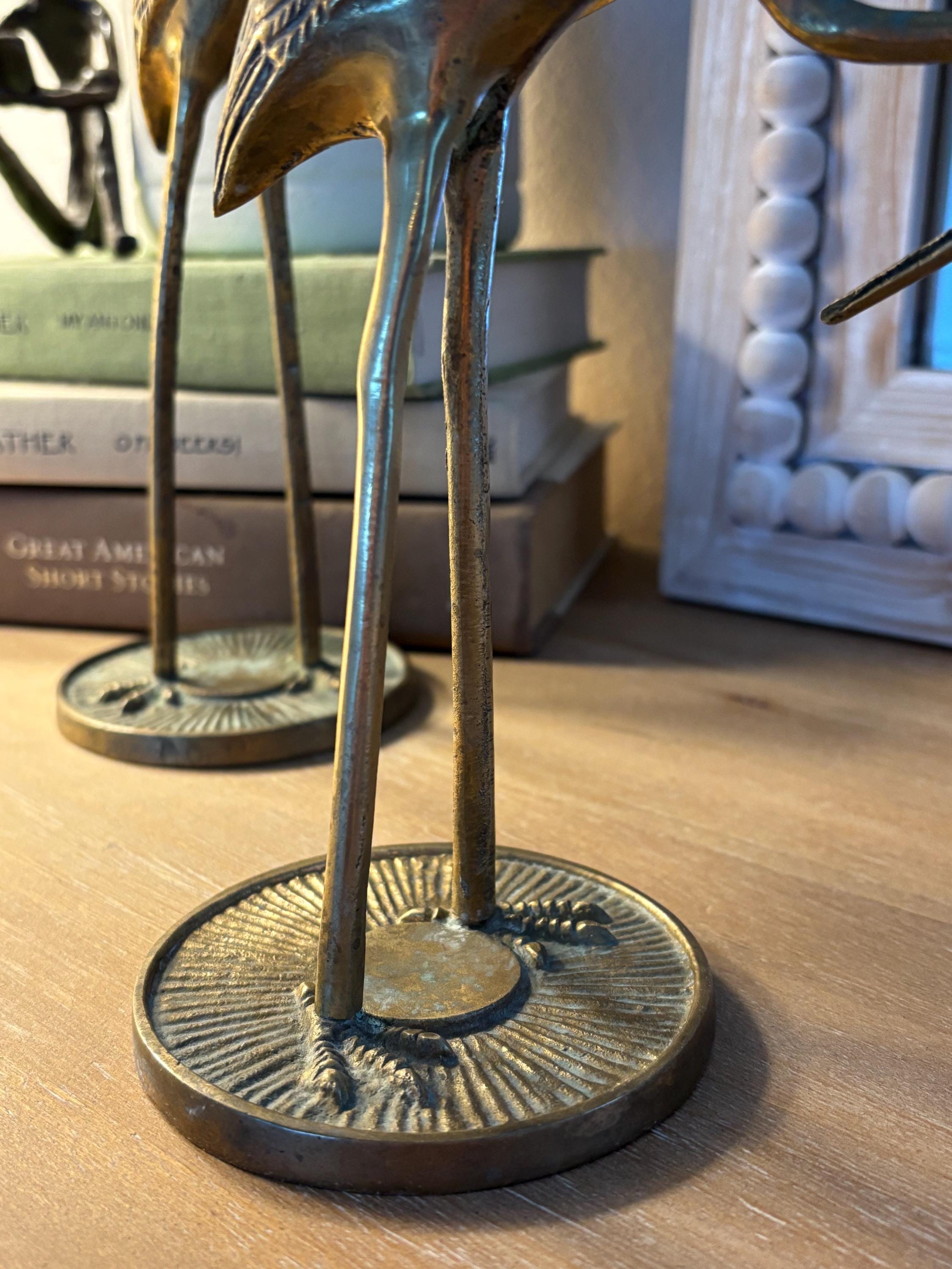 This a beautiful set of two brass vintage crane sculptures. Dating back to Mid Century, they have slight signs of wear and beginnings of patina. They have not been polished, but they still glow wonderfully in the light. I will eave polishing up the buyer in case the aged look is desired. These are elegant and quite sophisticated. Perfect for any decor!