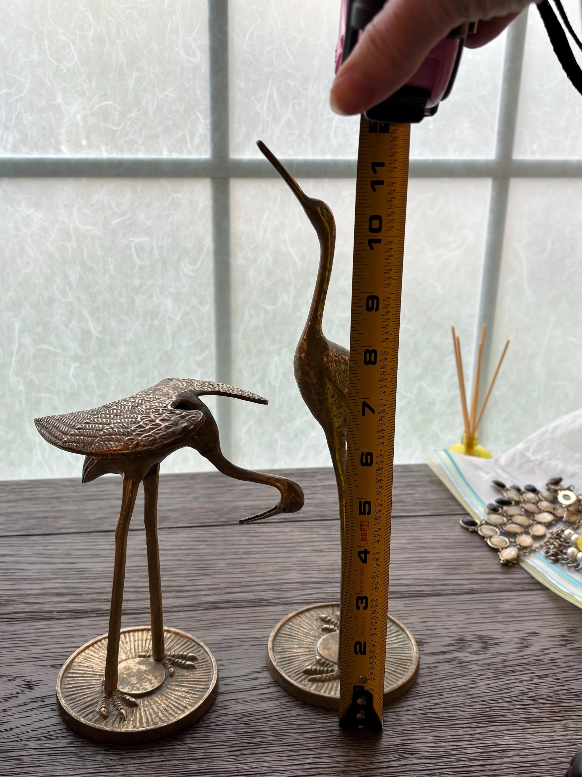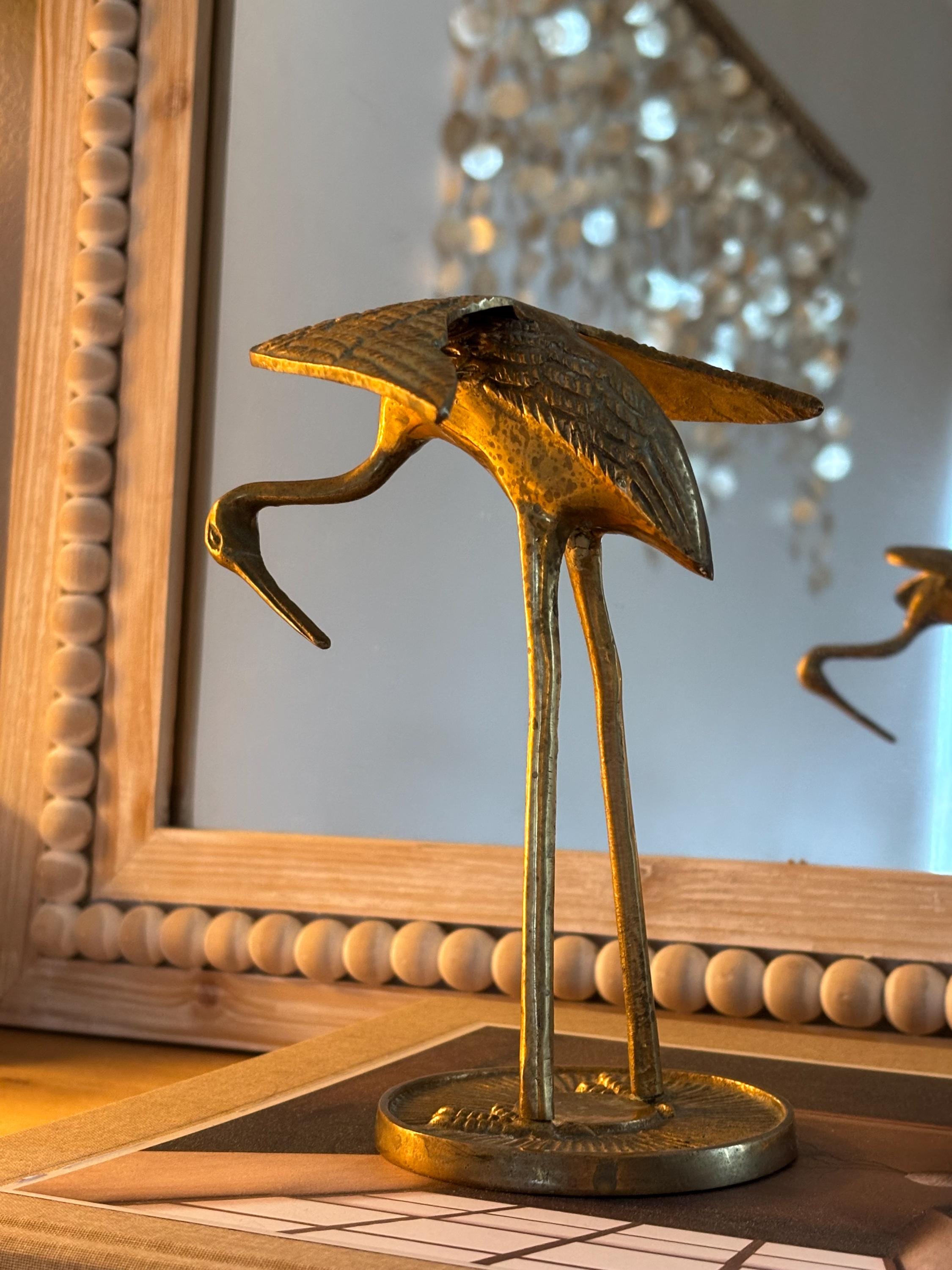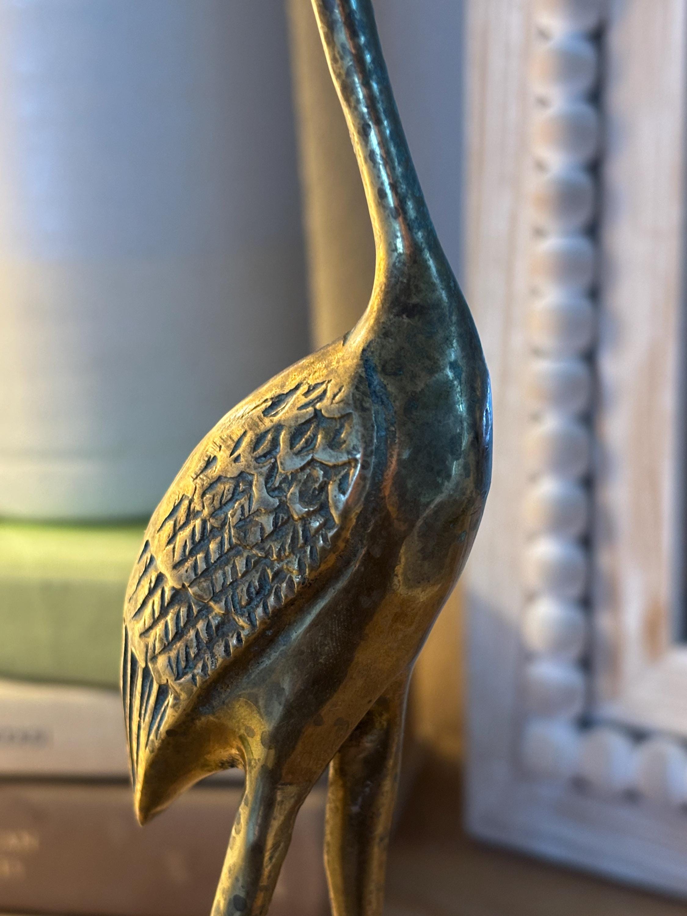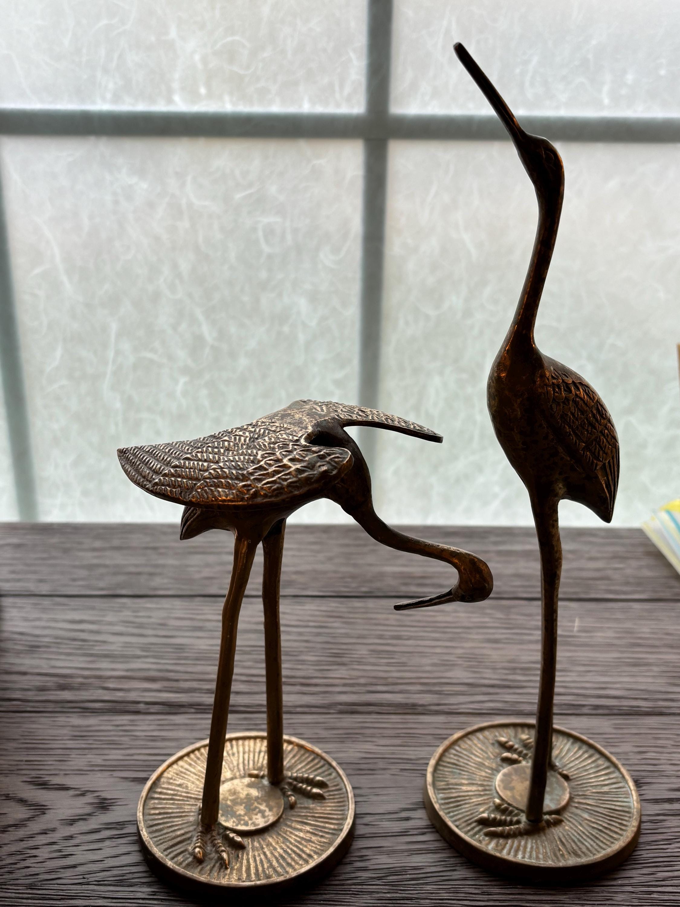 This a beautiful set of two brass vintage crane sculptures. Dating back to Mid Century, they have slight signs of wear and beginnings of patina. They have not been polished, but they still glow wonderfully in the light. I will eave polishing up the buyer in case the aged look is desired. These are elegant and quite sophisticated. Perfect for any decor!