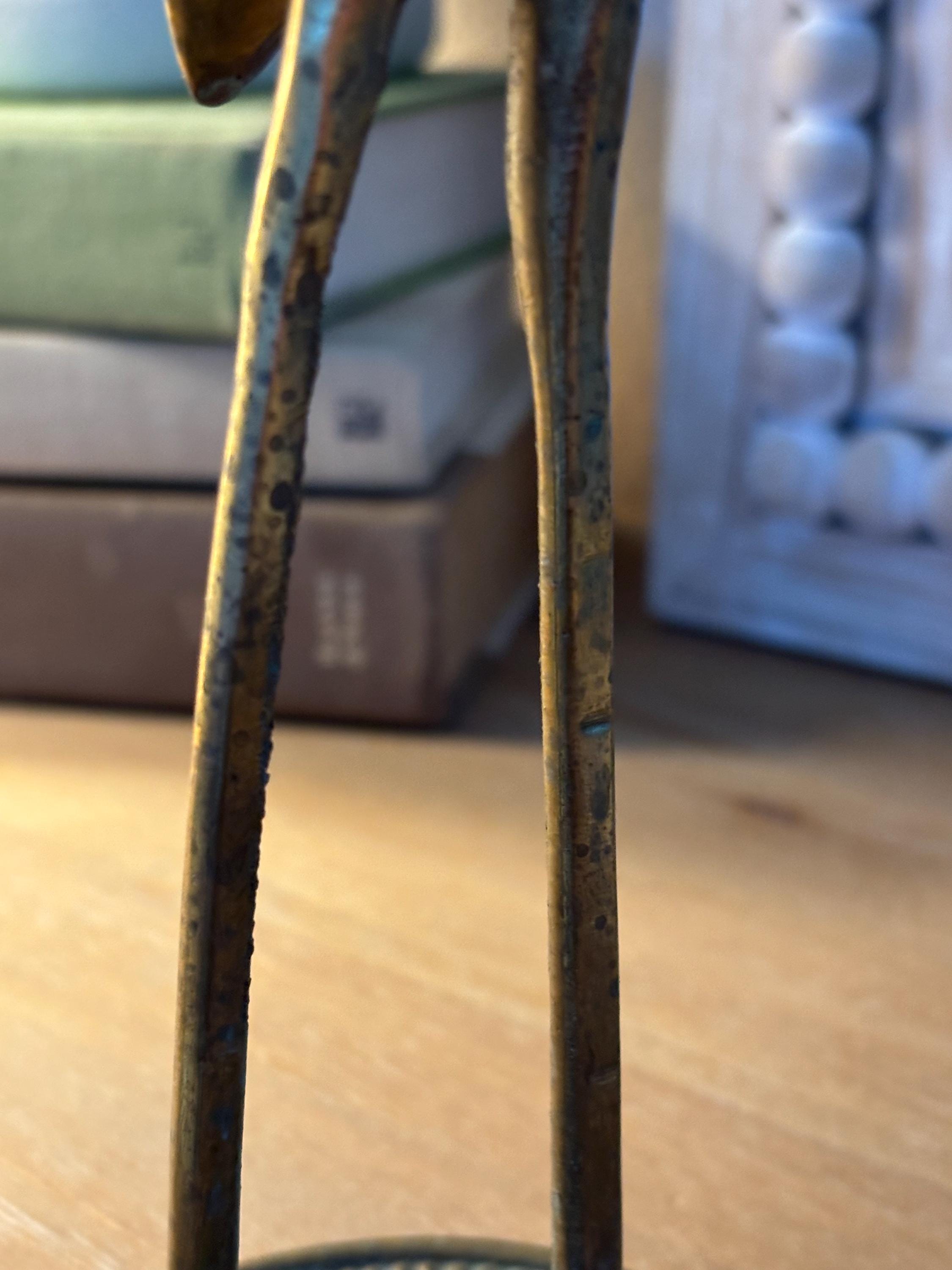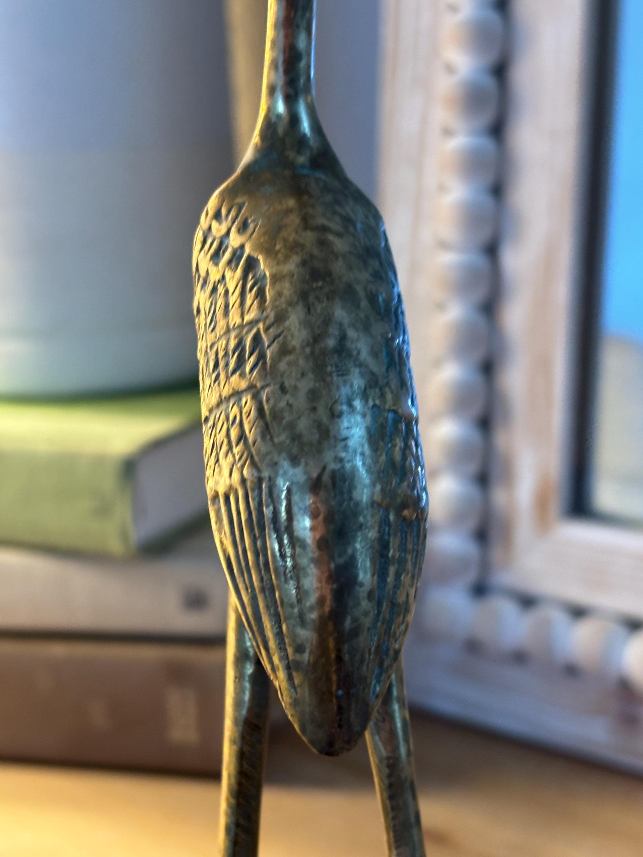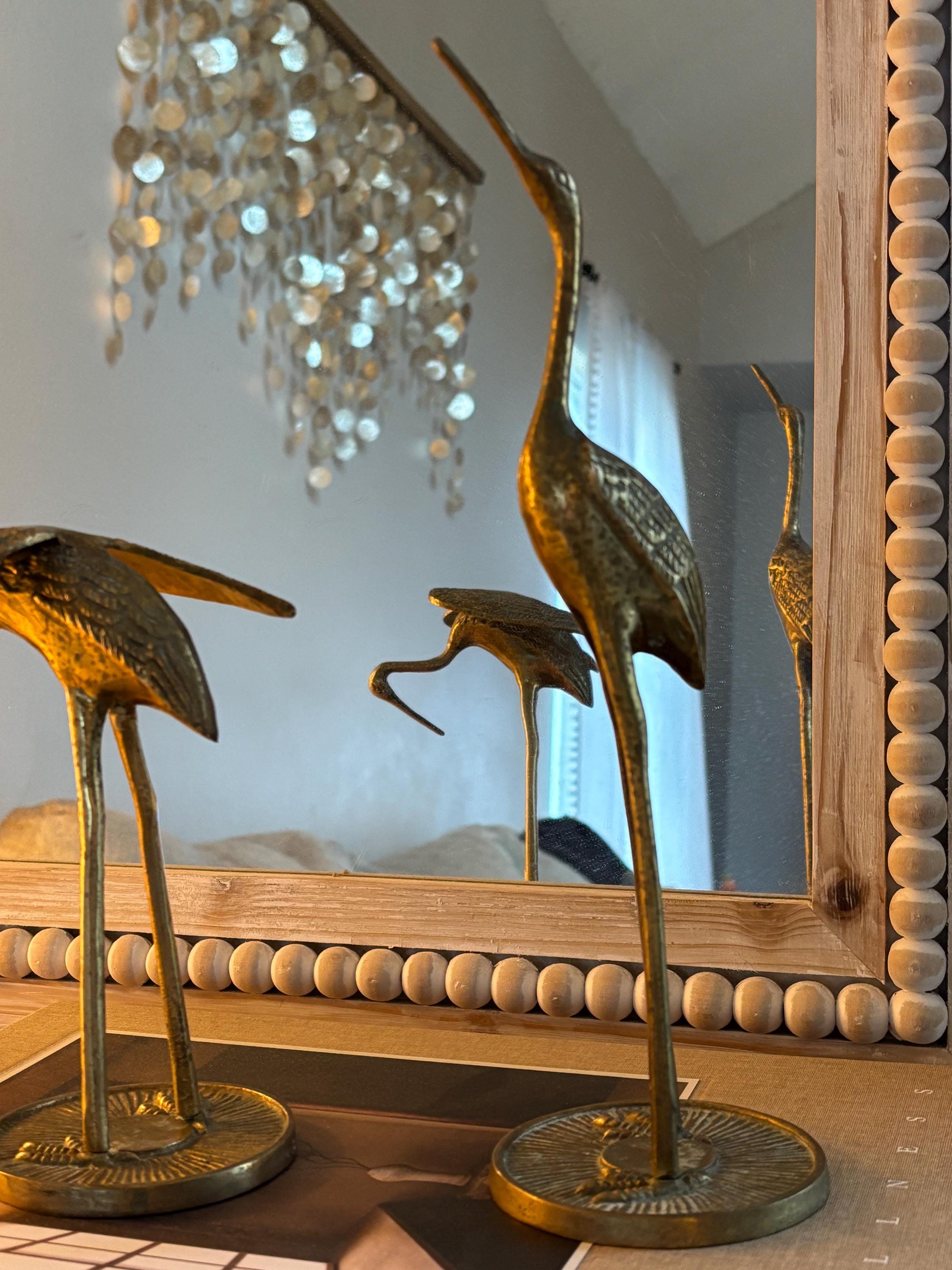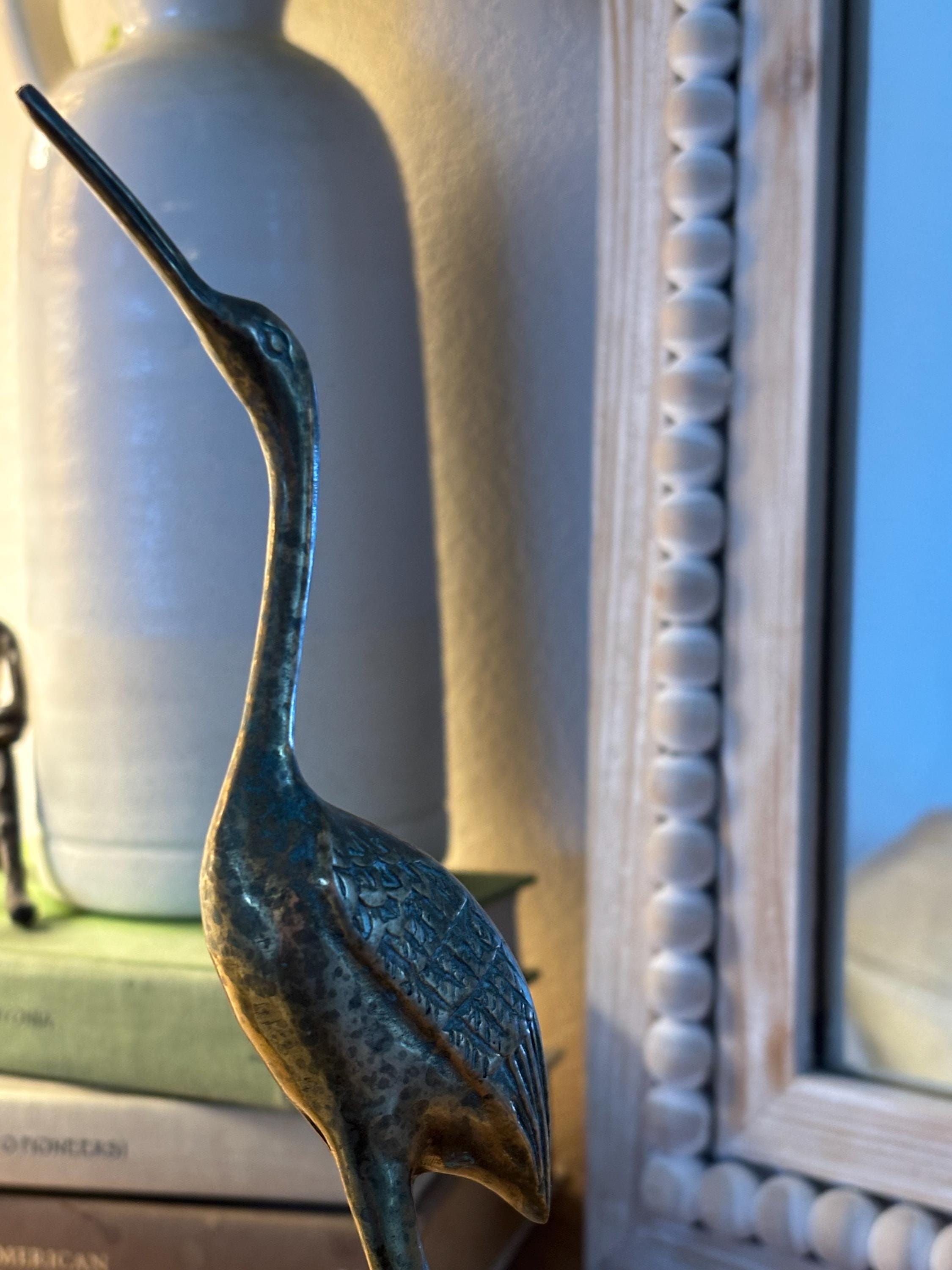This a beautiful set of two brass vintage crane sculptures. Dating back to Mid Century, they have slight signs of wear and beginnings of patina. They have not been polished, but they still glow wonderfully in the light. I will eave polishing up the buyer in case the aged look is desired. These are elegant and quite sophisticated. Perfect for any decor!