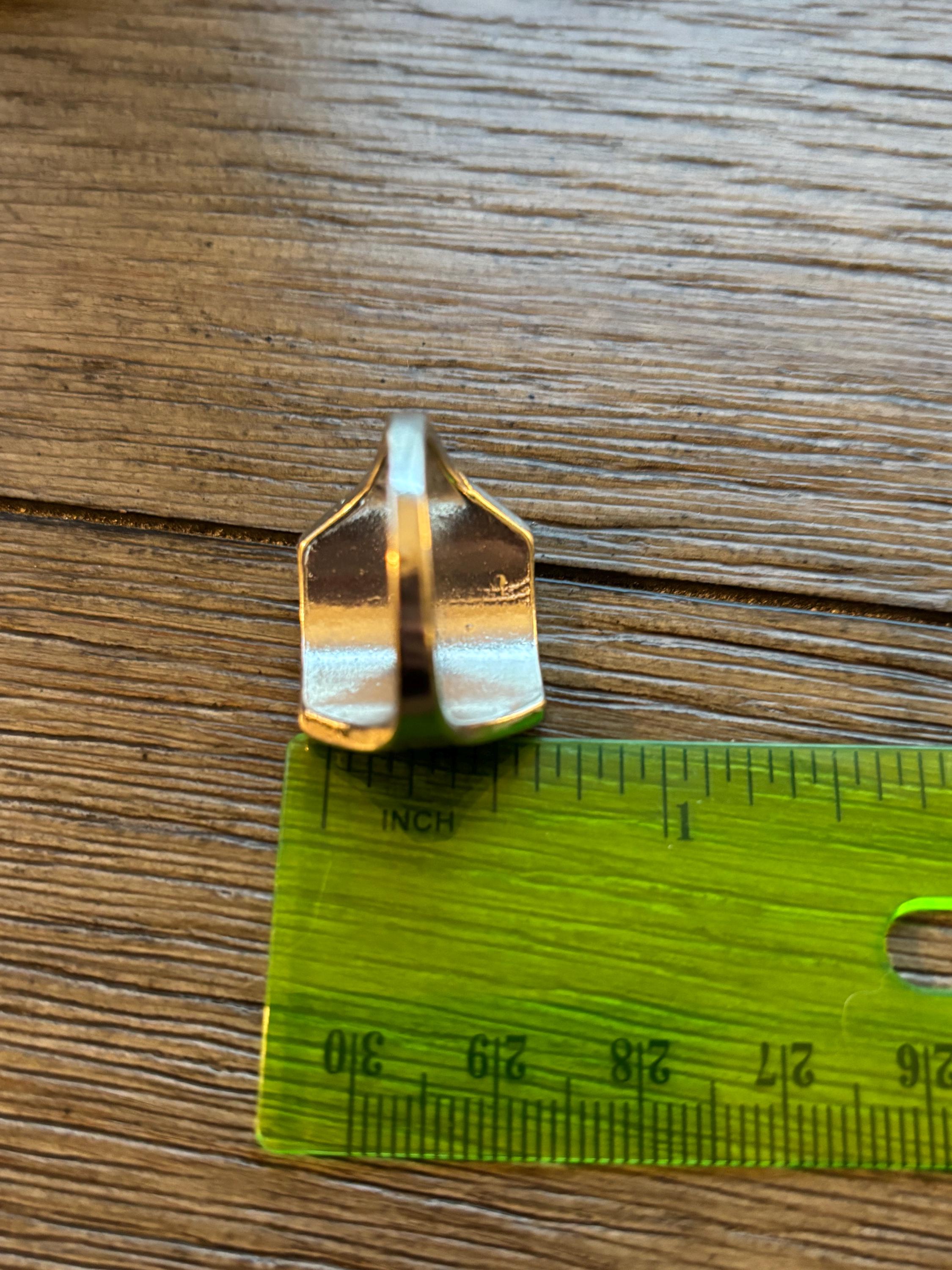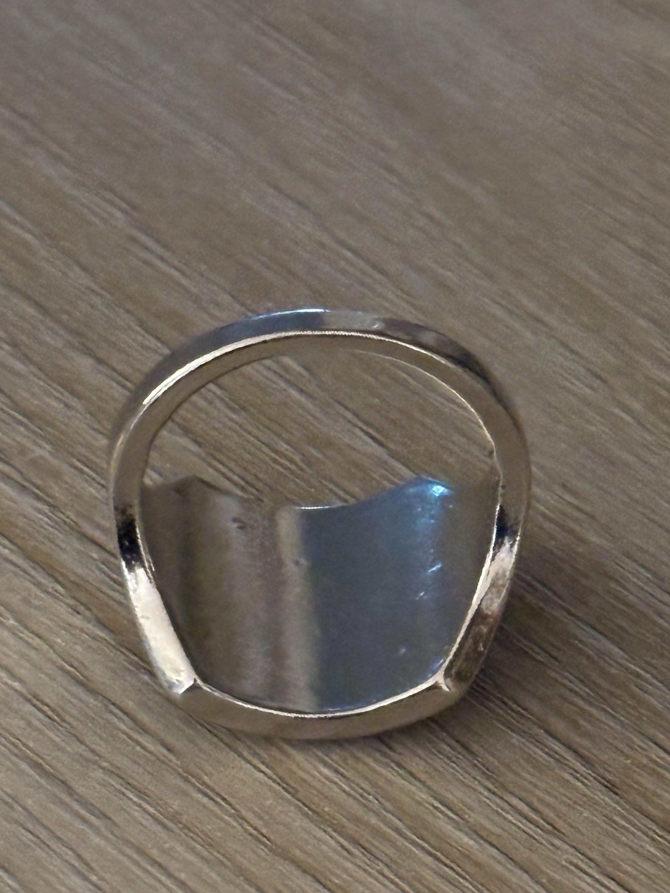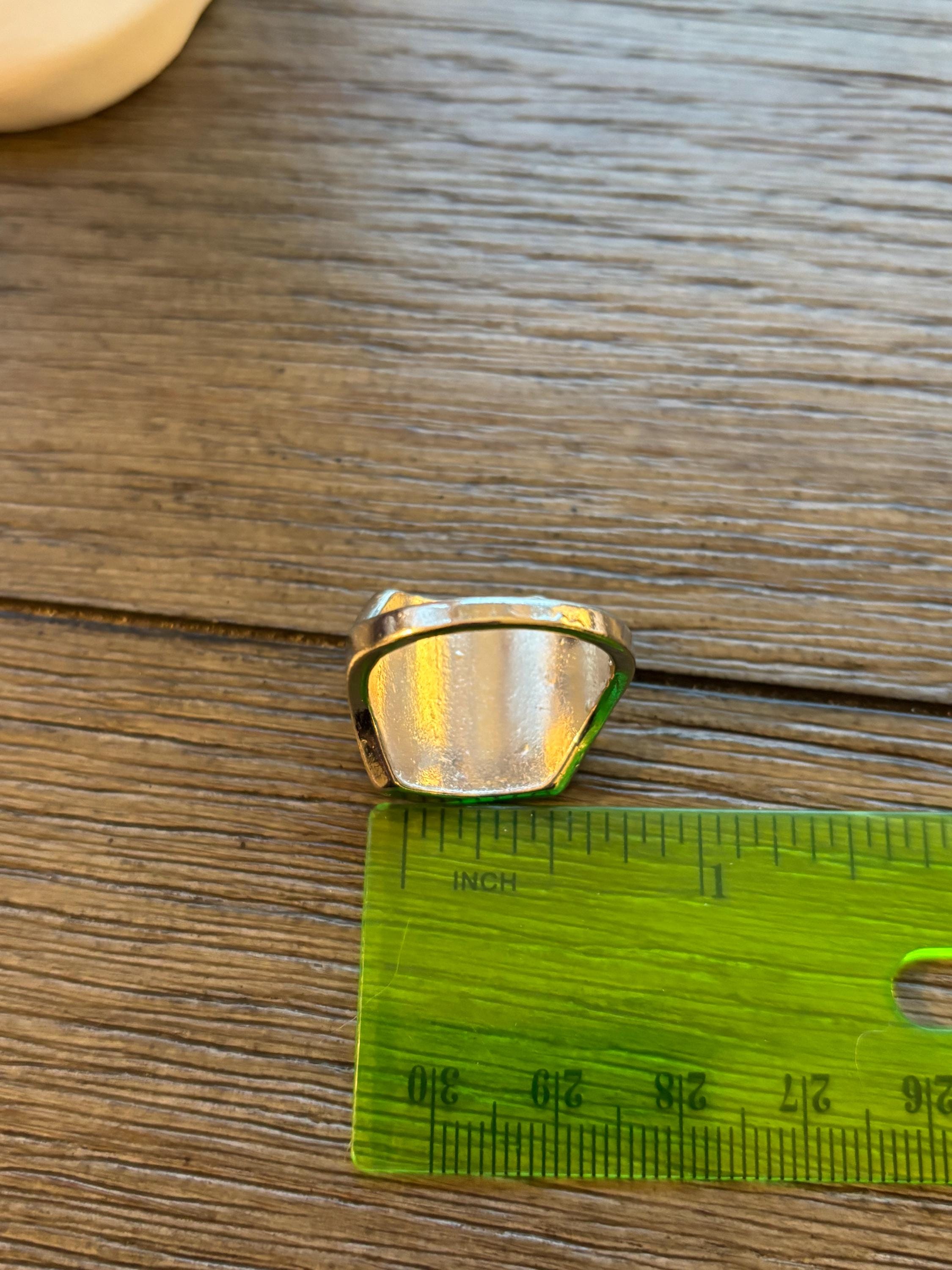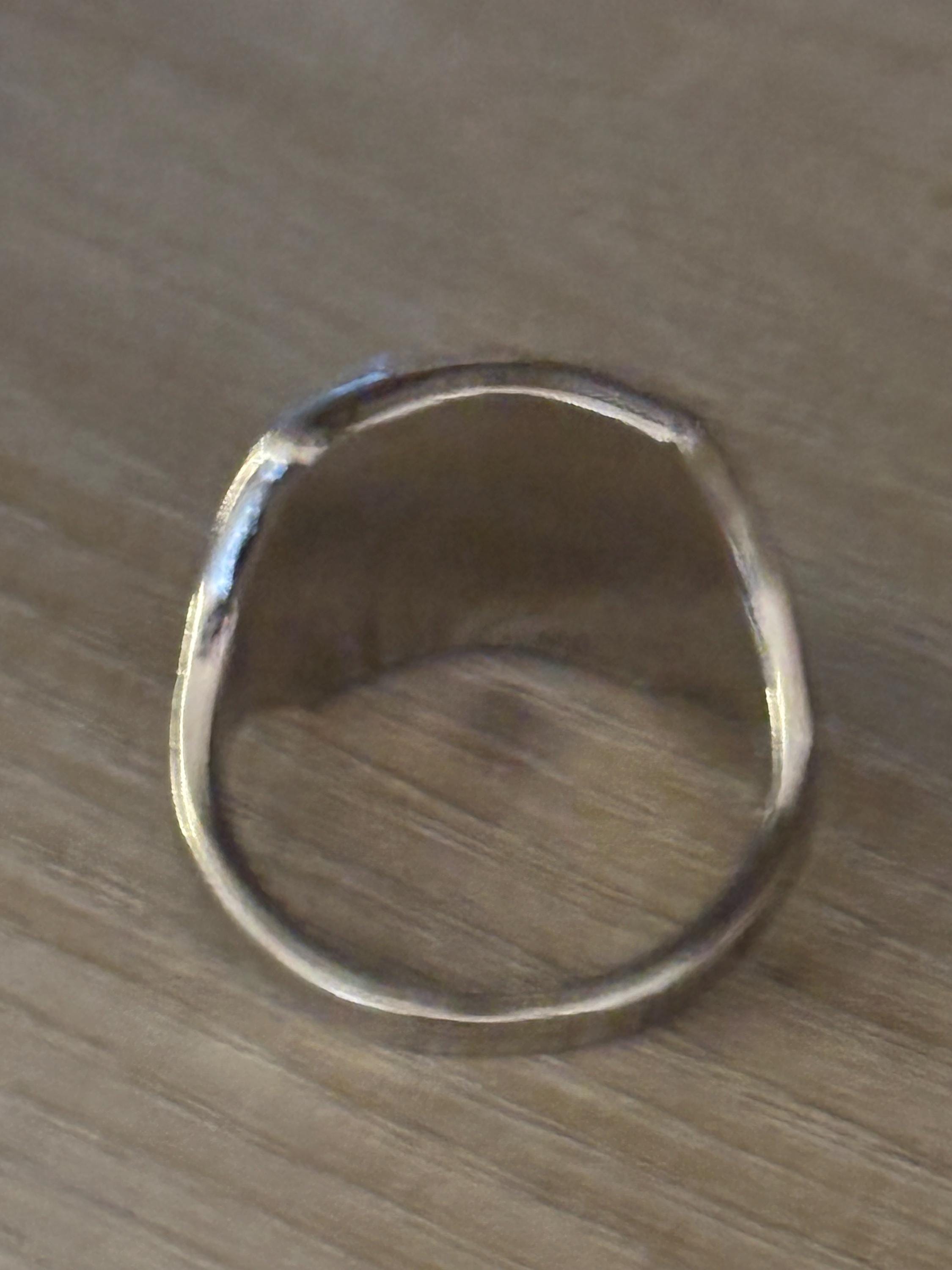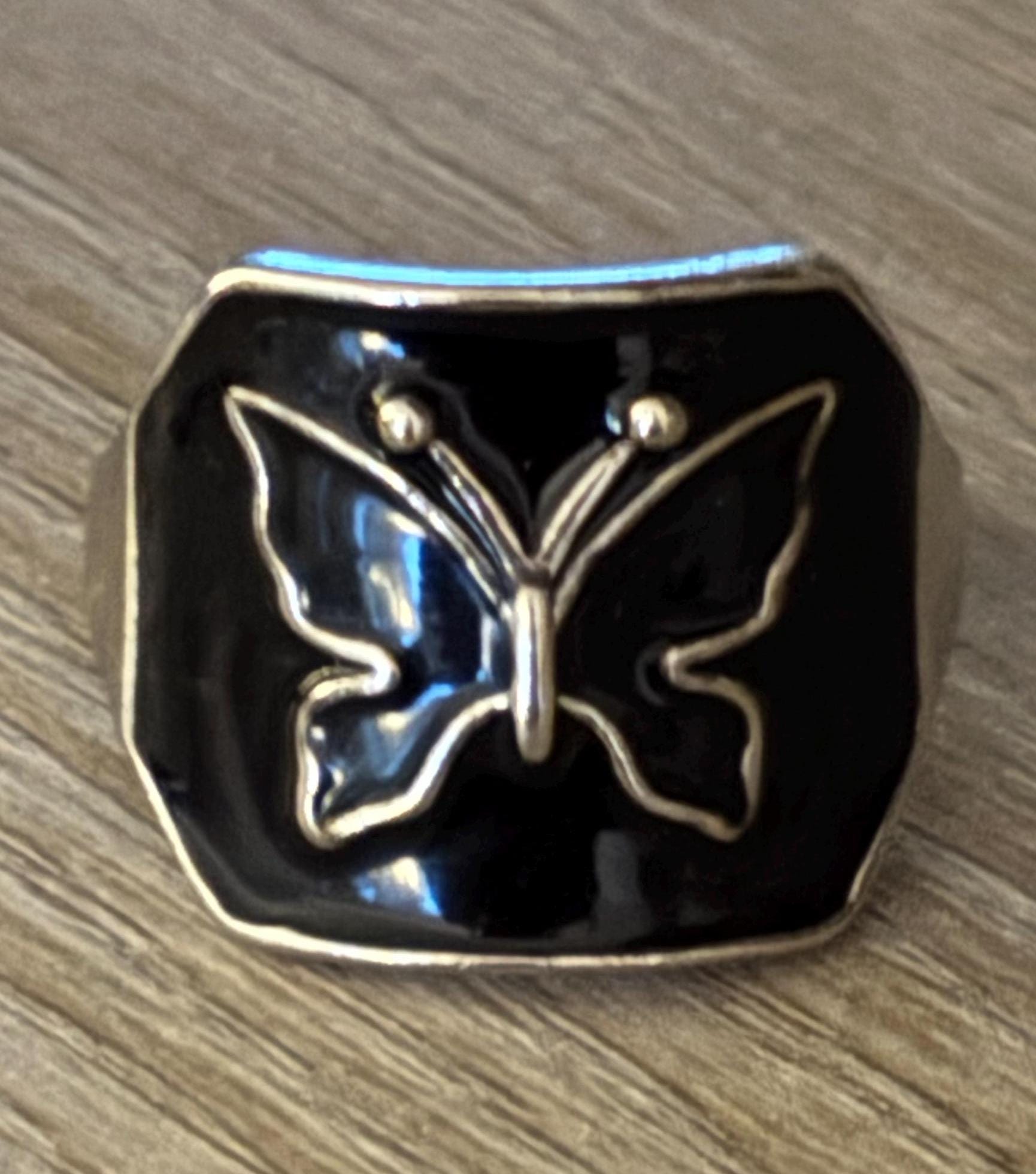 This is a super cool ring. Nice and chunky, yet the butterfly softens it. It sizes at about 9-3/4. Made of stainless, it's sturdy and ready to be shown off to the world! Silver toned, can throw a little gold in warm lighting. Shows a little wear, consistent with normal use and age.