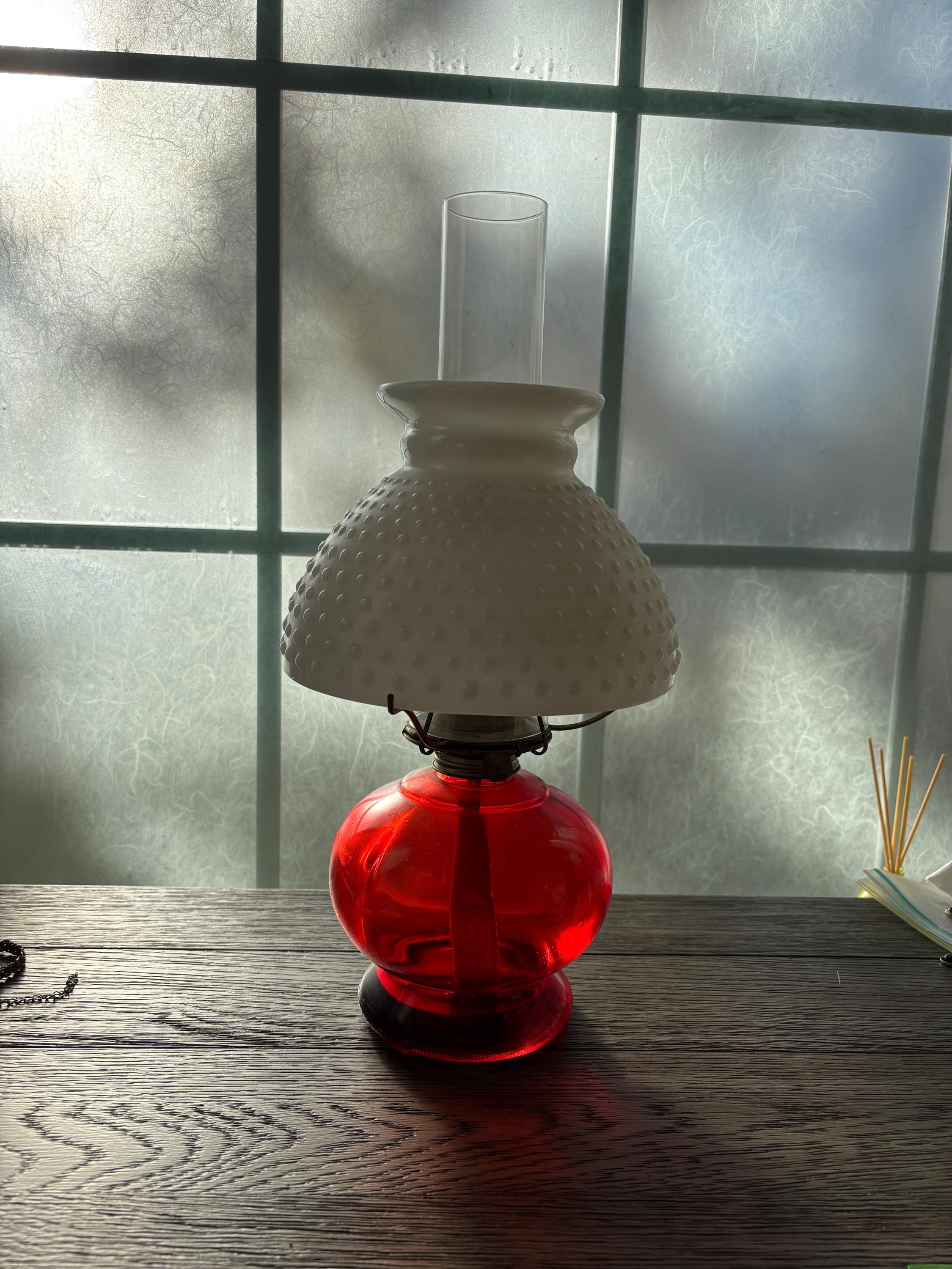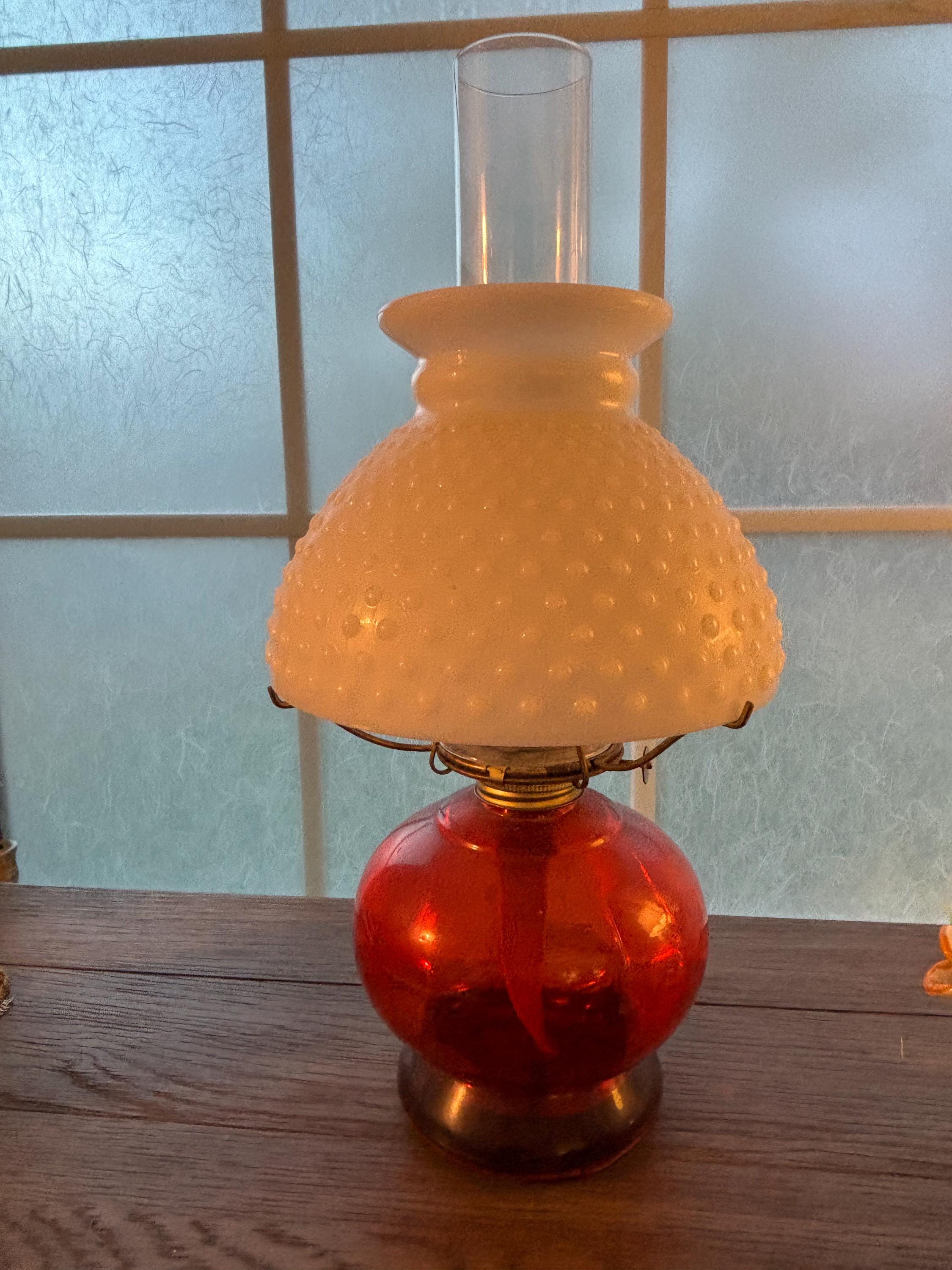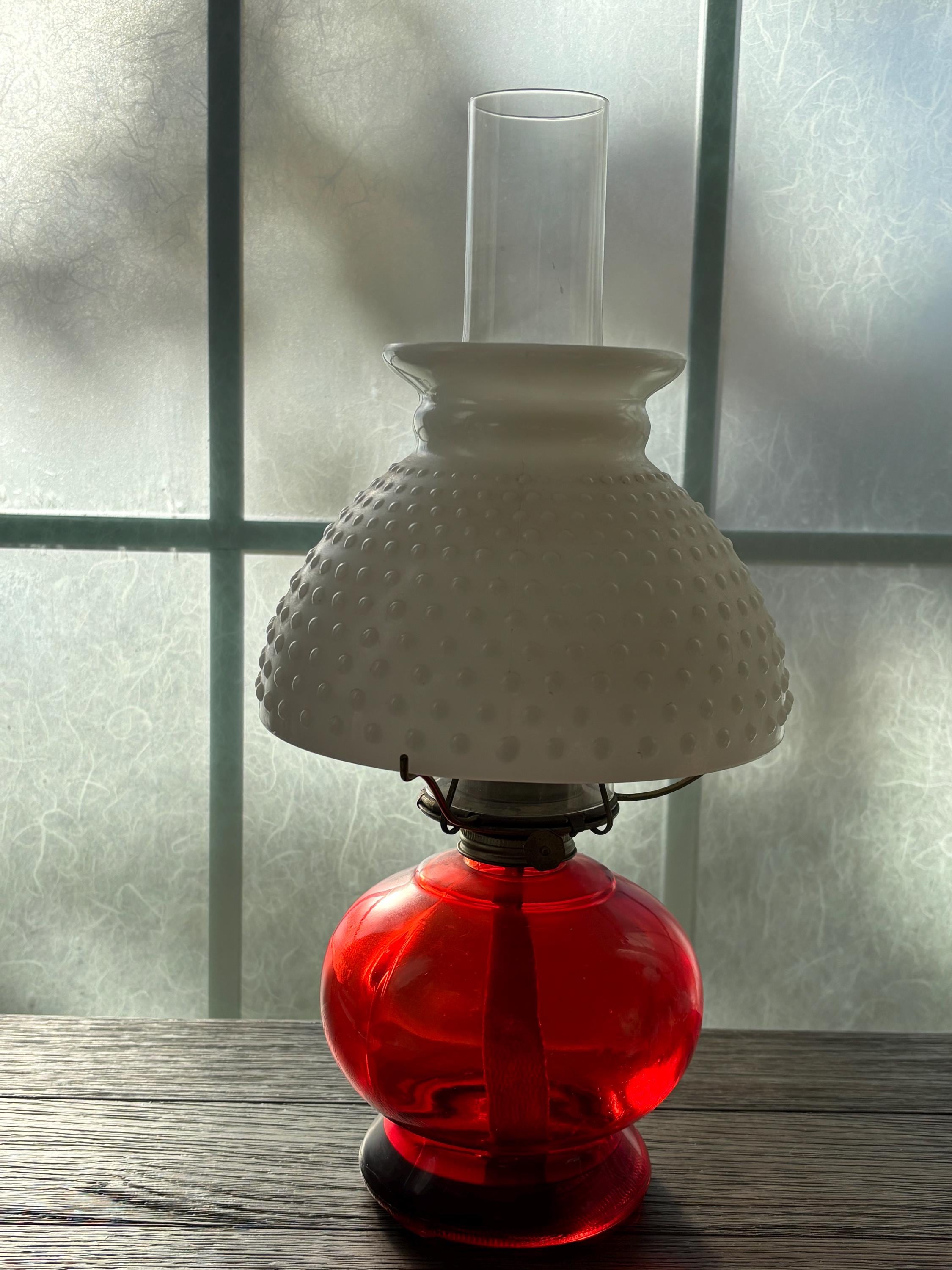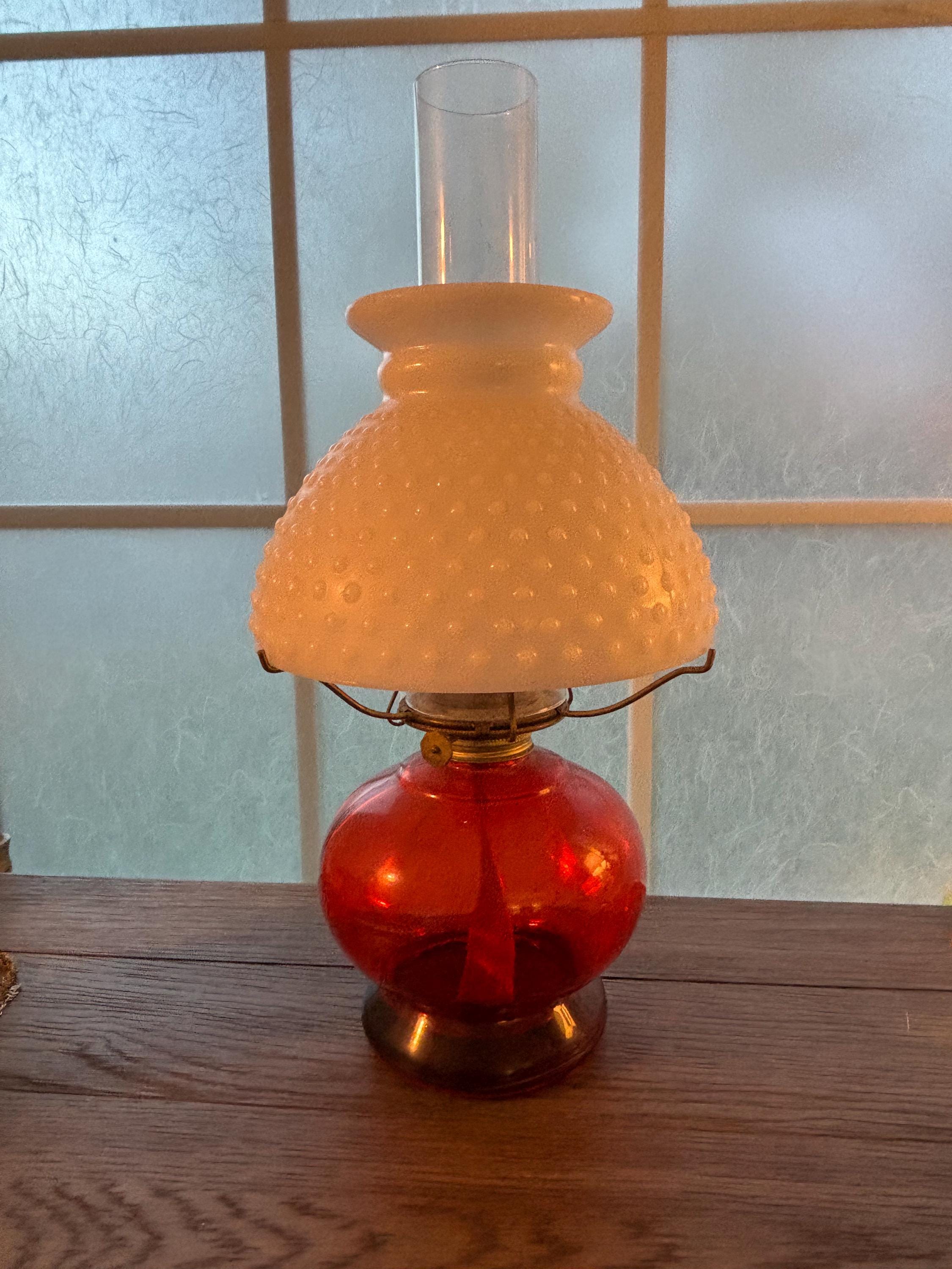 This is a beautiful and well preserved P&A MFG oil lamp. The bottom portion is a deep red color,yet is clear and the light shines through it beautifully. The shade is a hobnail white milk glass and the combo is stunning. Perfect for many types of decor. With chimney, the lamp is about 15" high. There is still a wick in place and red wick oil. I will unfortunately have to empty the oil prior to shipping. A truly rare find!