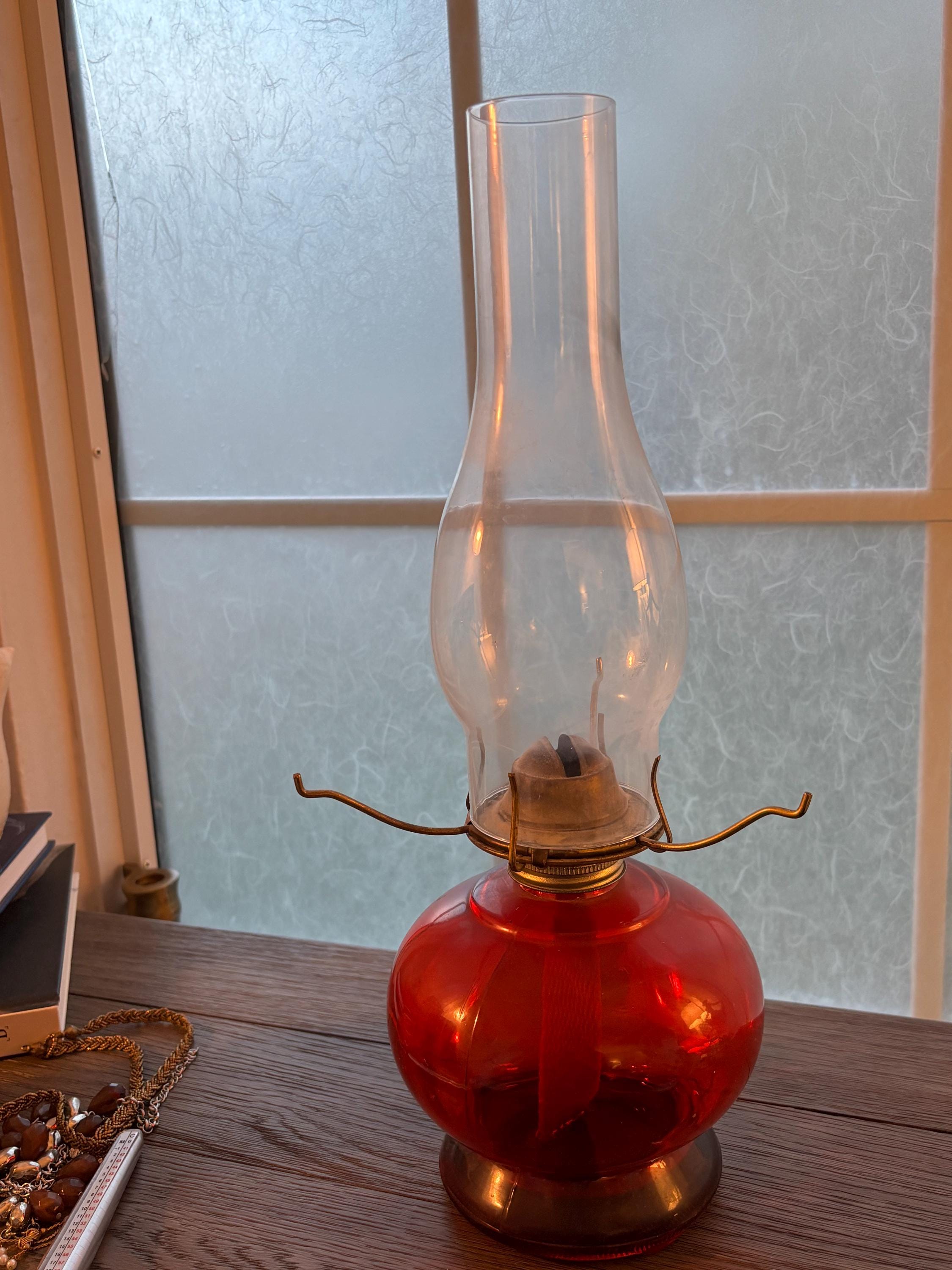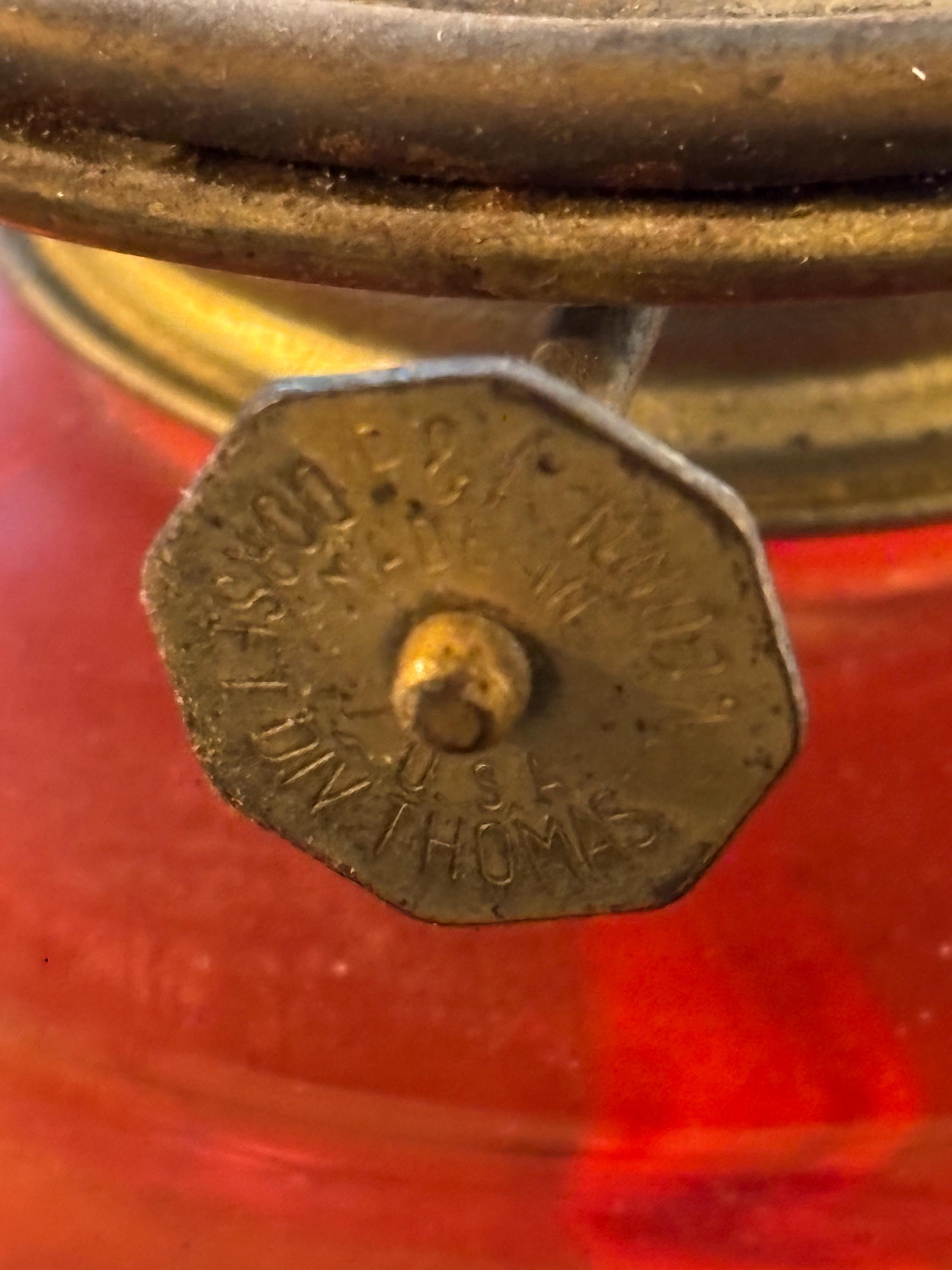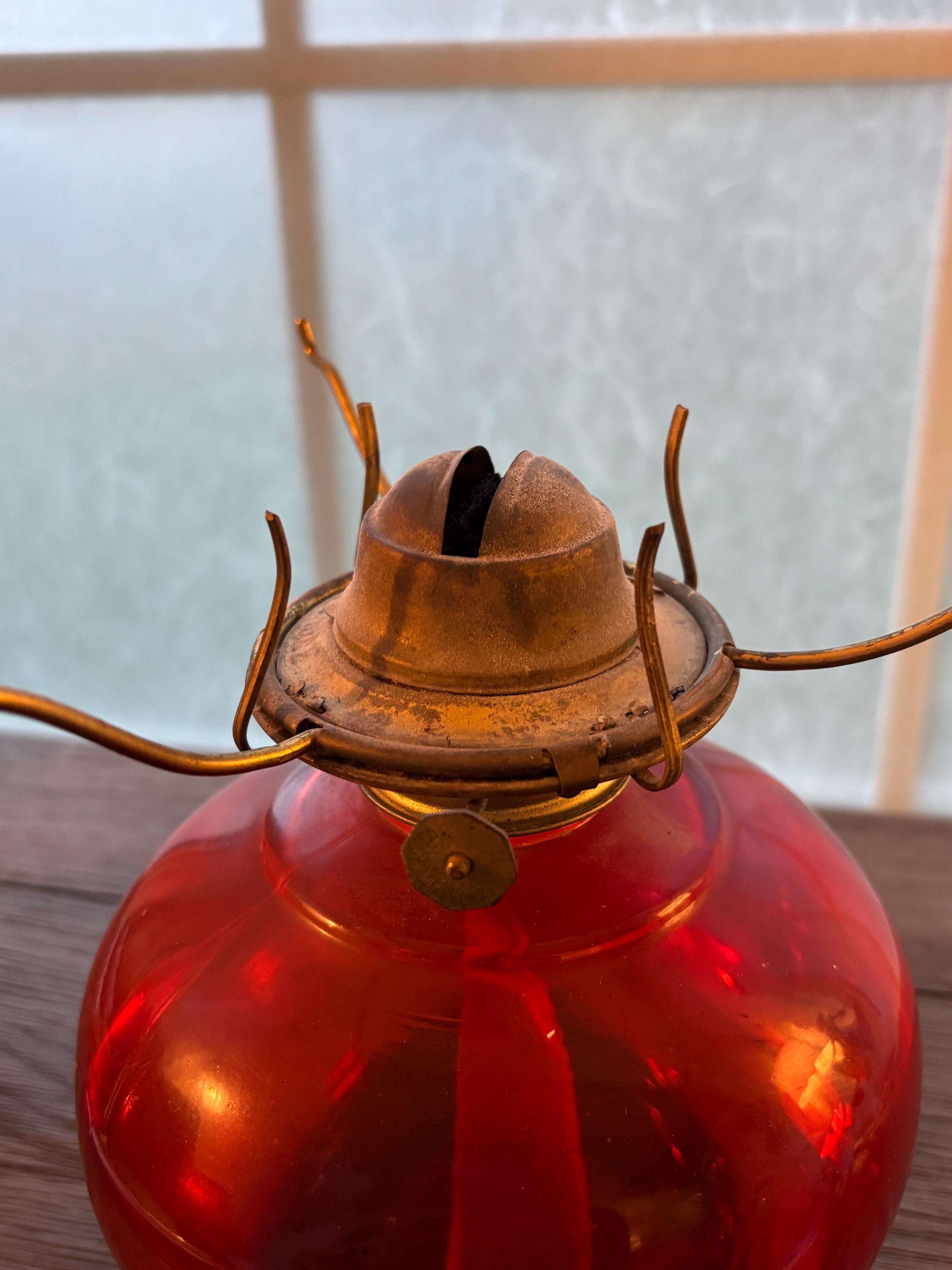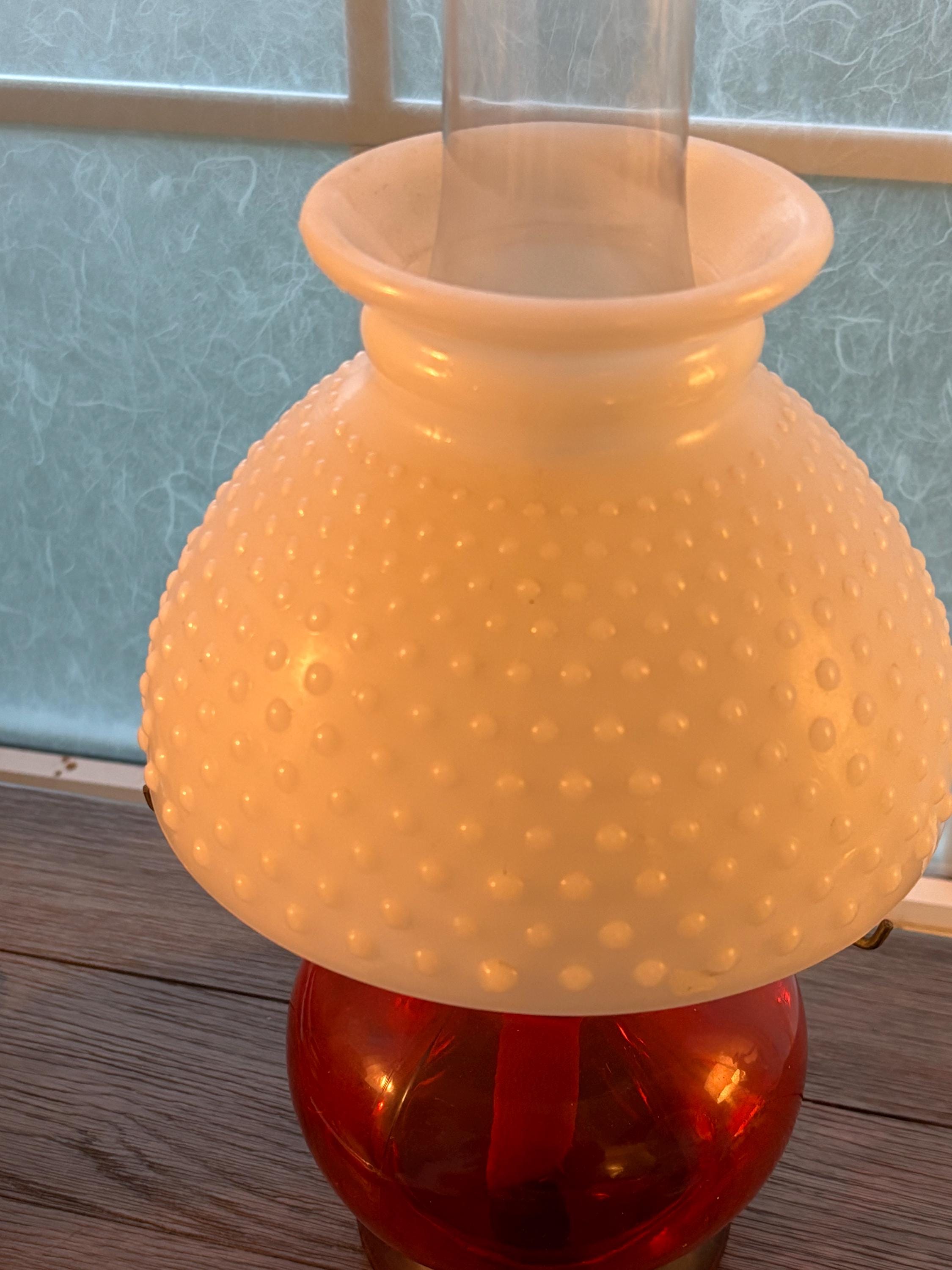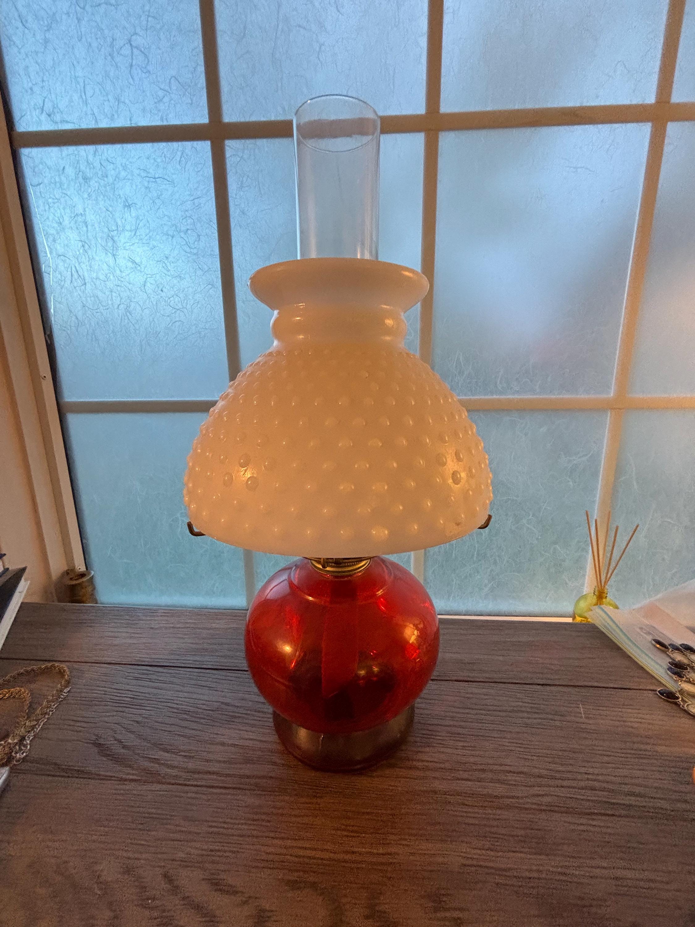 This is a beautiful and well preserved P&A MFG oil lamp. The bottom portion is a deep red color,yet is clear and the light shines through it beautifully. The shade is a hobnail white milk glass and the combo is stunning. Perfect for many types of decor. With chimney, the lamp is about 15" high. There is still a wick in place and red wick oil. I will unfortunately have to empty the oil prior to shipping. A truly rare find!