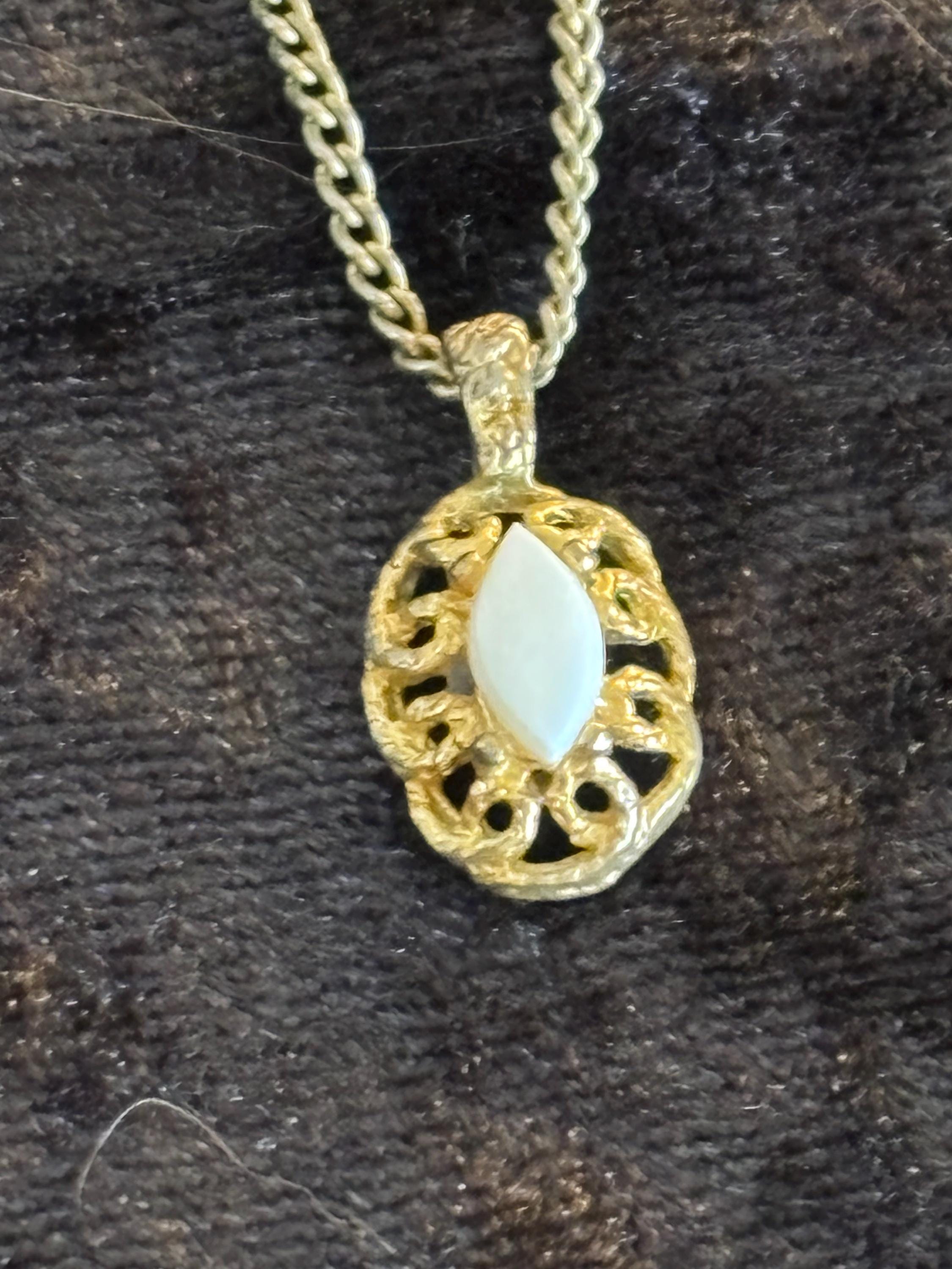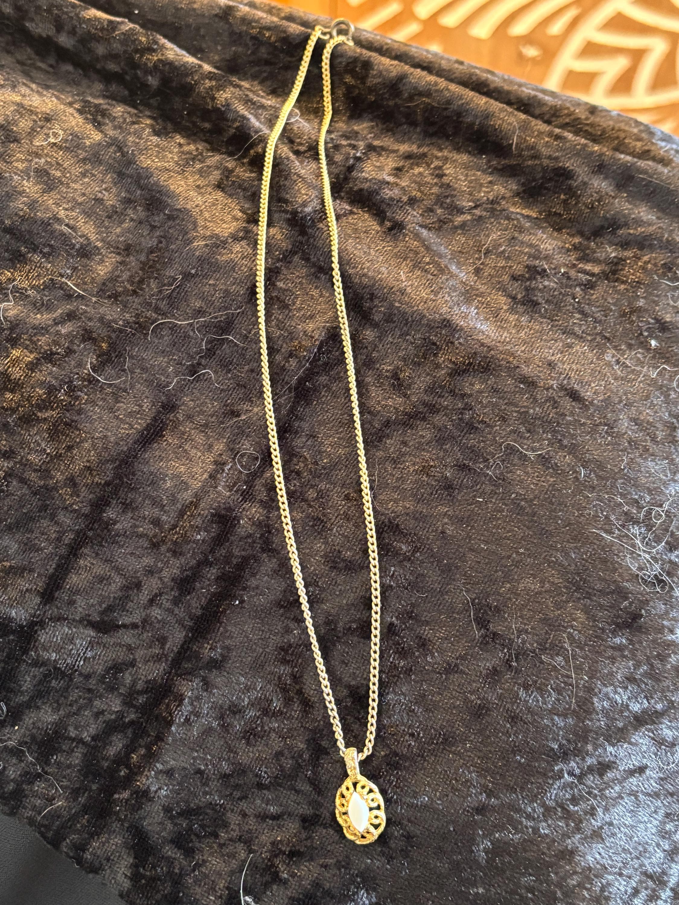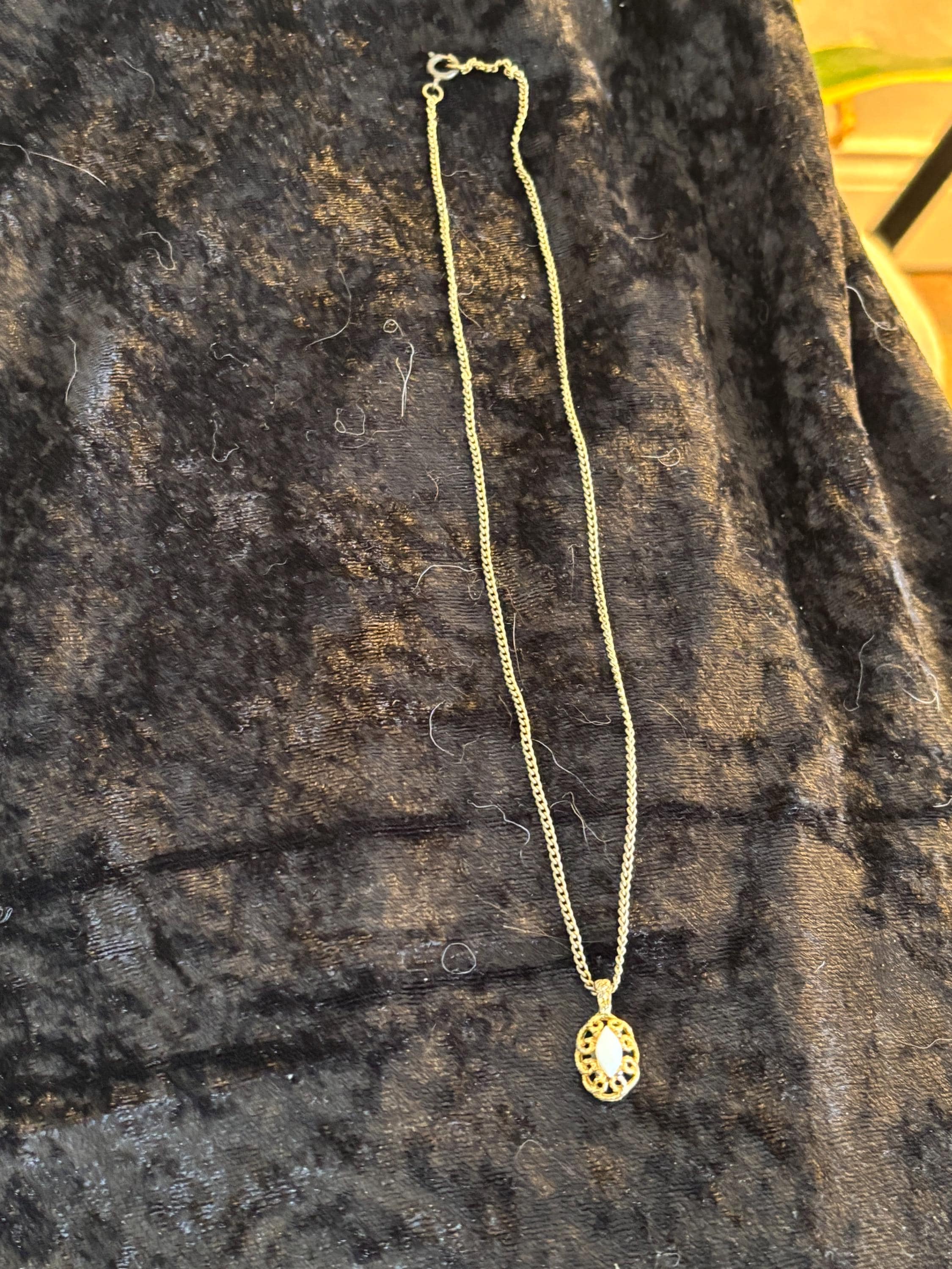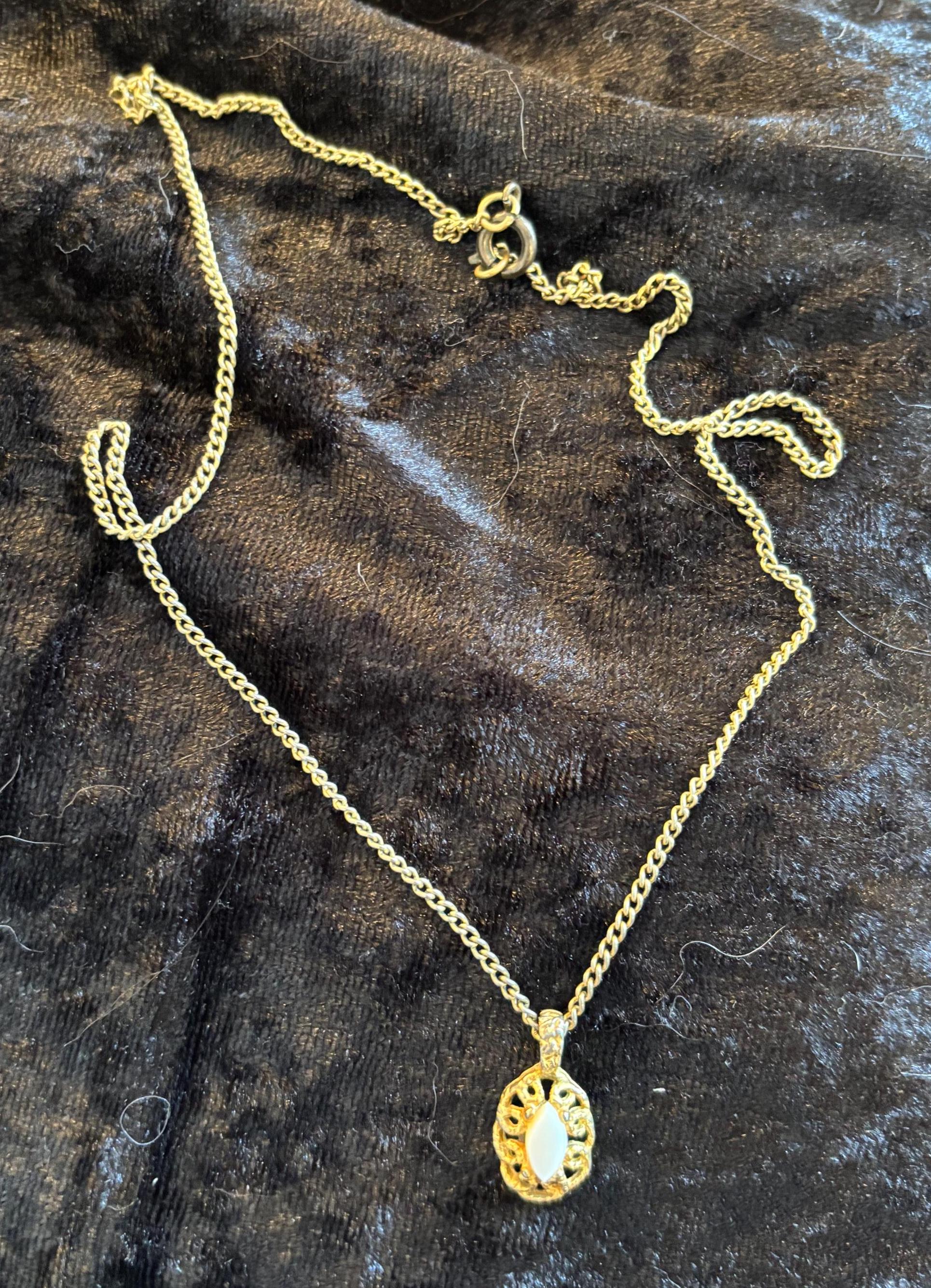 This listing is for a cute dainty filigree pendant necklace with a white stone in the middle (likely plastic). Great for layering, or on it's own as a sweet unassuming necklace. Signs of wear on the pendant, but it kind of makes it look more unique and kind of cool.