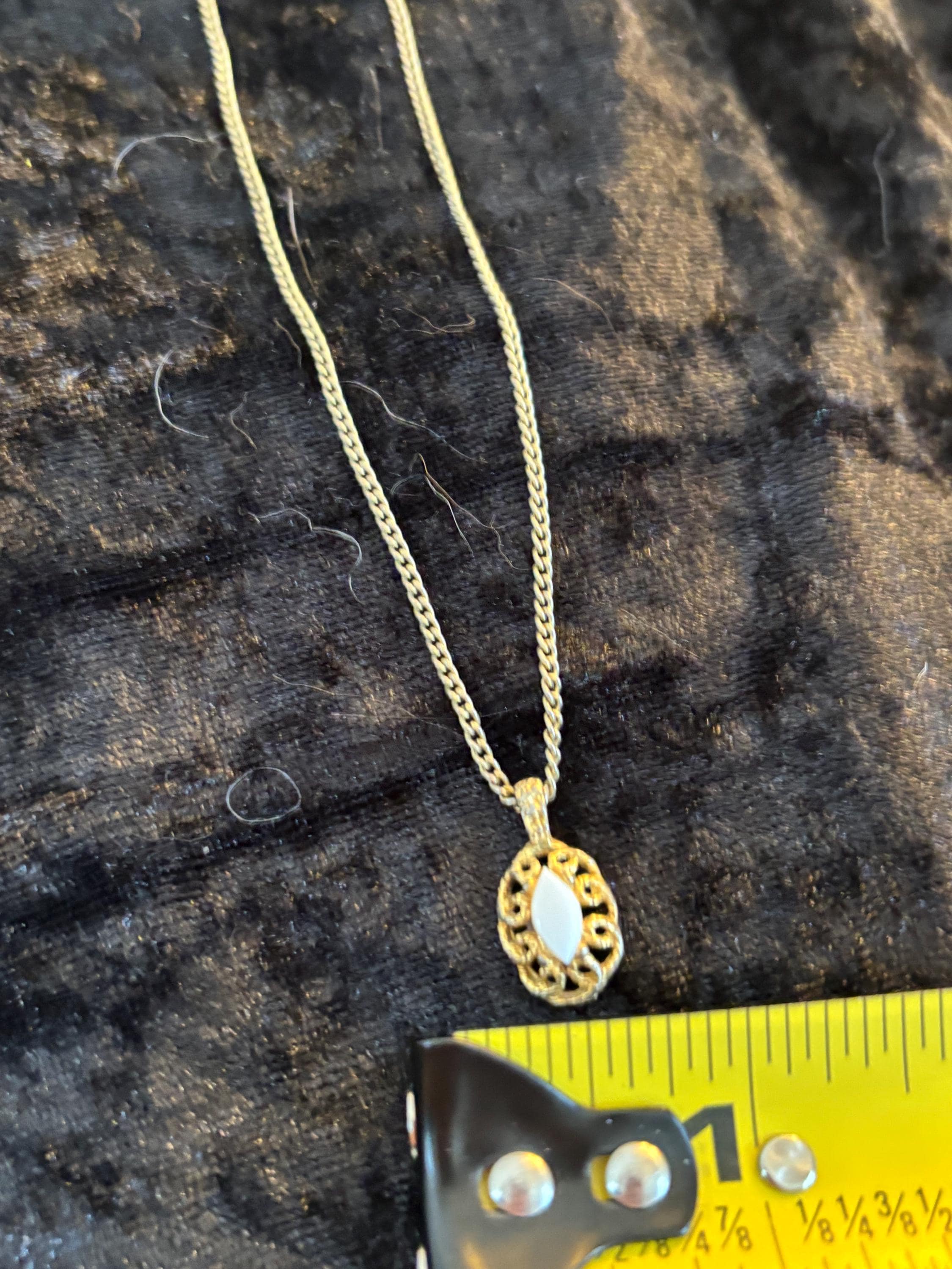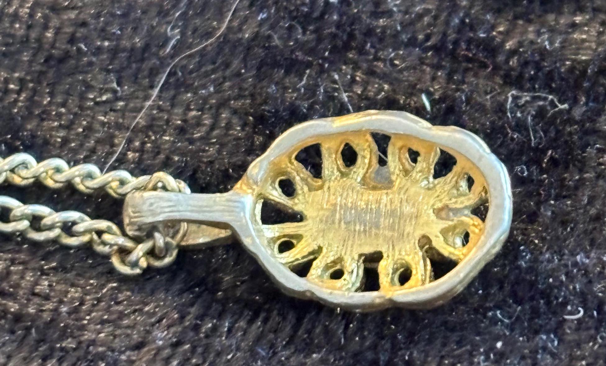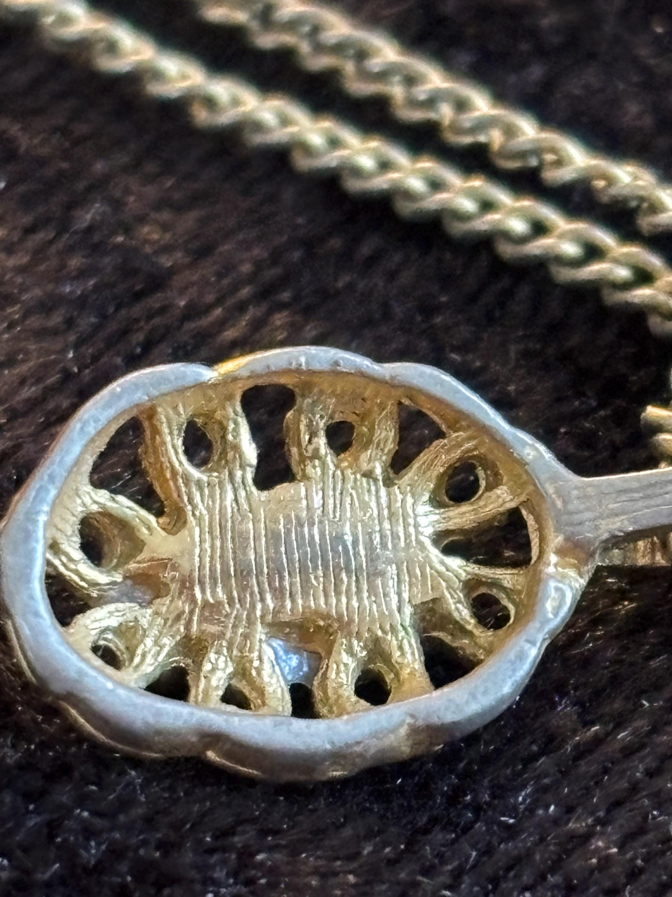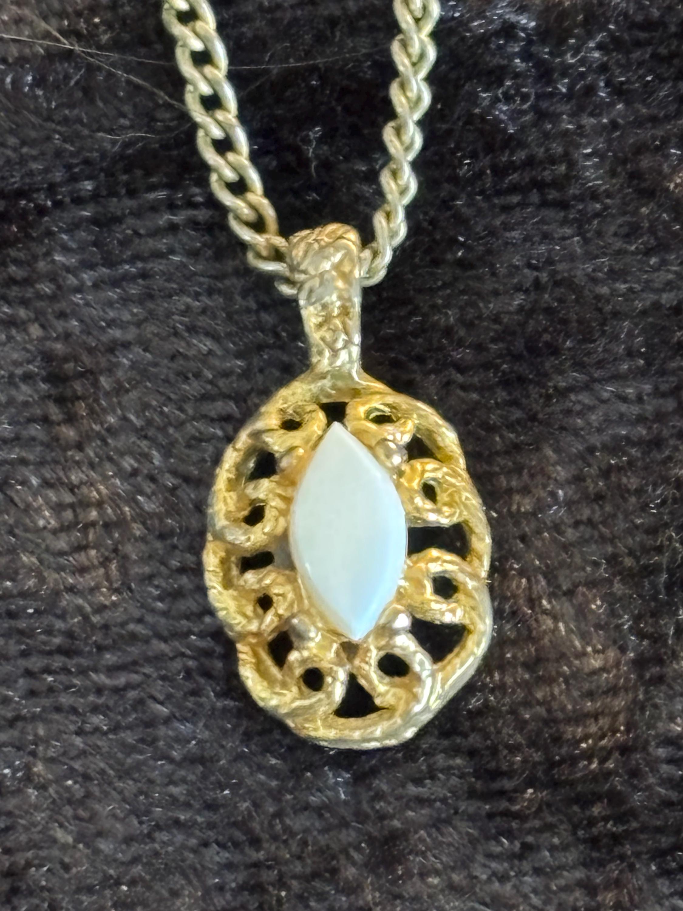 This listing is for a cute dainty filigree pendant necklace with a white stone in the middle (likely plastic). Great for layering, or on it's own as a sweet unassuming necklace. Signs of wear on the pendant, but it kind of makes it look more unique and kind of cool.