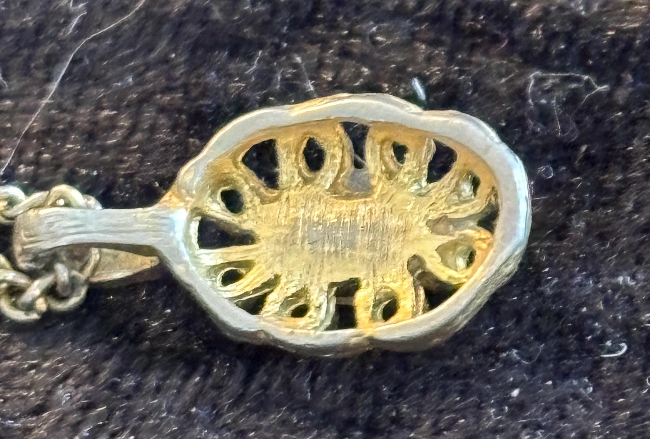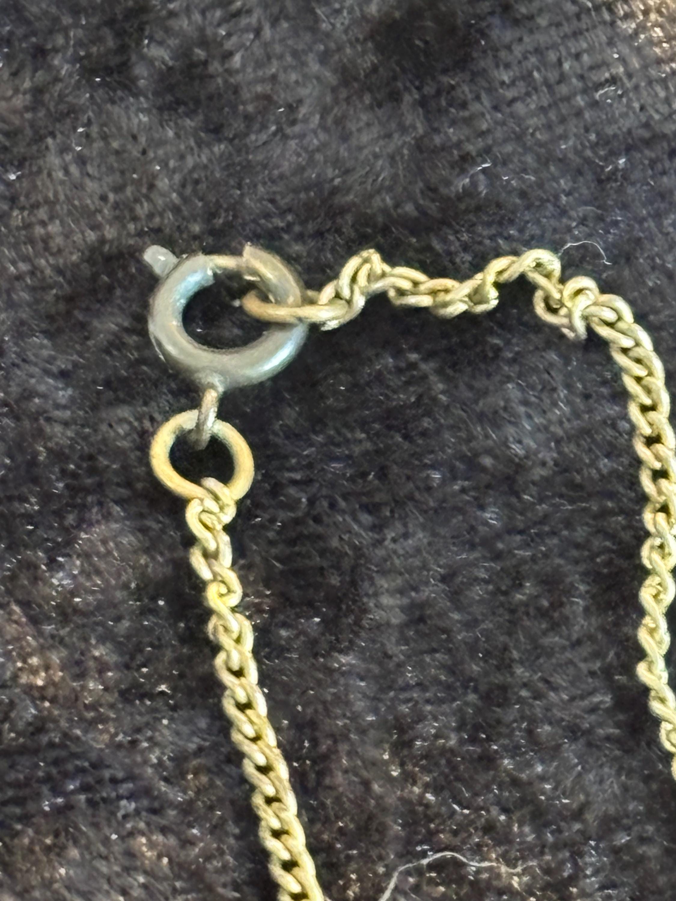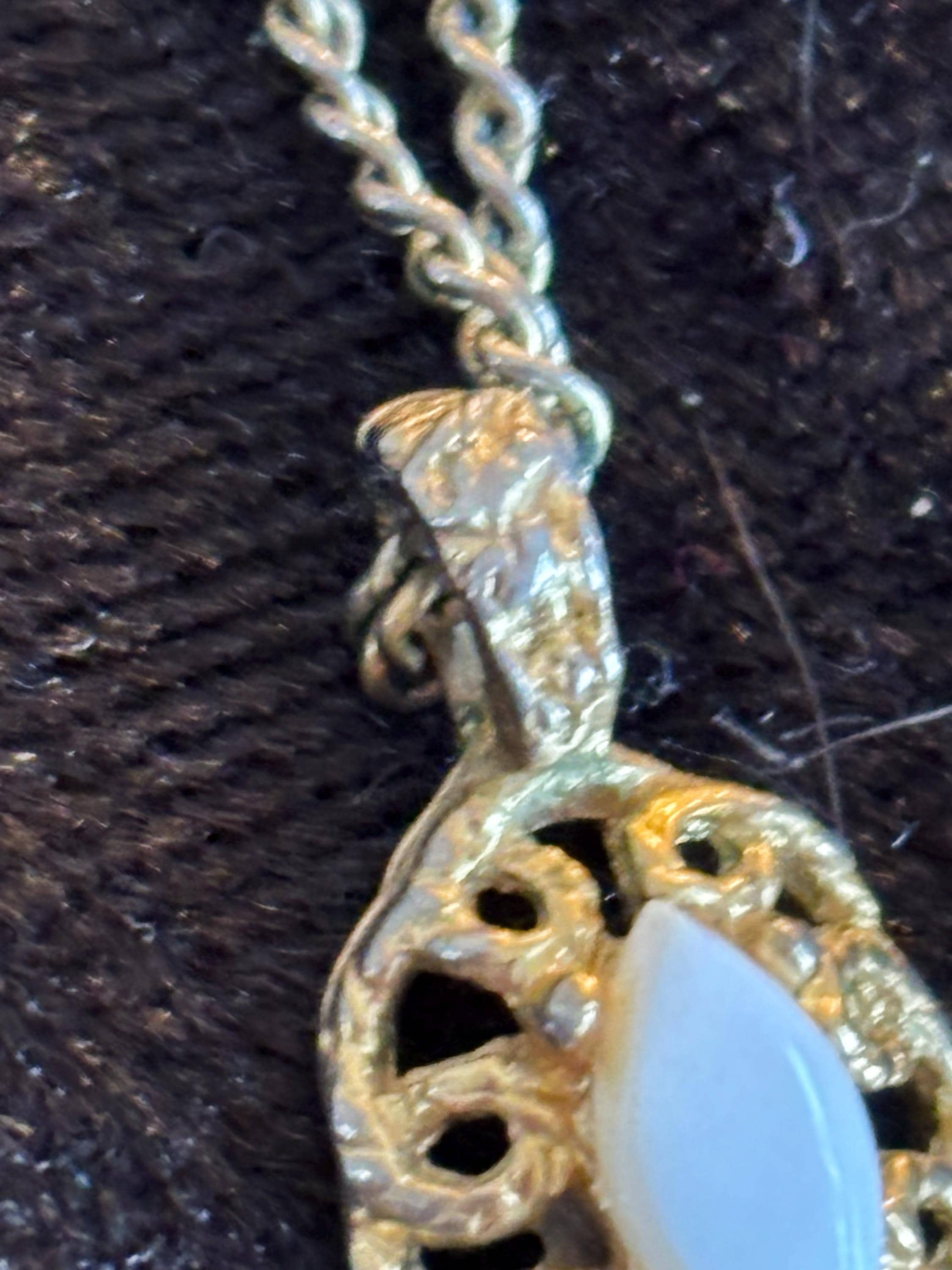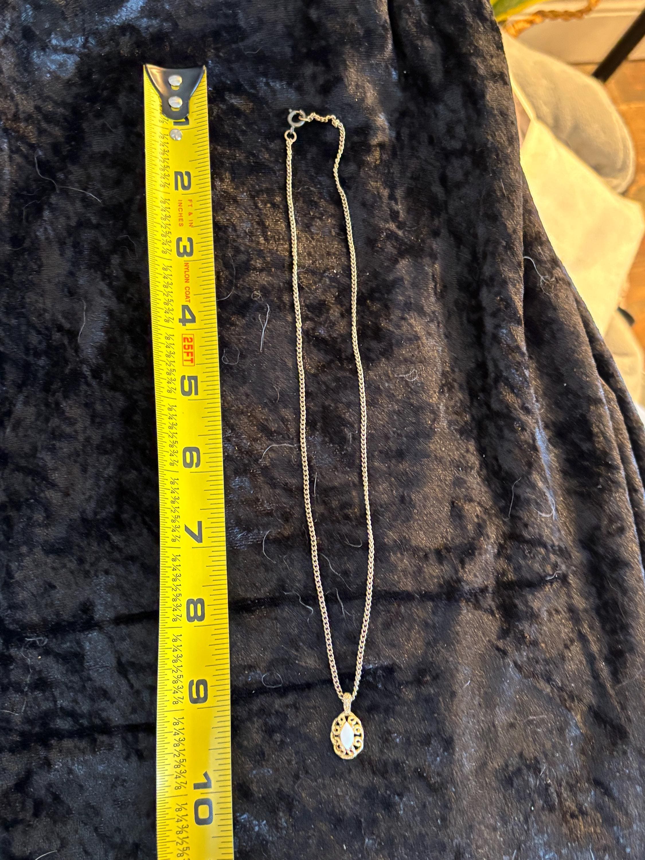 This listing is for a cute dainty filigree pendant necklace with a white stone in the middle (likely plastic). Great for layering, or on it's own as a sweet unassuming necklace. Signs of wear on the pendant, but it kind of makes it look more unique and kind of cool.