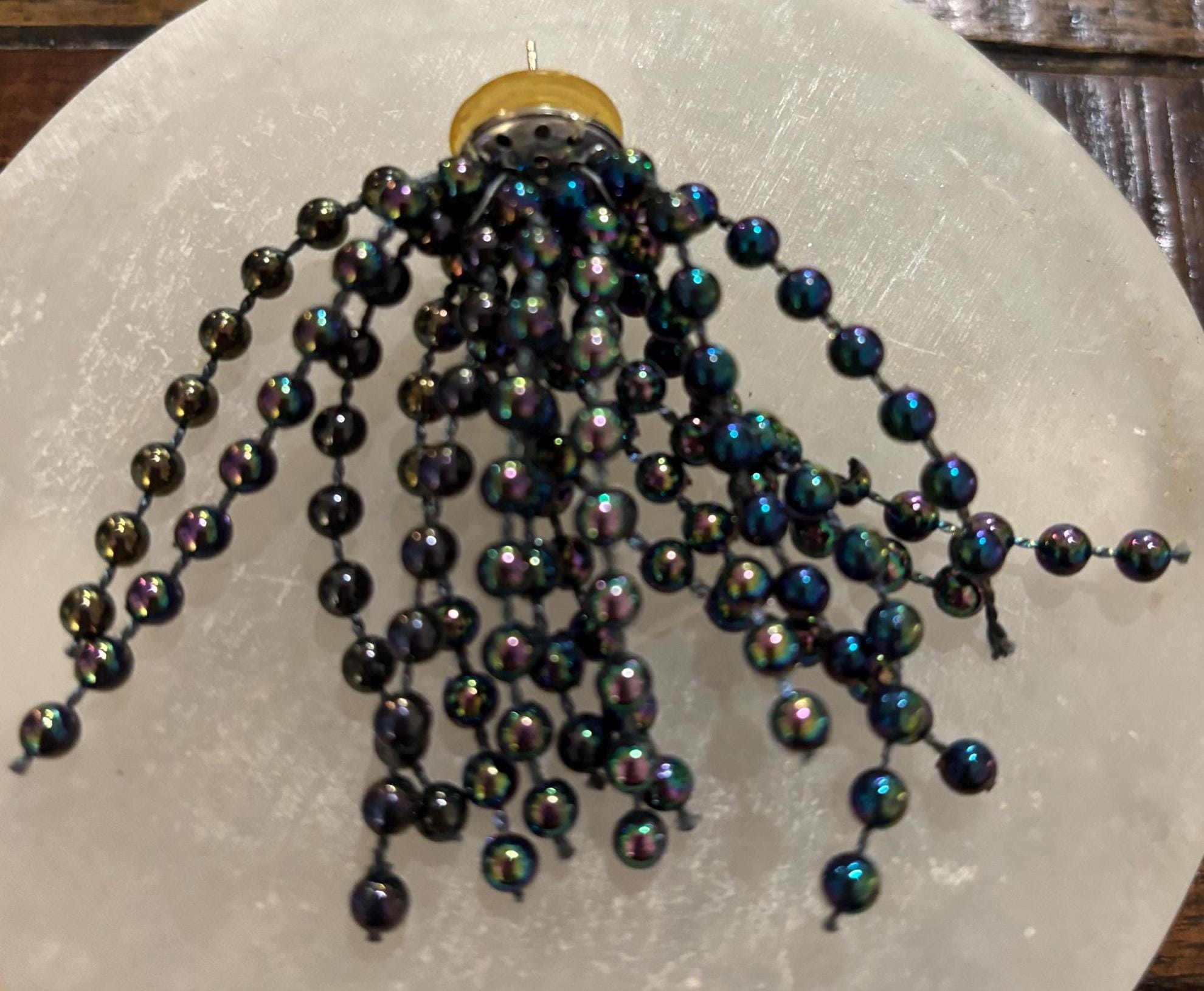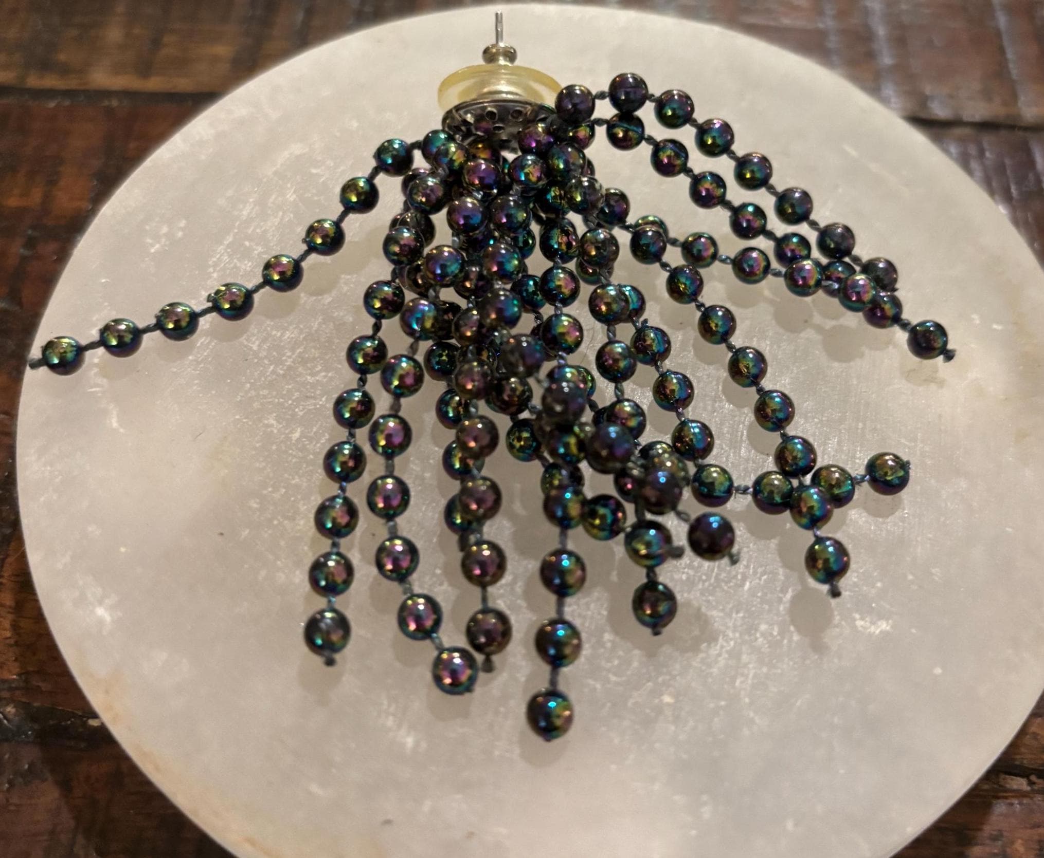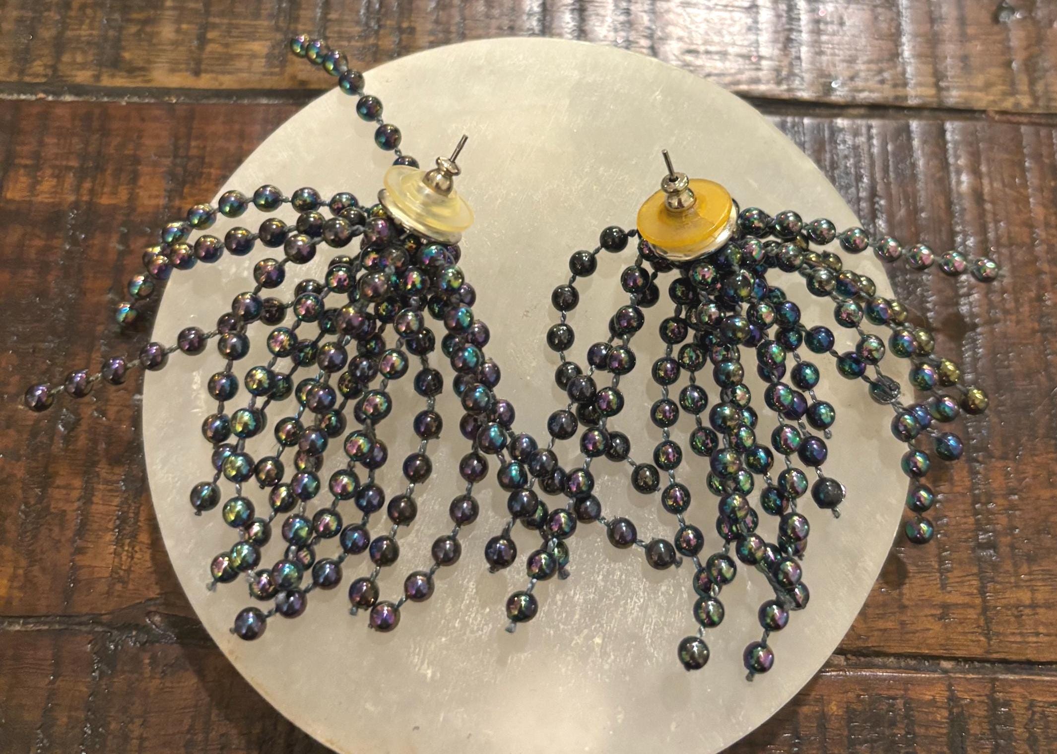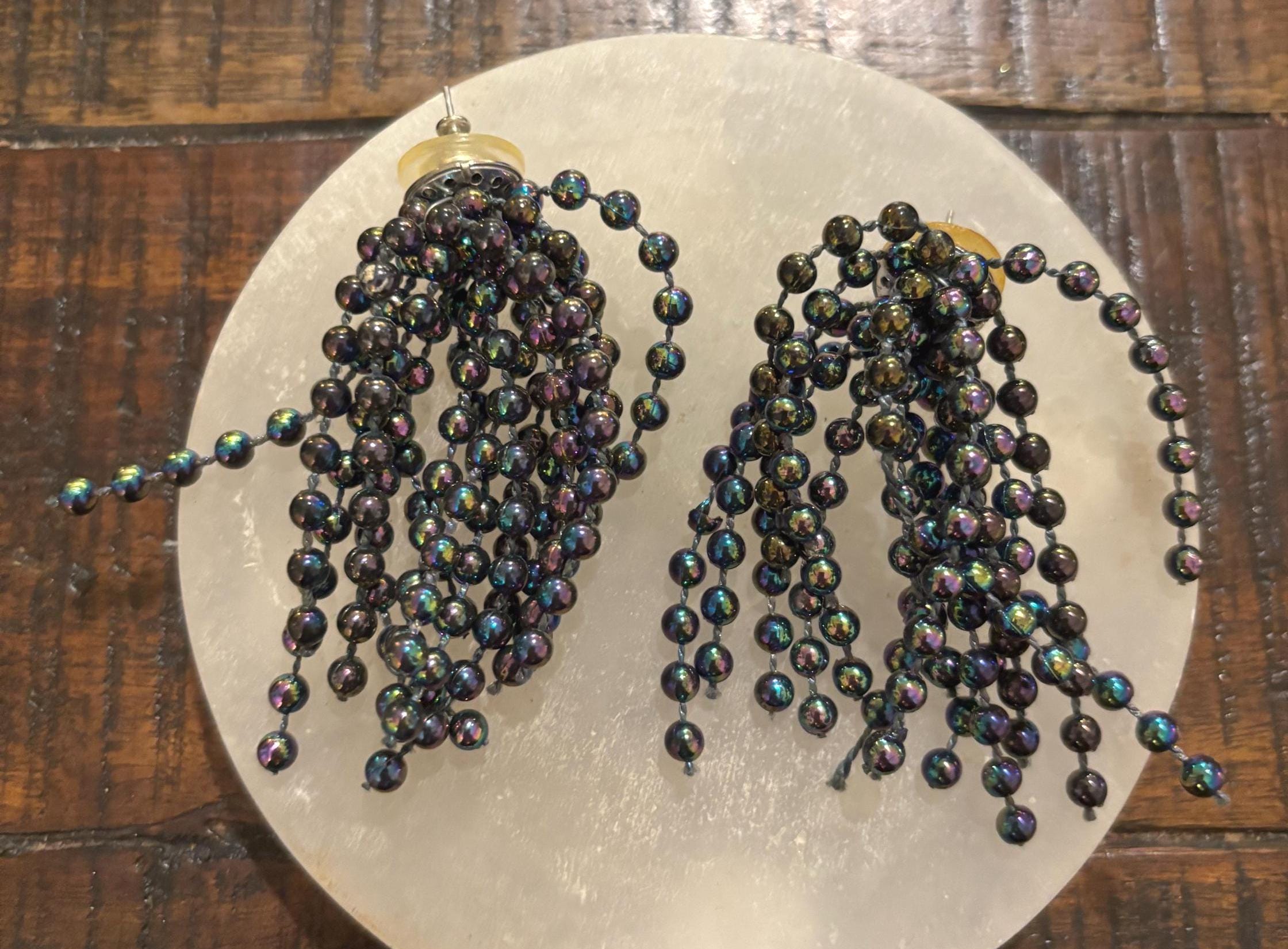 It's hard to capture how awesome these earrings are! They spray out and look like fireworks! Super cool! They are in good shape- some yellowing on the plastic backs, but those are easily replaced- or unseen behind the lobe. Great for New Year's or whenever you feel like letting your inner you BE SEEN! Very different, very neat- need a forever home. Sold as is.