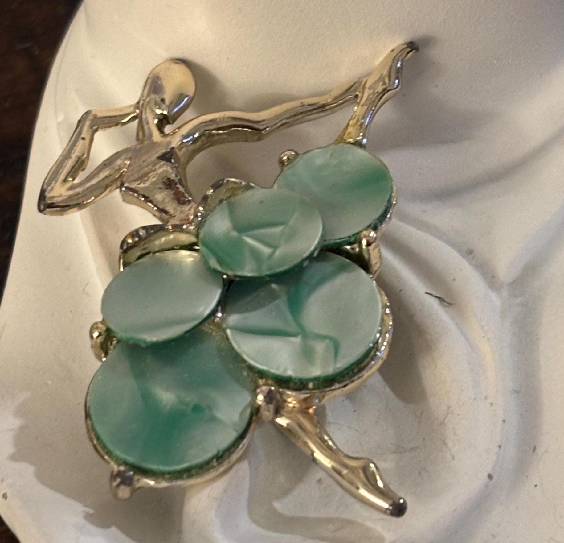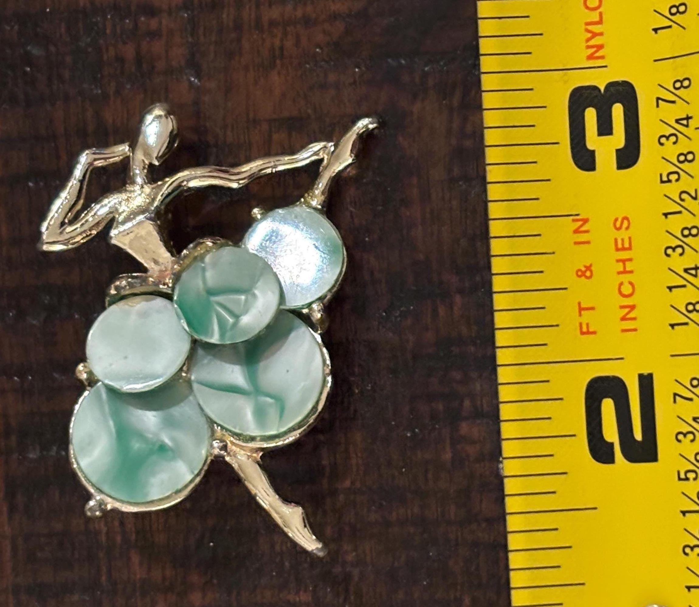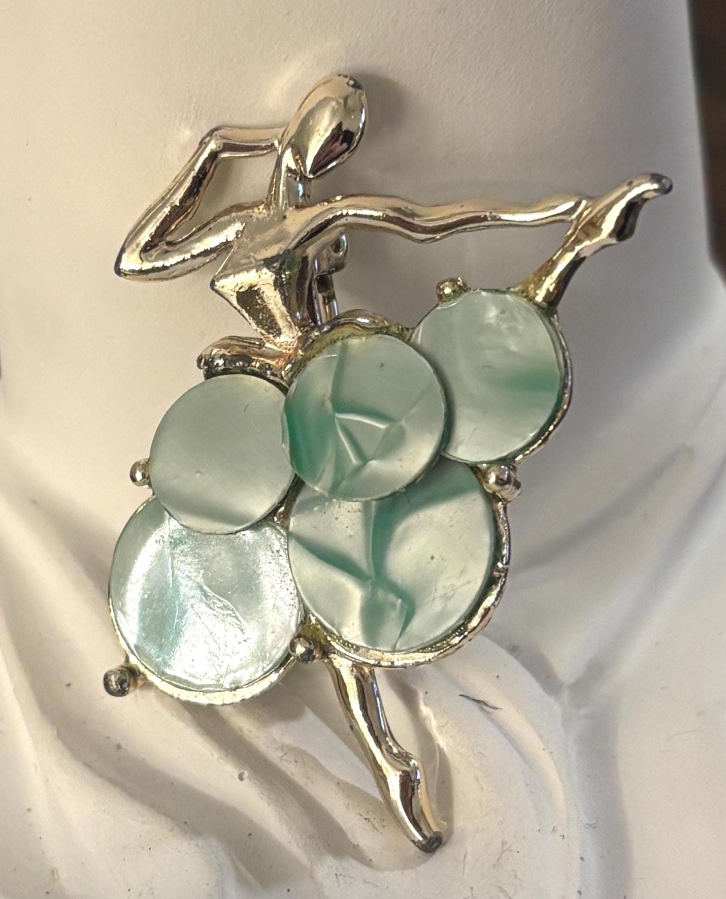 This listing is for an absolutely beautiful and unique brooch of a ballerina. The tutu is made of sea green marble styled discs, while the dancer is a bright silver tone. One of the most beautiful pieces of jewelry I've seen. Very few signs of wear, a very nice addition to a collection.
