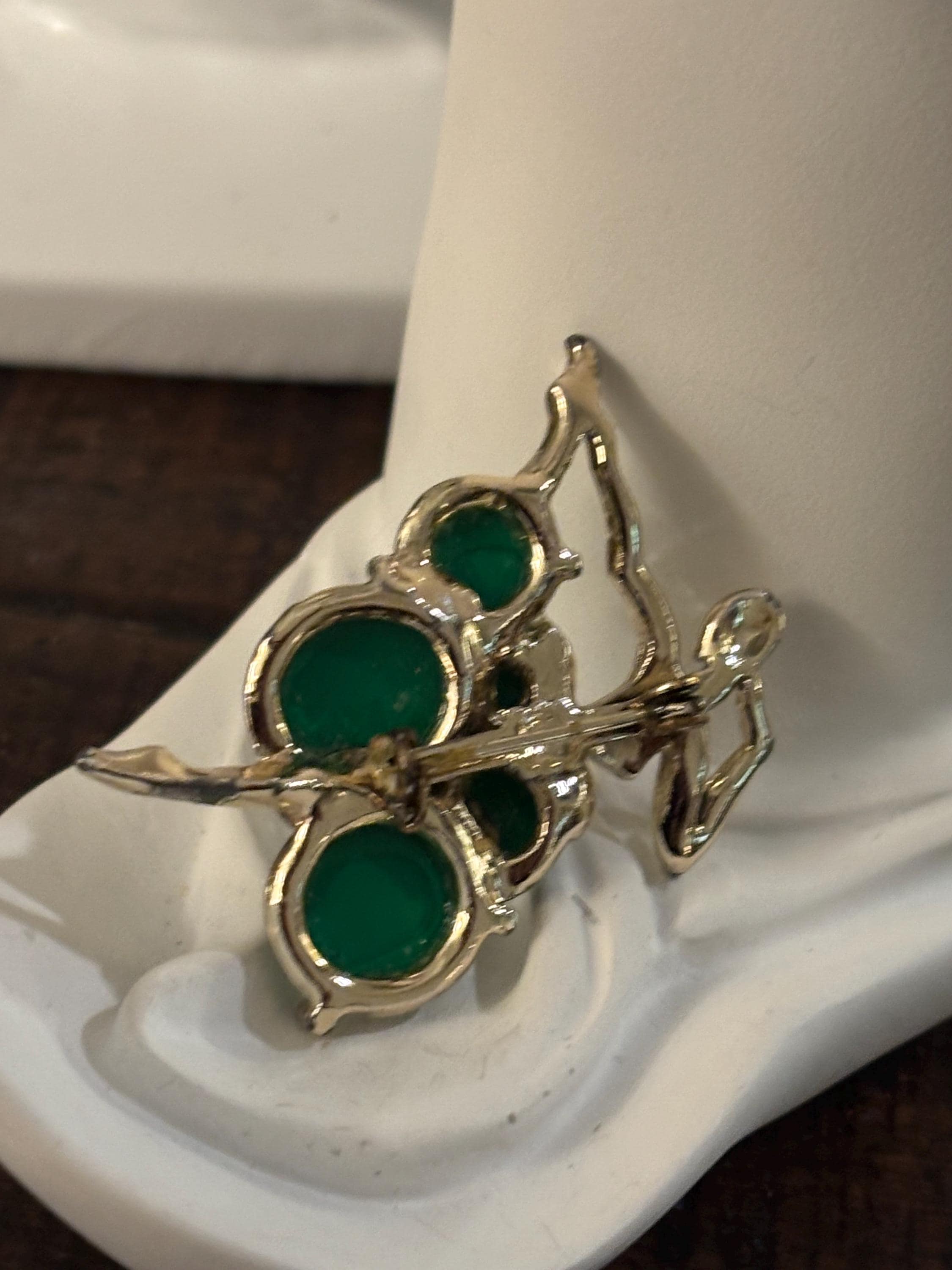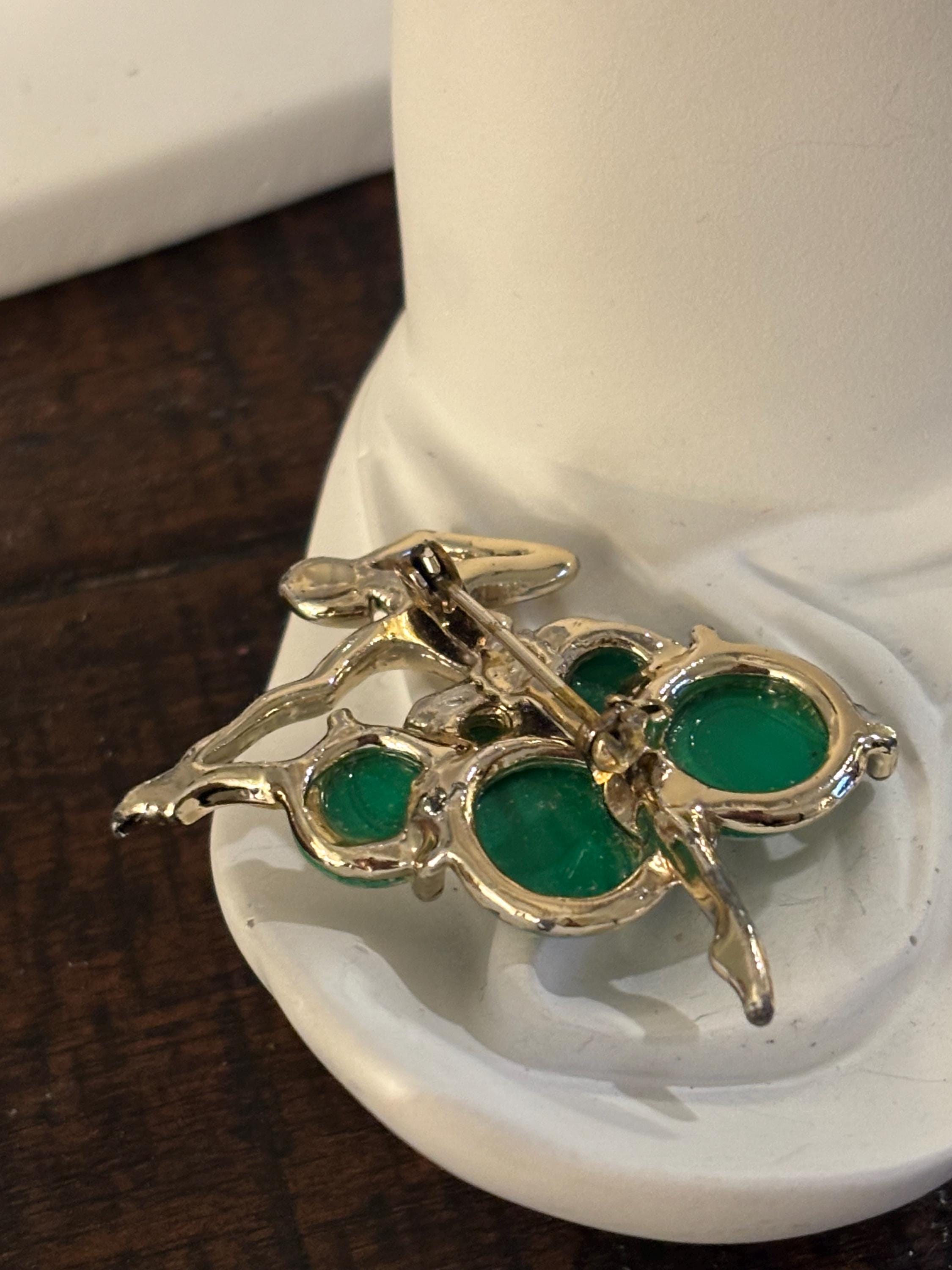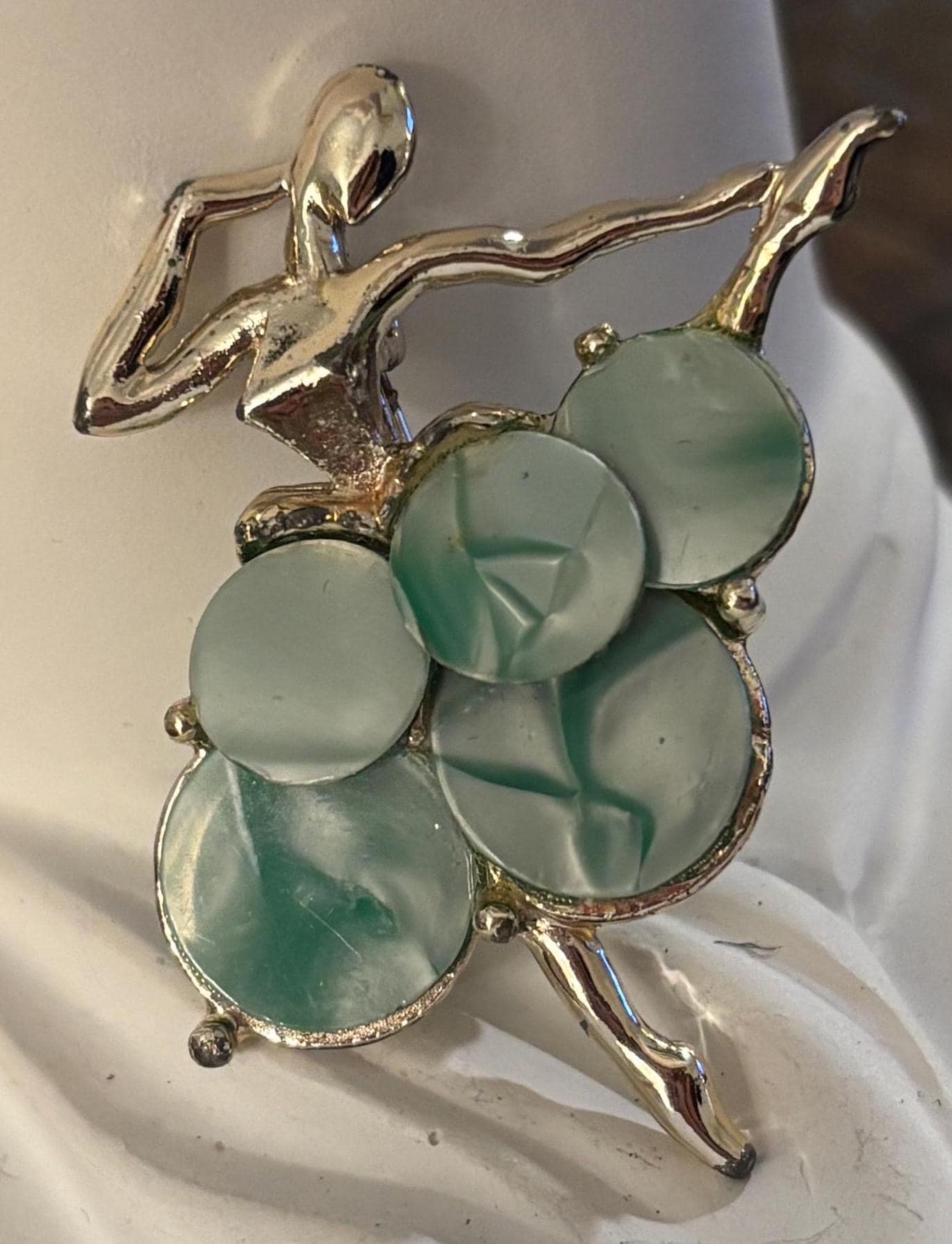 This listing is for an absolutely beautiful and unique brooch of a ballerina. The tutu is made of sea green marble styled discs, while the dancer is a bright silver tone. One of the most beautiful pieces of jewelry I've seen. Very few signs of wear, a very nice addition to a collection.