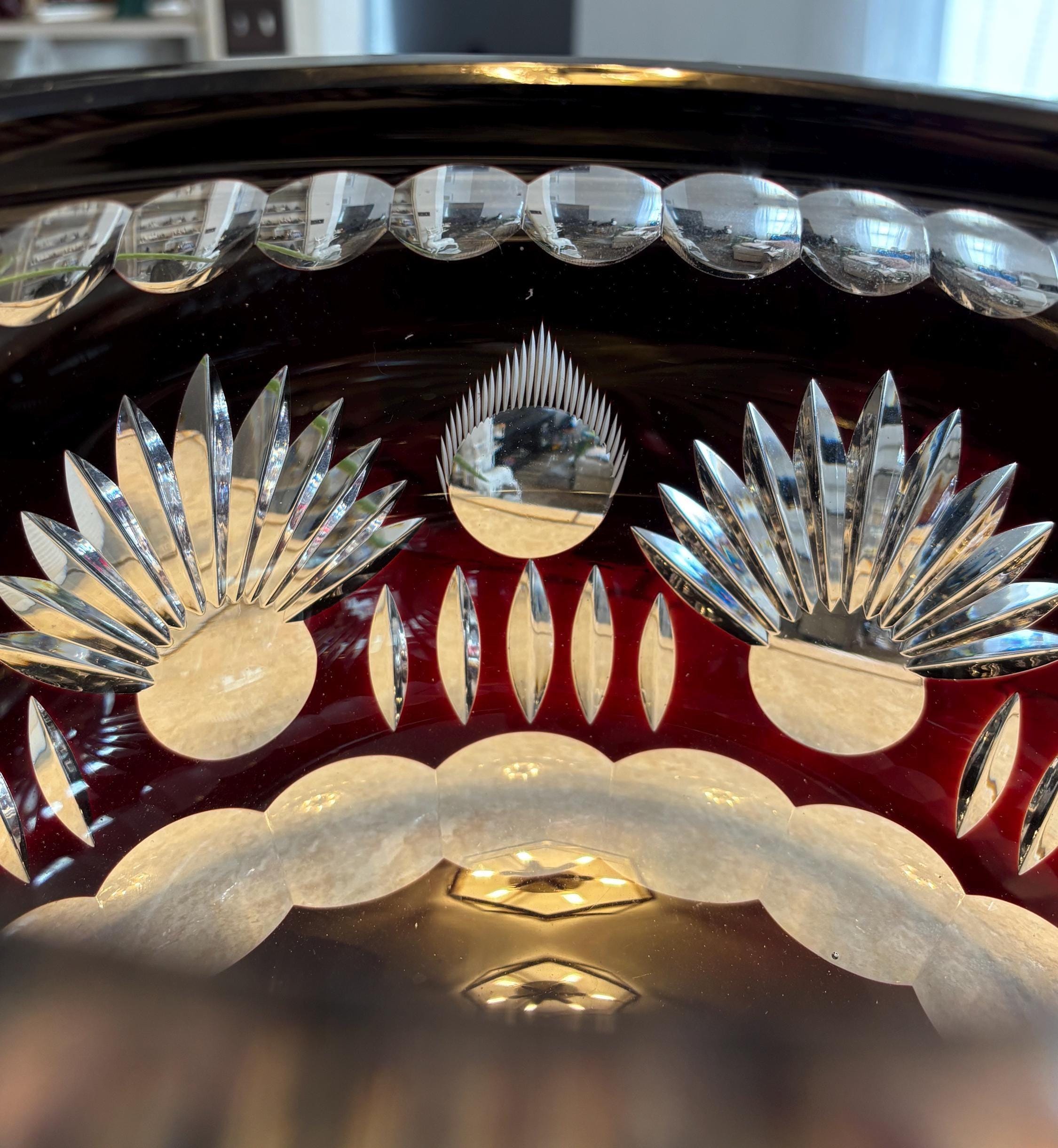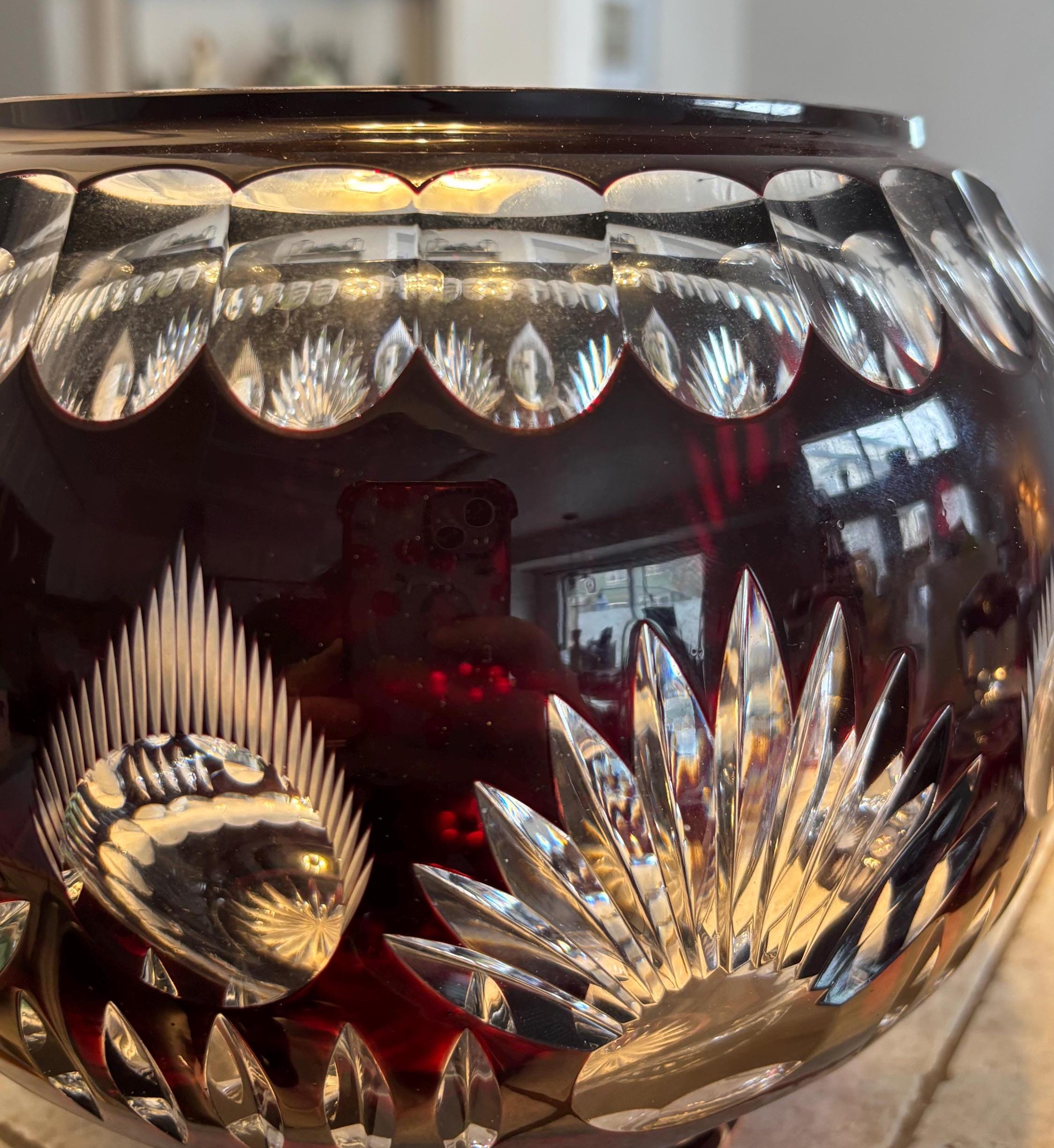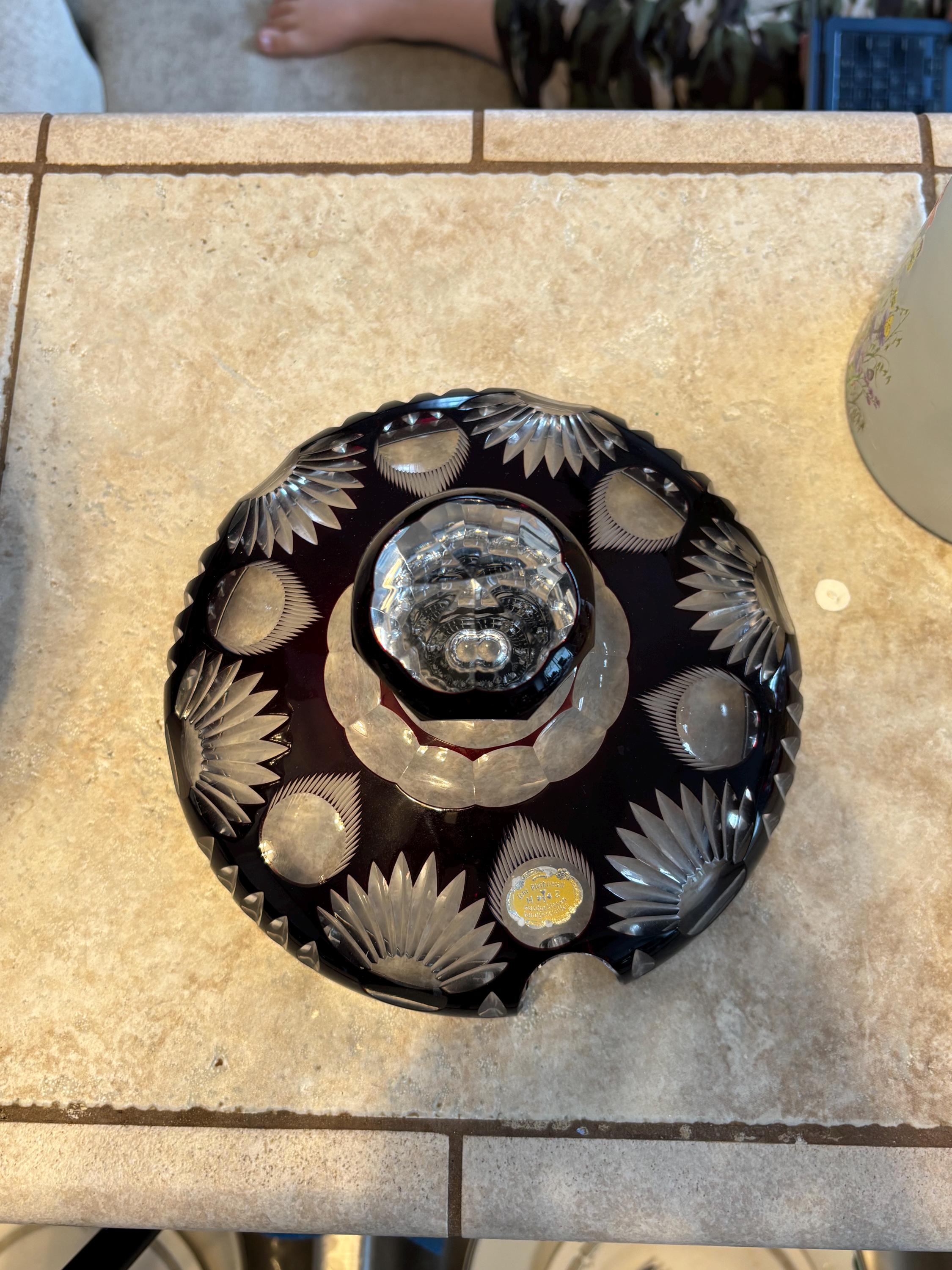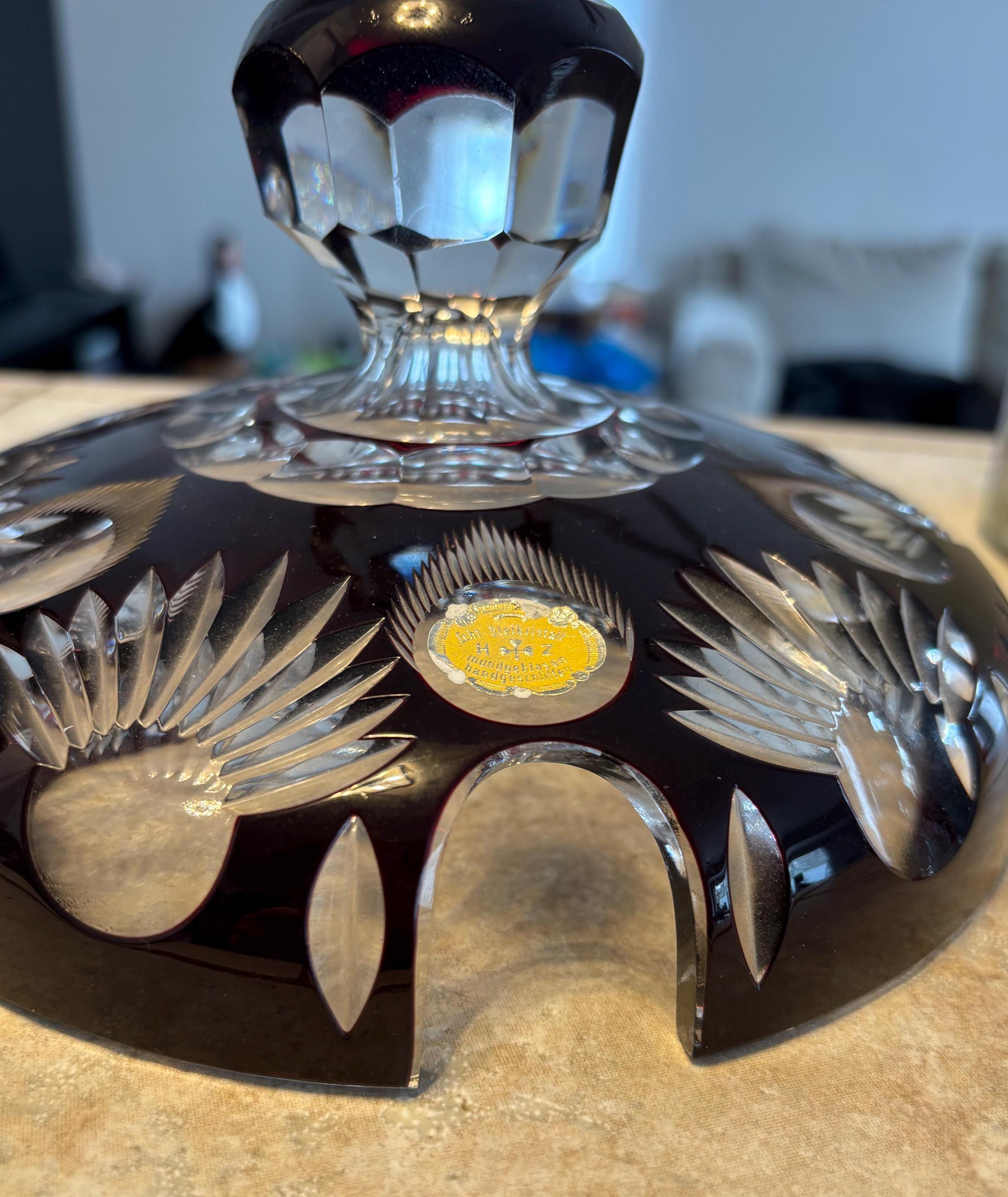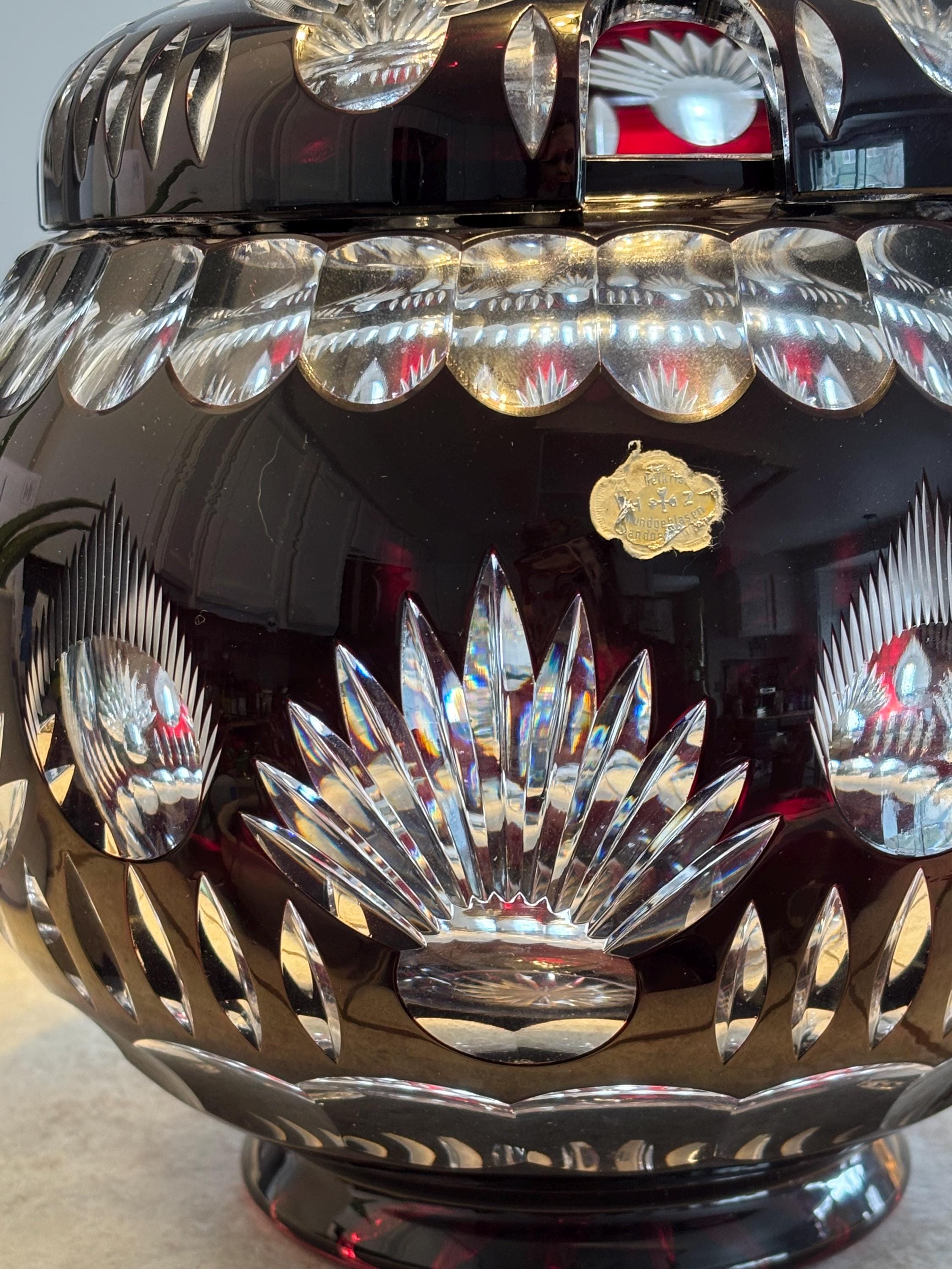 This is a large Echt Kristall large and heavy vintage red cut to clear bowl with lid. The lid has a hole for a ladle. It shows very little wear, I didn't note anything, but there may be a few signs of age here and there. It's absolutely beautiful!!