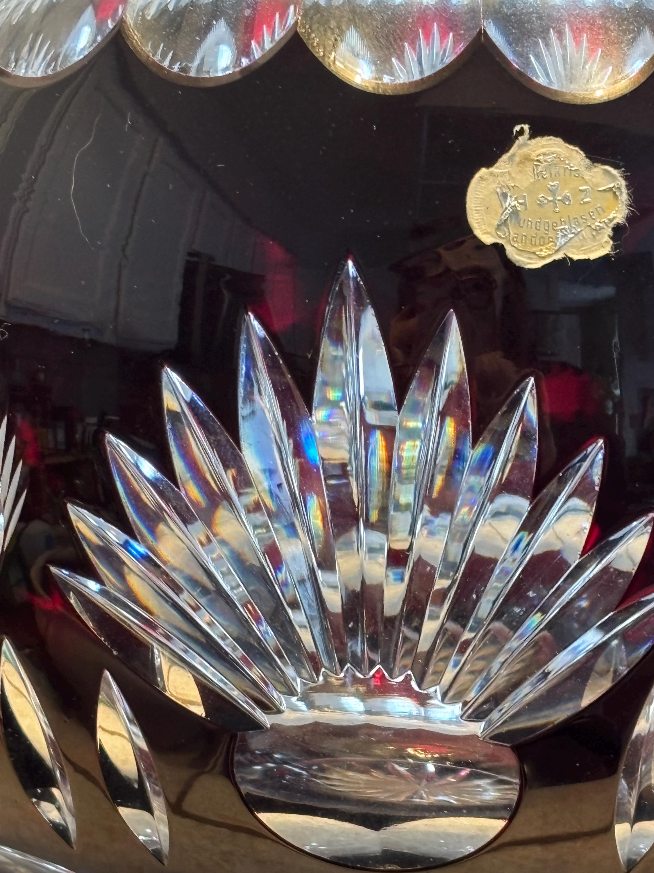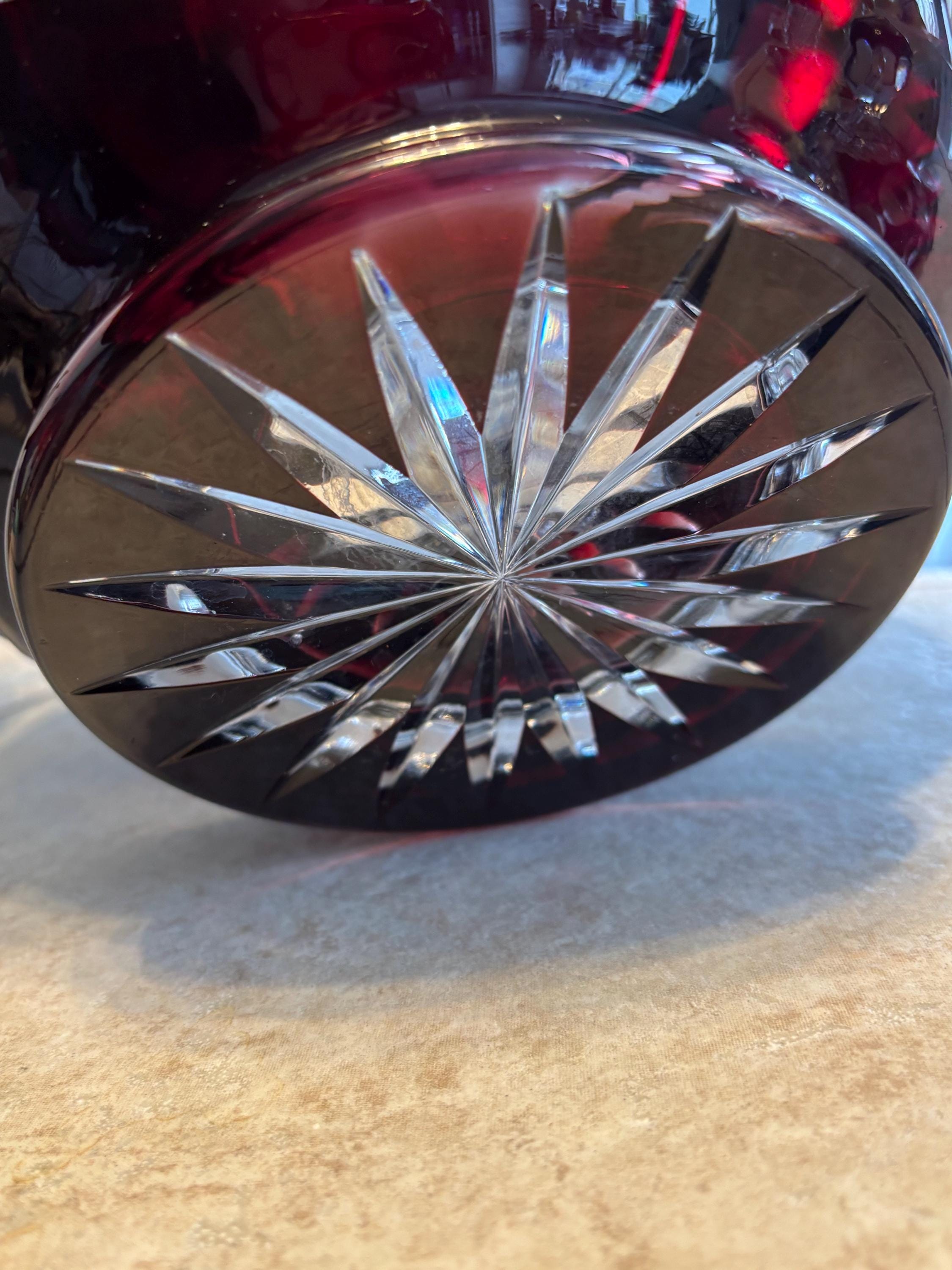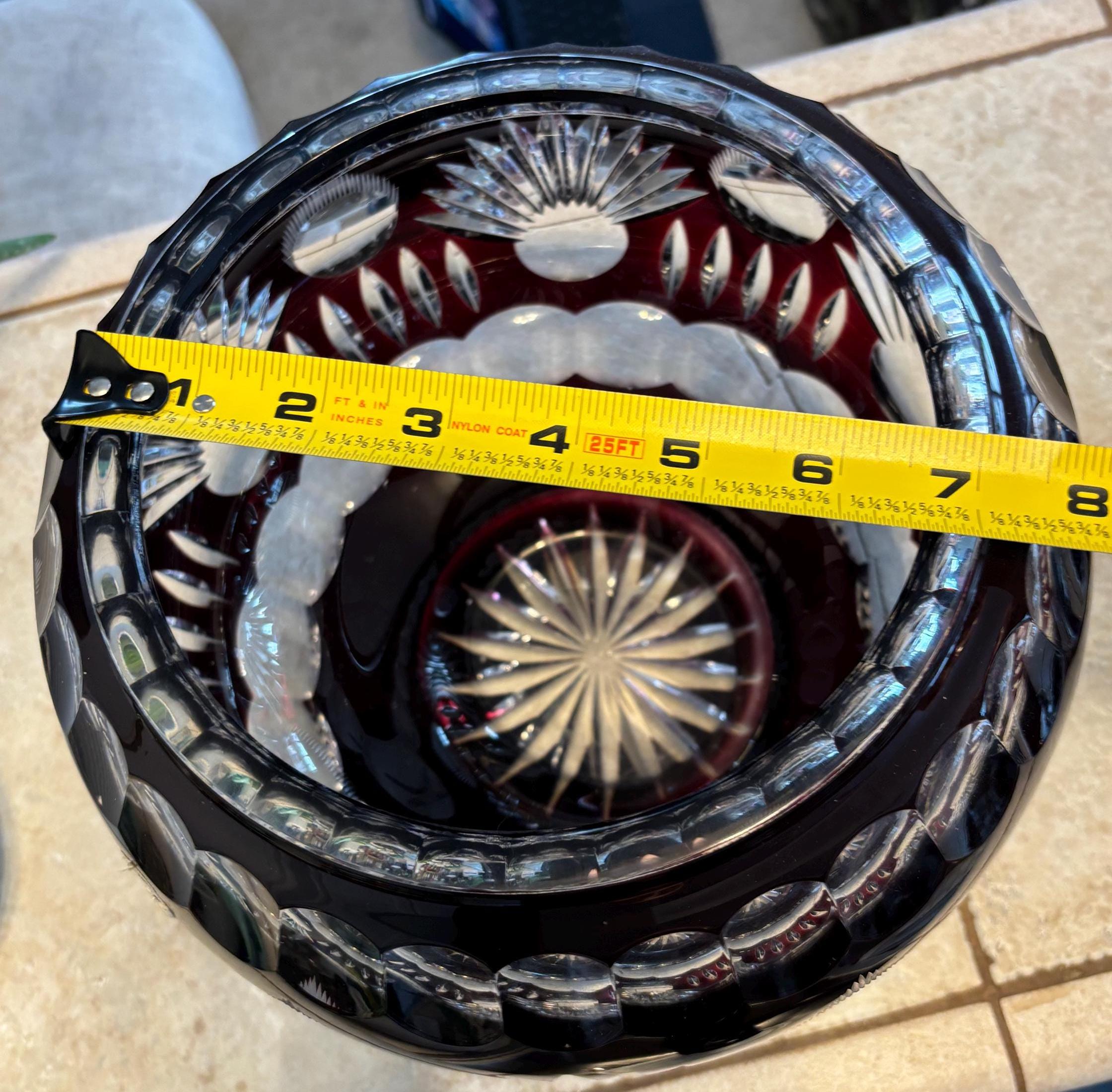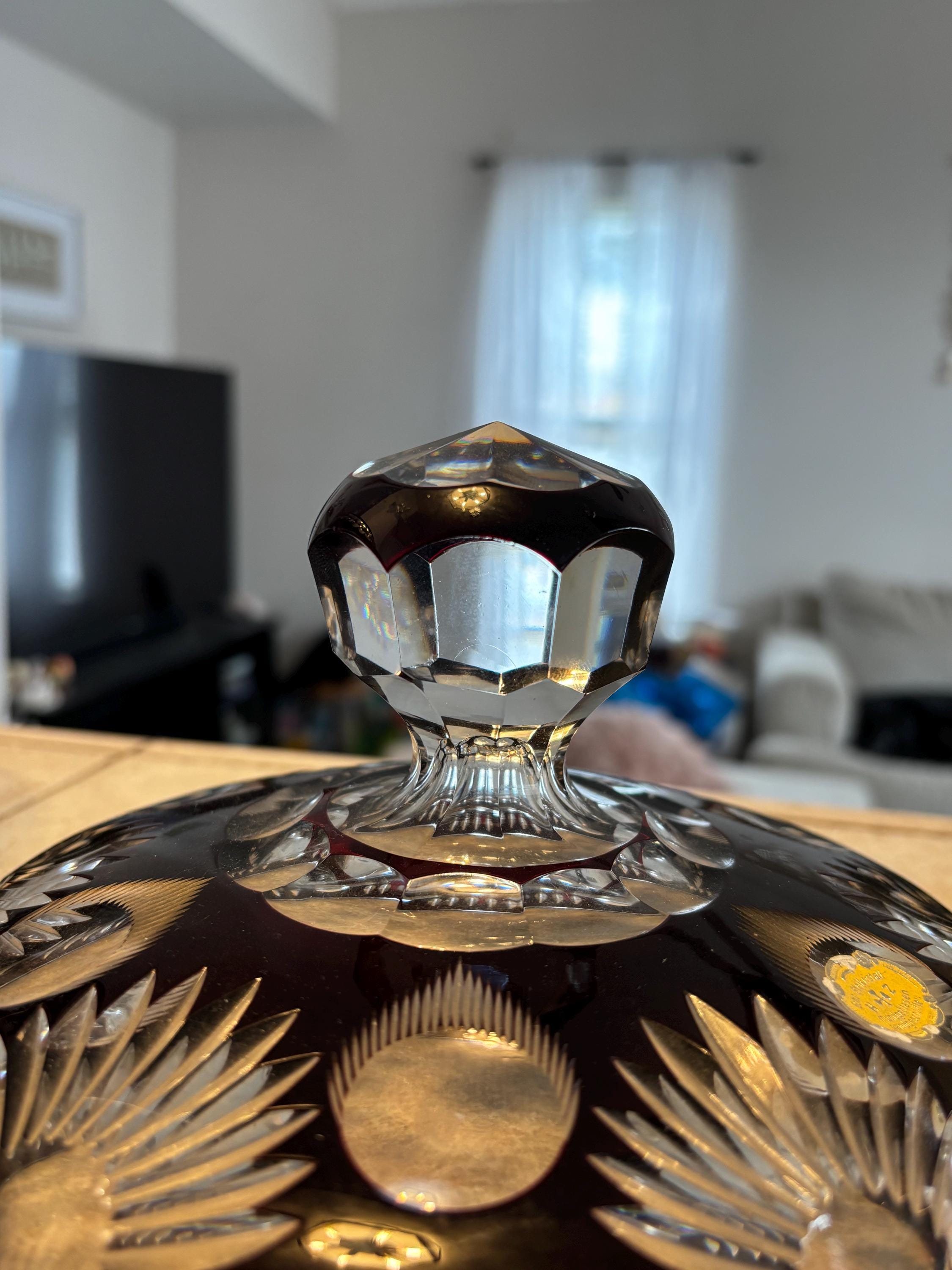 This is a large Echt Kristall large and heavy vintage red cut to clear bowl with lid. The lid has a hole for a ladle. It shows very little wear, I didn't note anything, but there may be a few signs of age here and there. It's absolutely beautiful!!