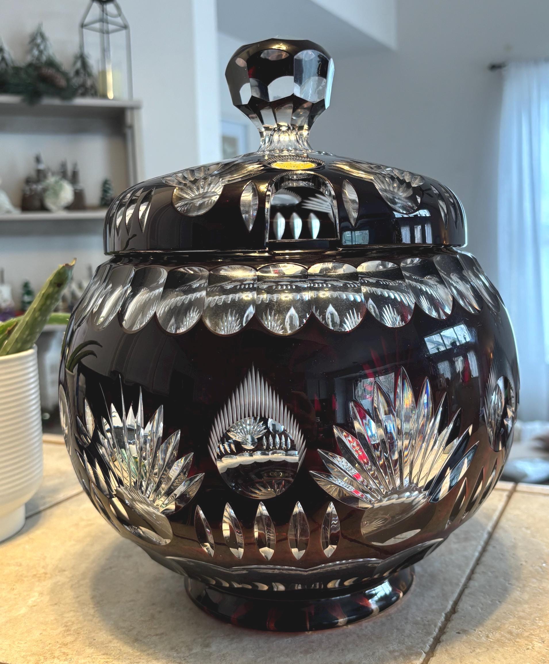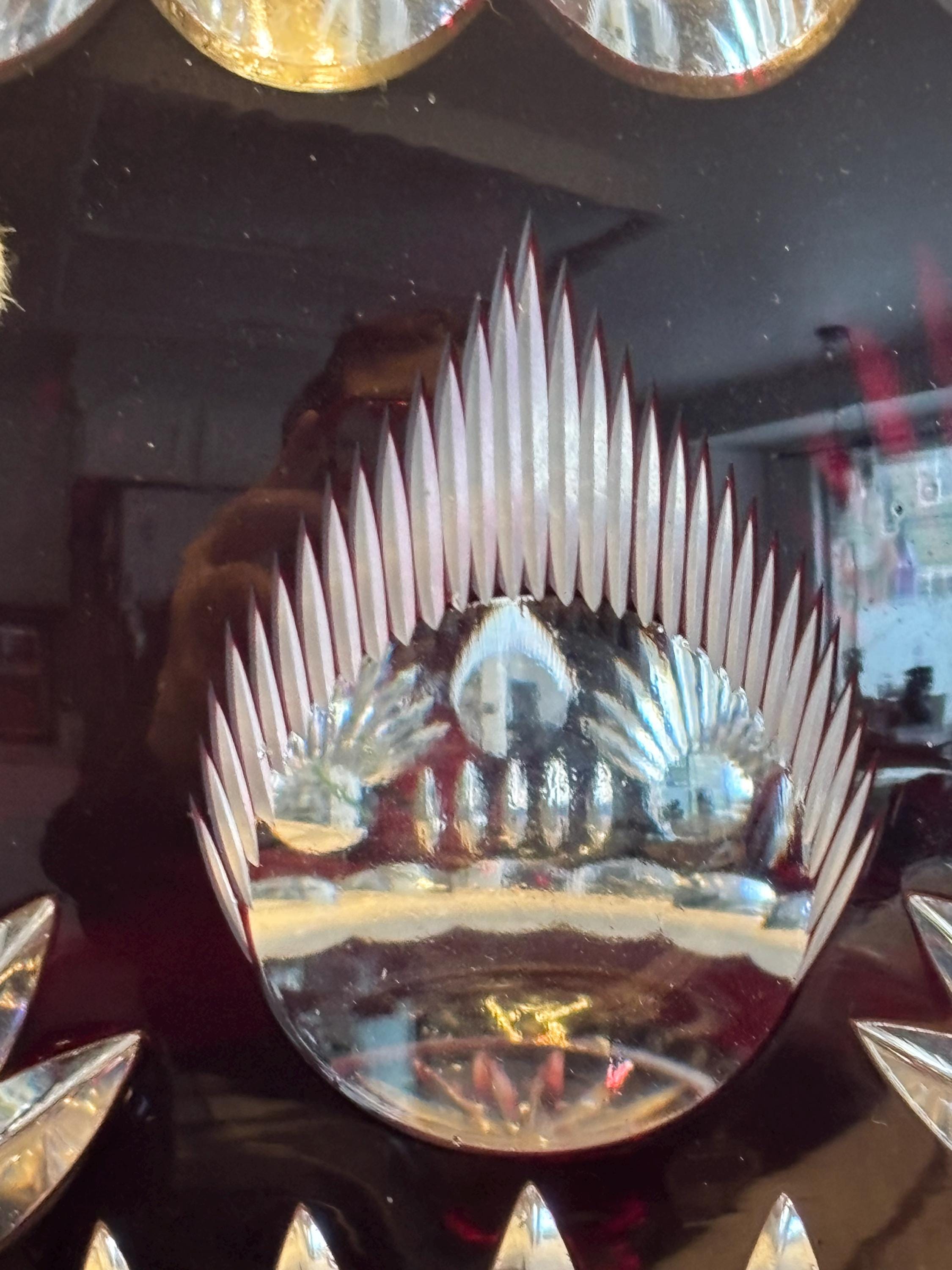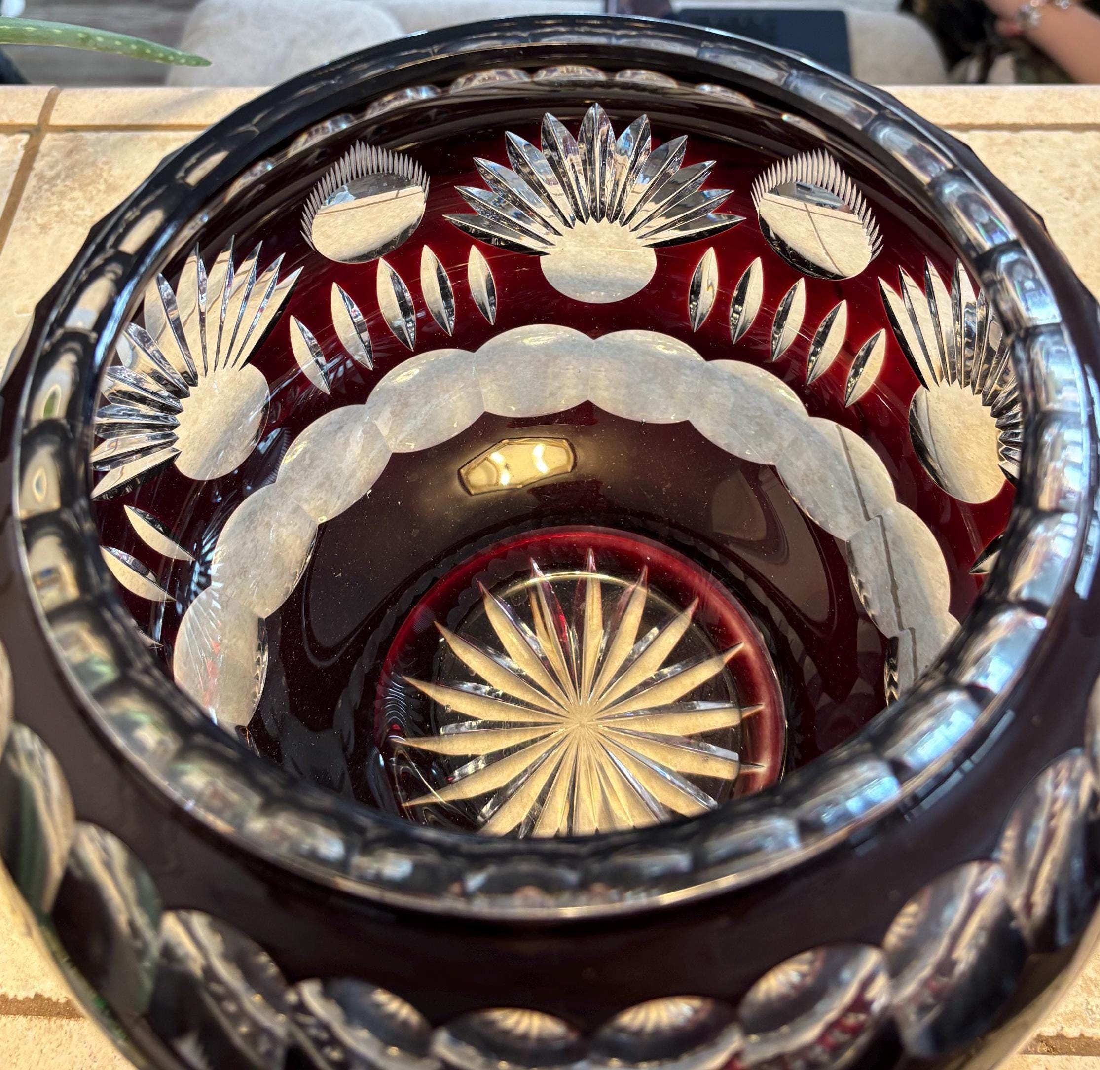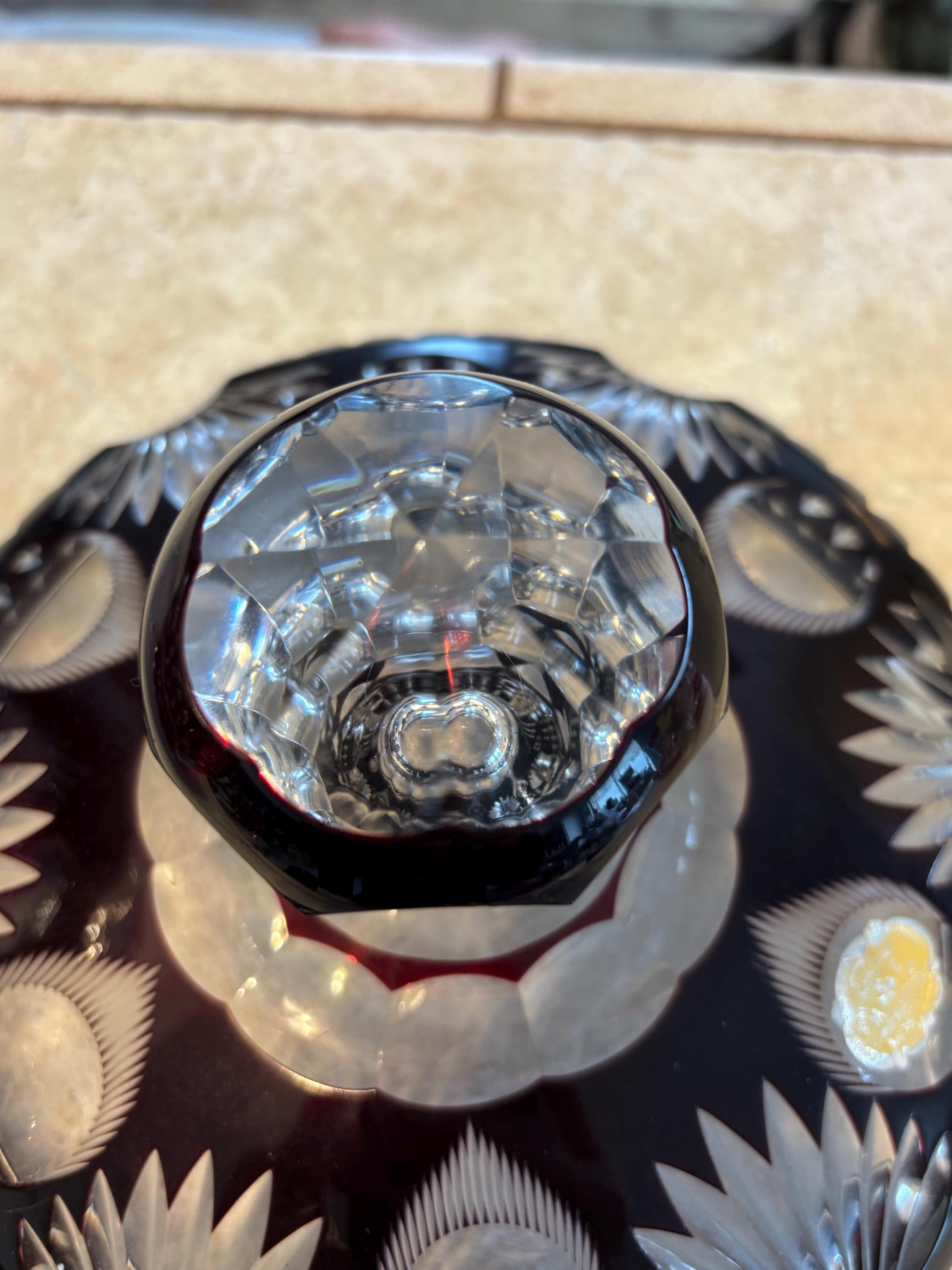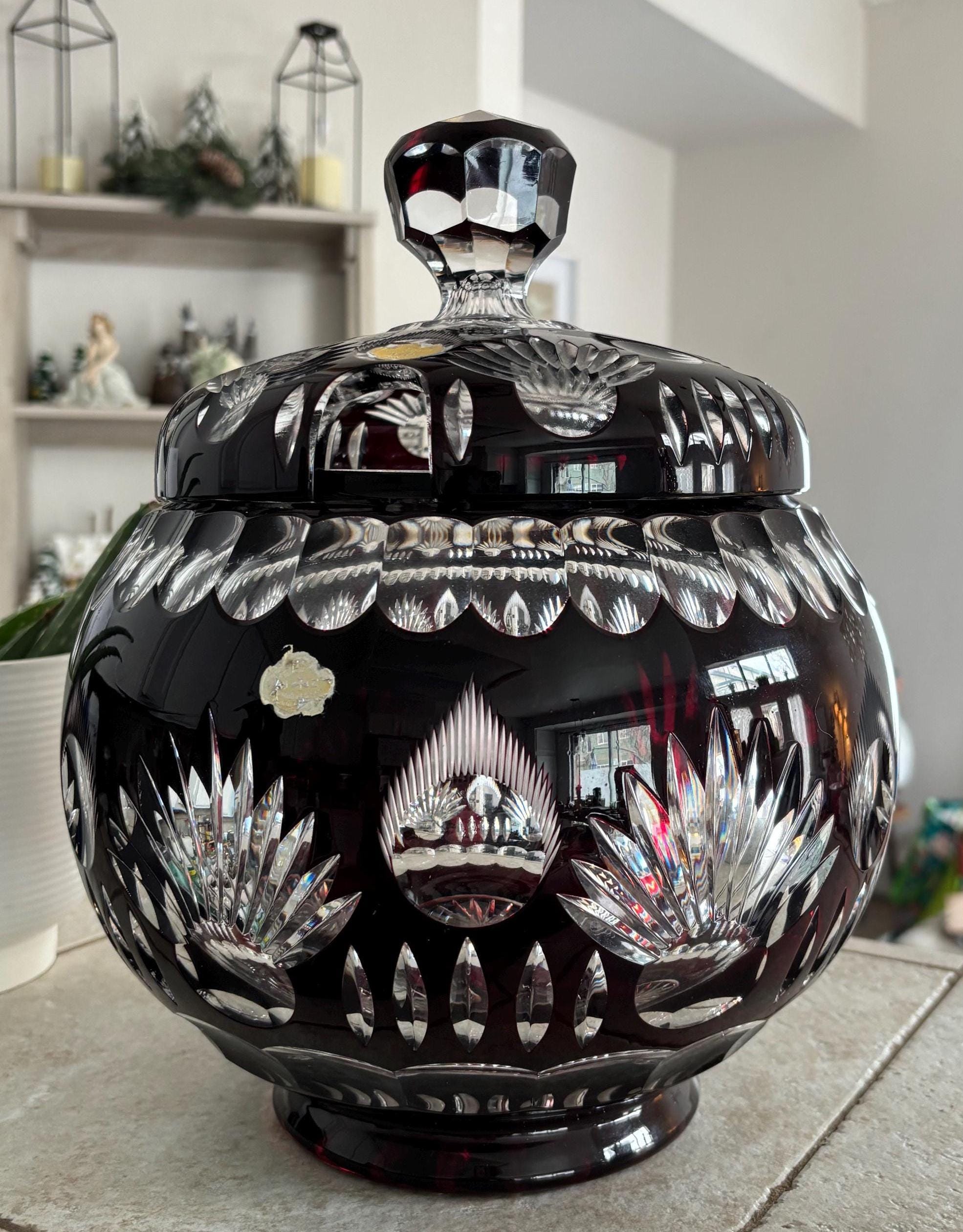 This is a large Echt Kristall large and heavy vintage red cut to clear bowl with lid. The lid has a hole for a ladle. It shows very little wear, I didn't note anything, but there may be a few signs of age here and there. It's absolutely beautiful!!