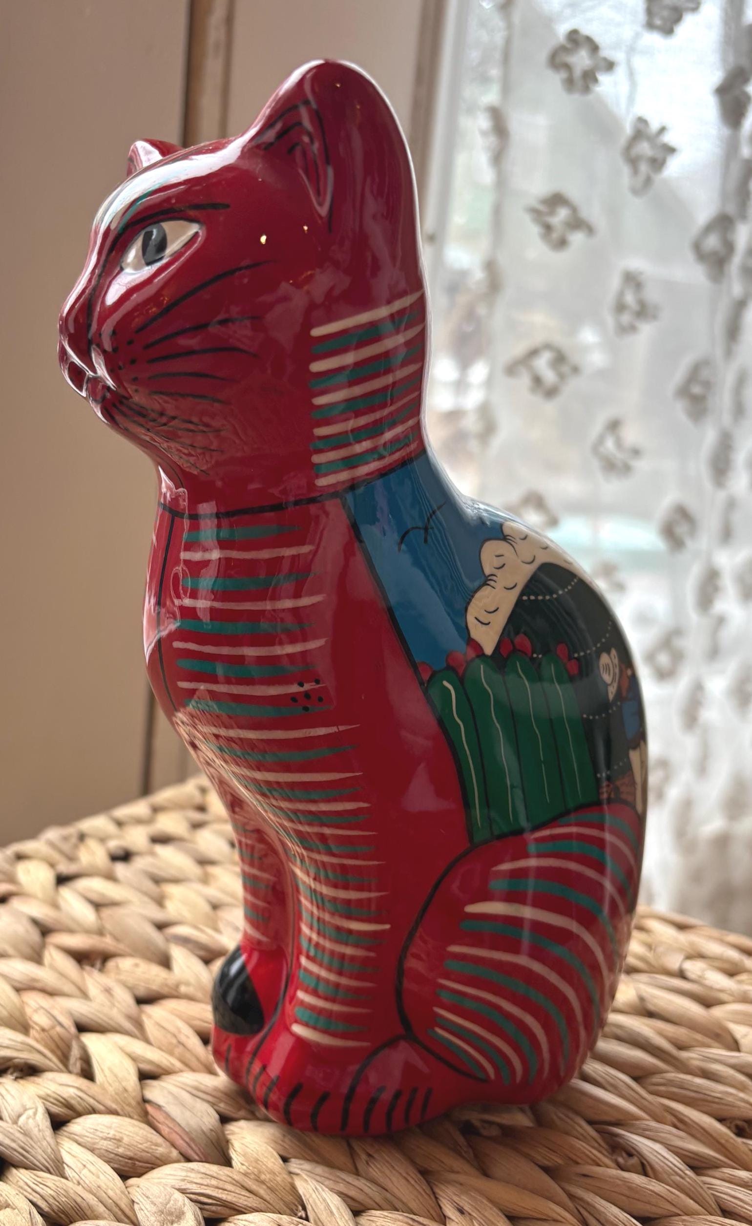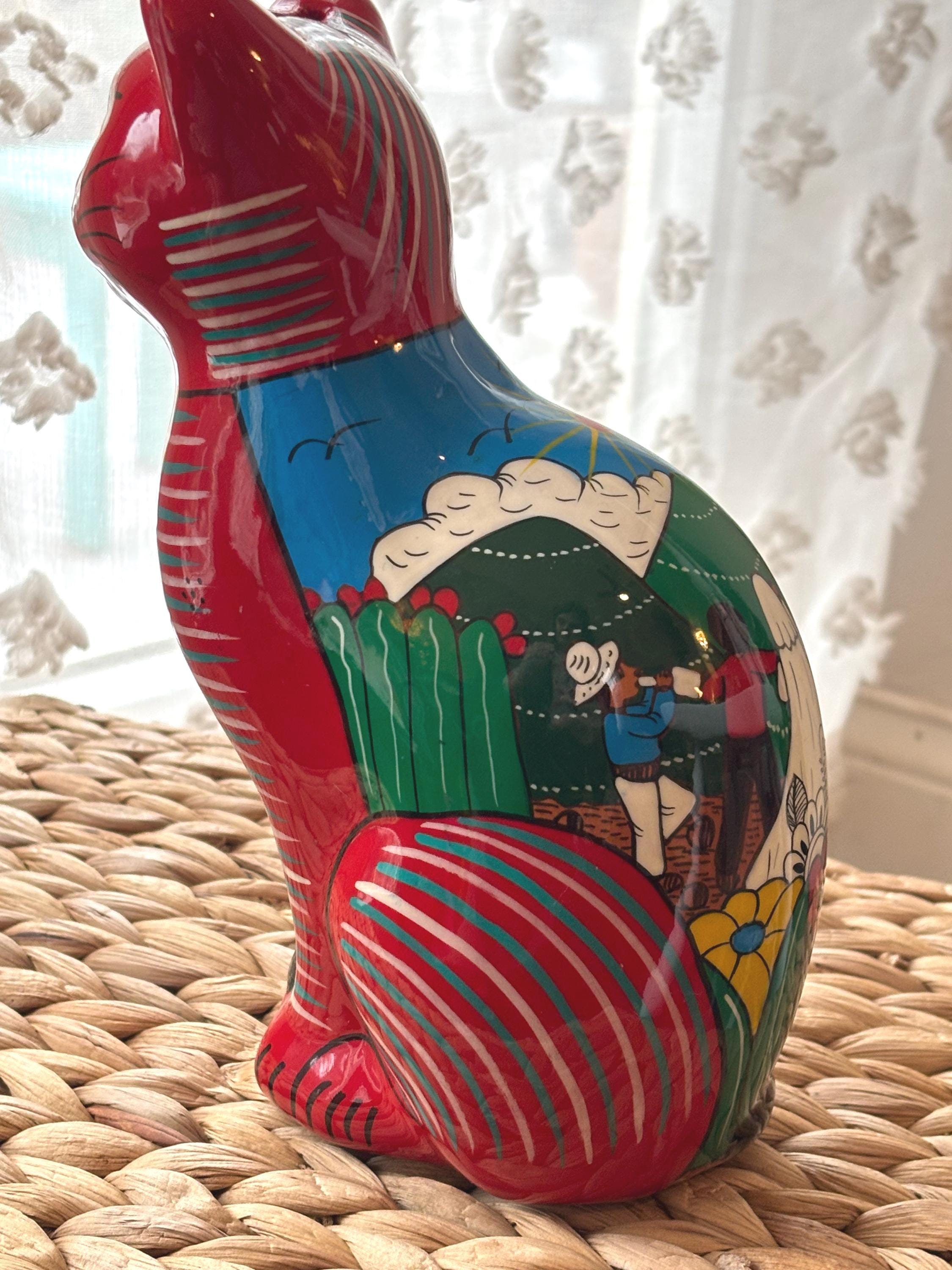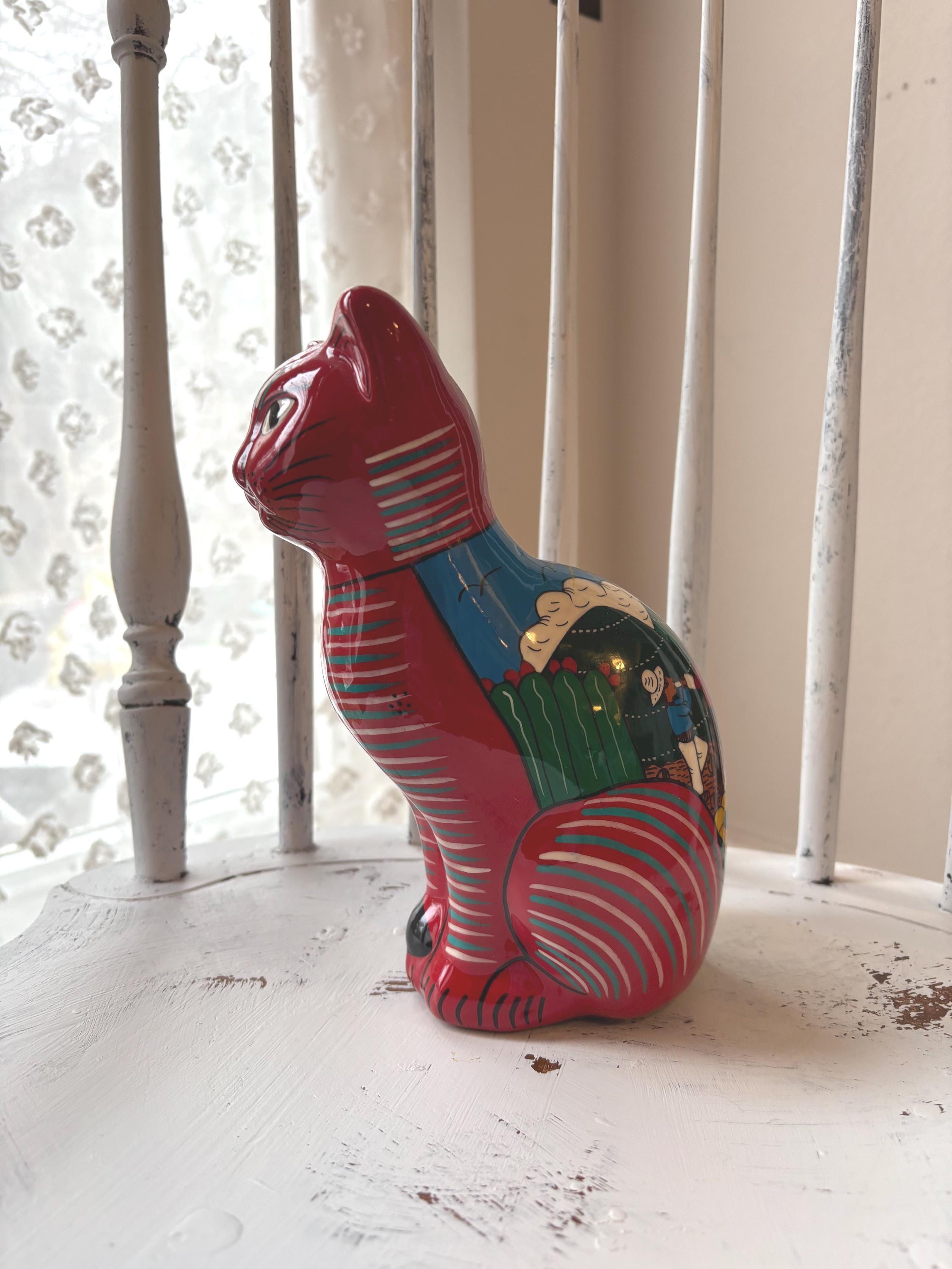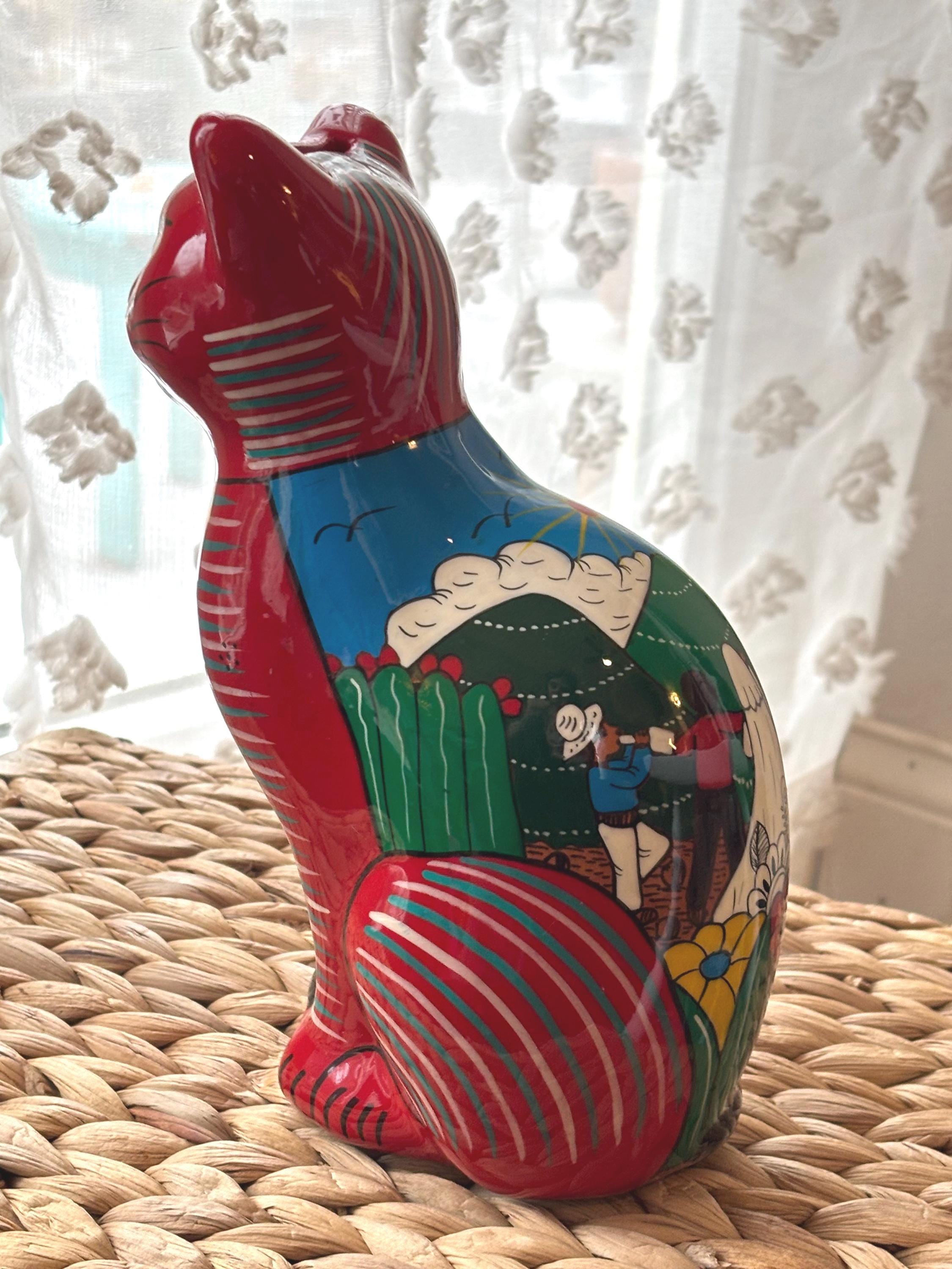 This vintage cat coin bank, hand painted and made in Mexico, features a unique design that will surely appeal to cat lovers and collectors alike. The bank has a really cute and touching scene of a wedding on the back. Very unique and a really cool figurine and coin bank. Just a really, really neat one of a kind piece.