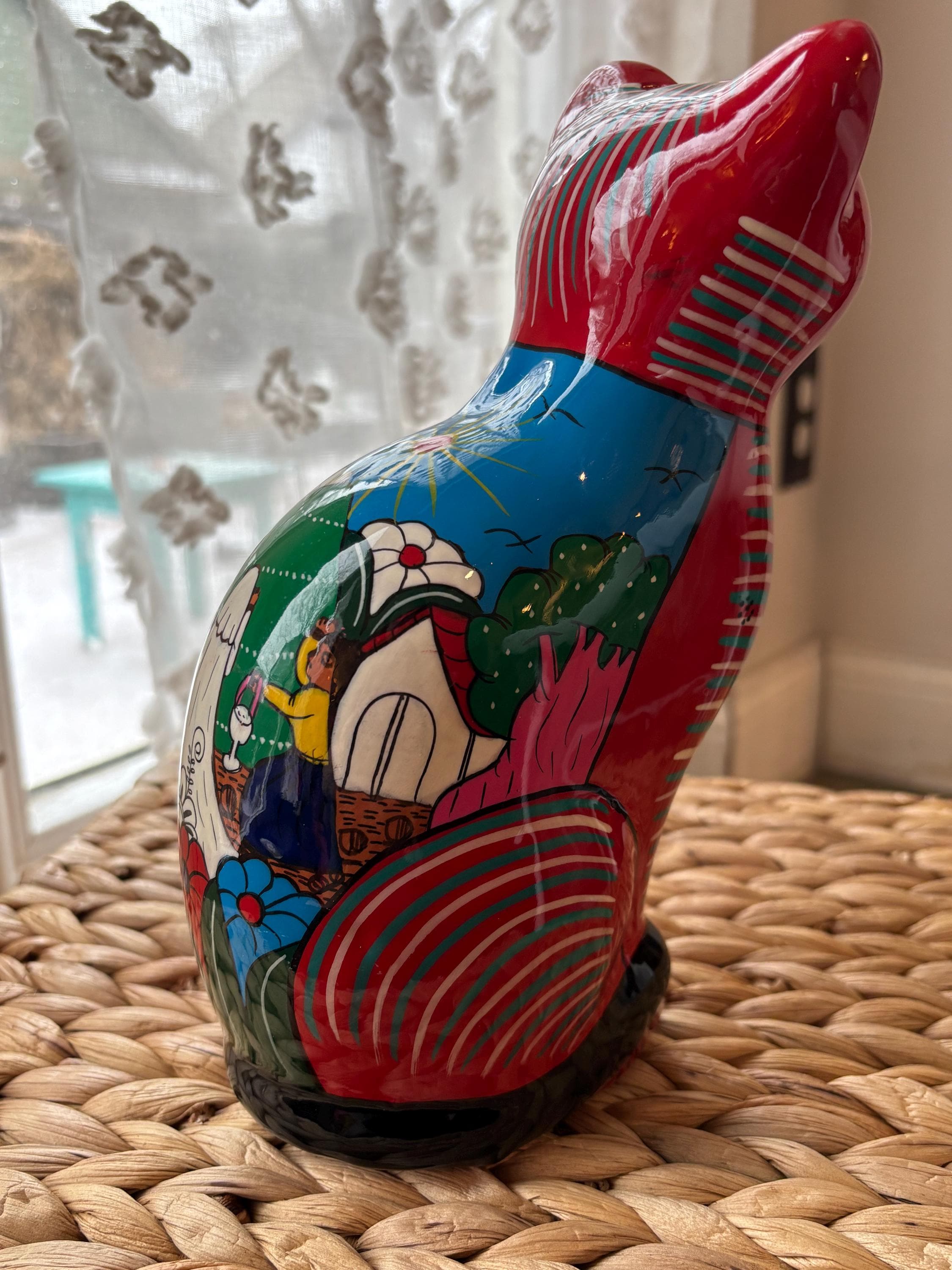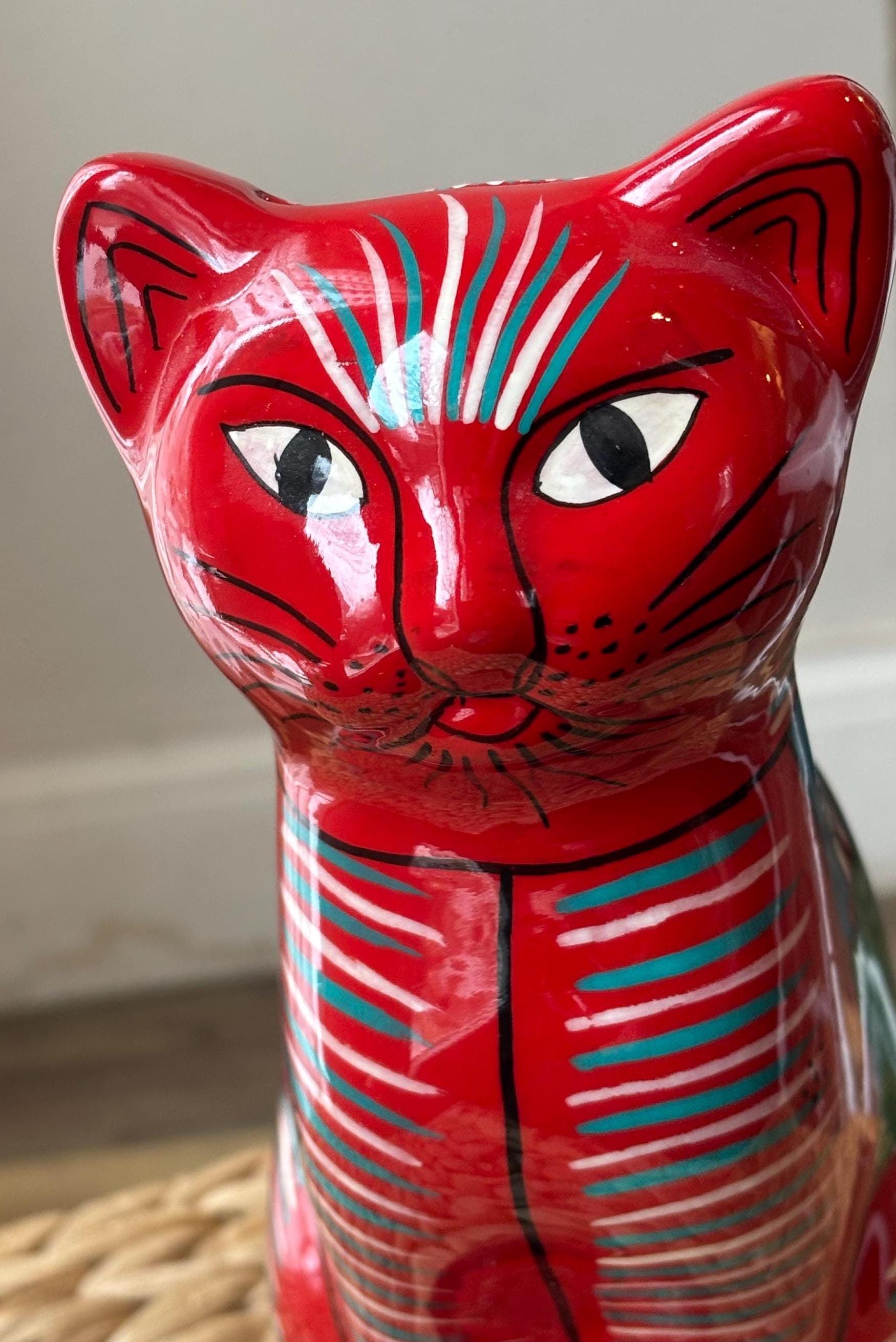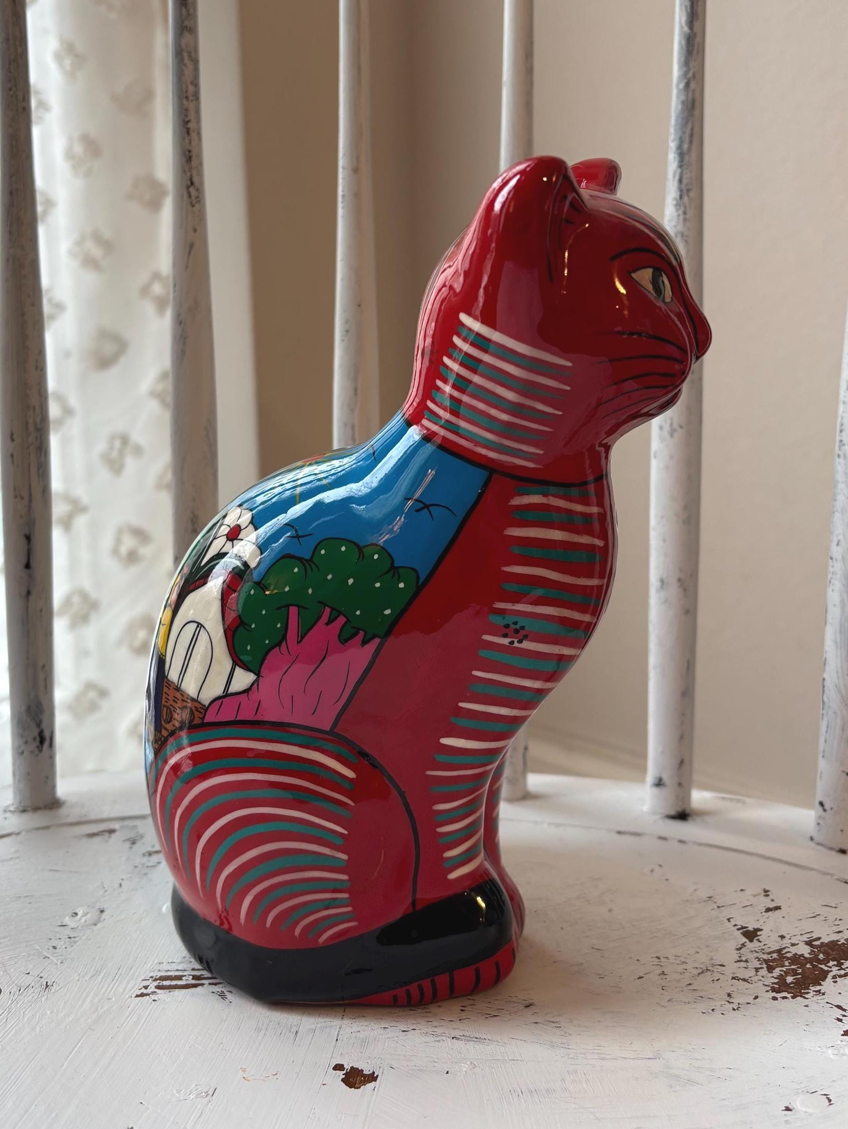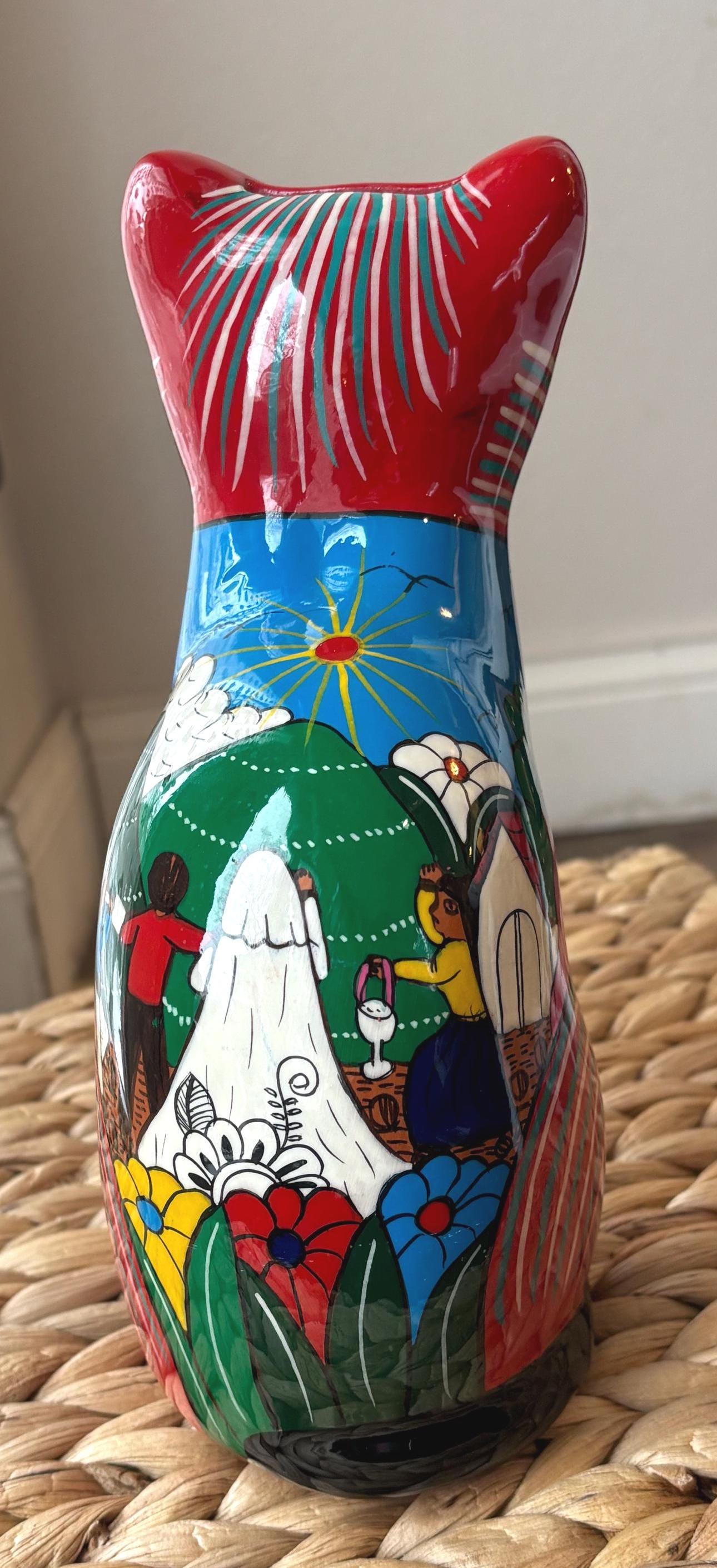 This vintage cat coin bank, hand painted and made in Mexico, features a unique design that will surely appeal to cat lovers and collectors alike. The bank has a really cute and touching scene of a wedding on the back. Very unique and a really cool figurine and coin bank. Just a really, really neat one of a kind piece.