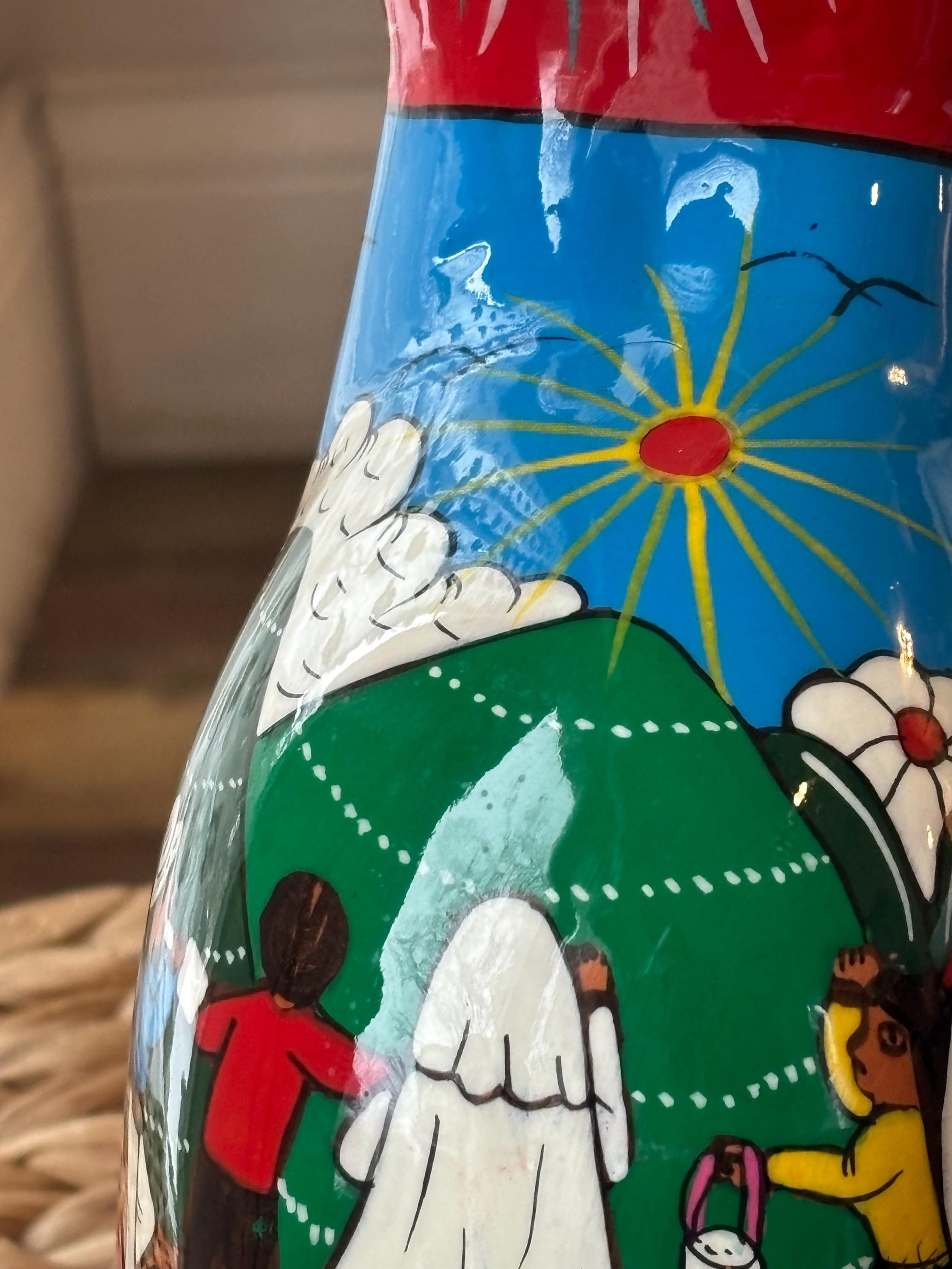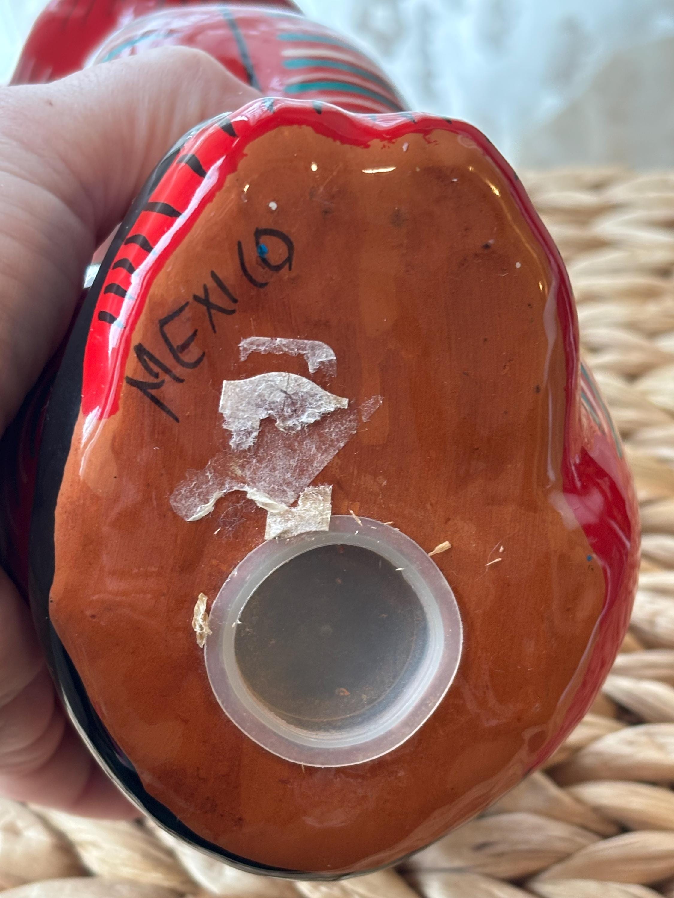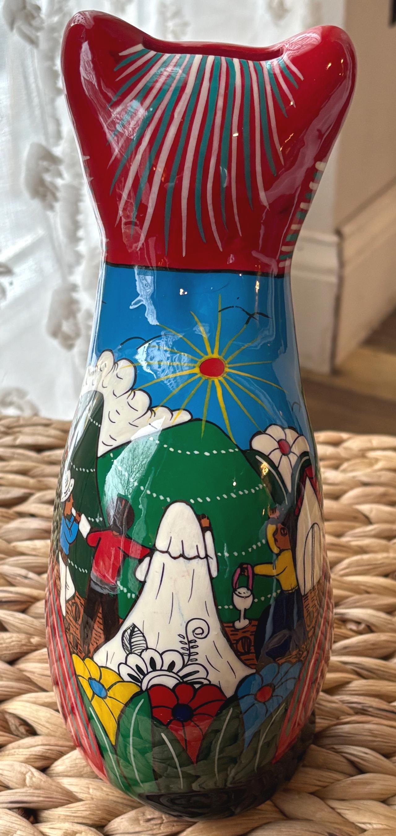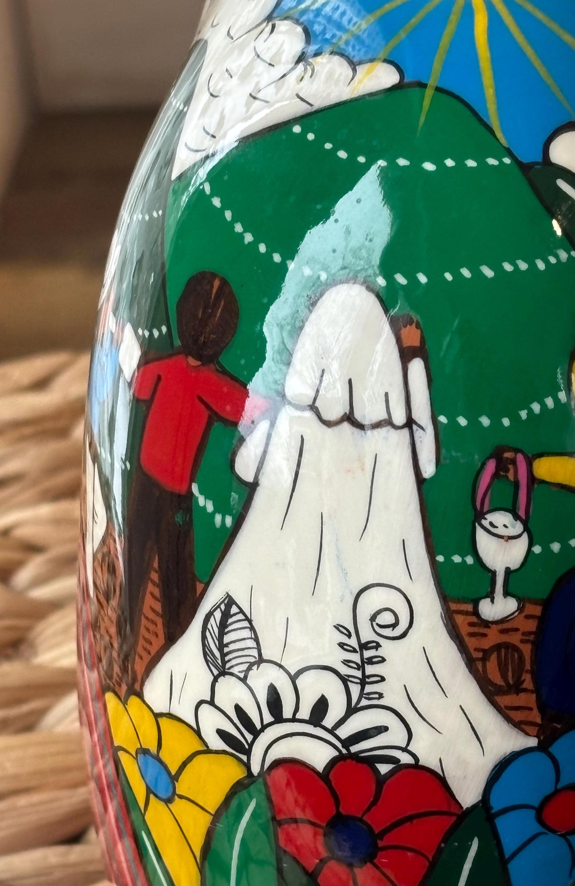 This vintage cat coin bank, hand painted and made in Mexico, features a unique design that will surely appeal to cat lovers and collectors alike. The bank has a really cute and touching scene of a wedding on the back. Very unique and a really cool figurine and coin bank. Just a really, really neat one of a kind piece.