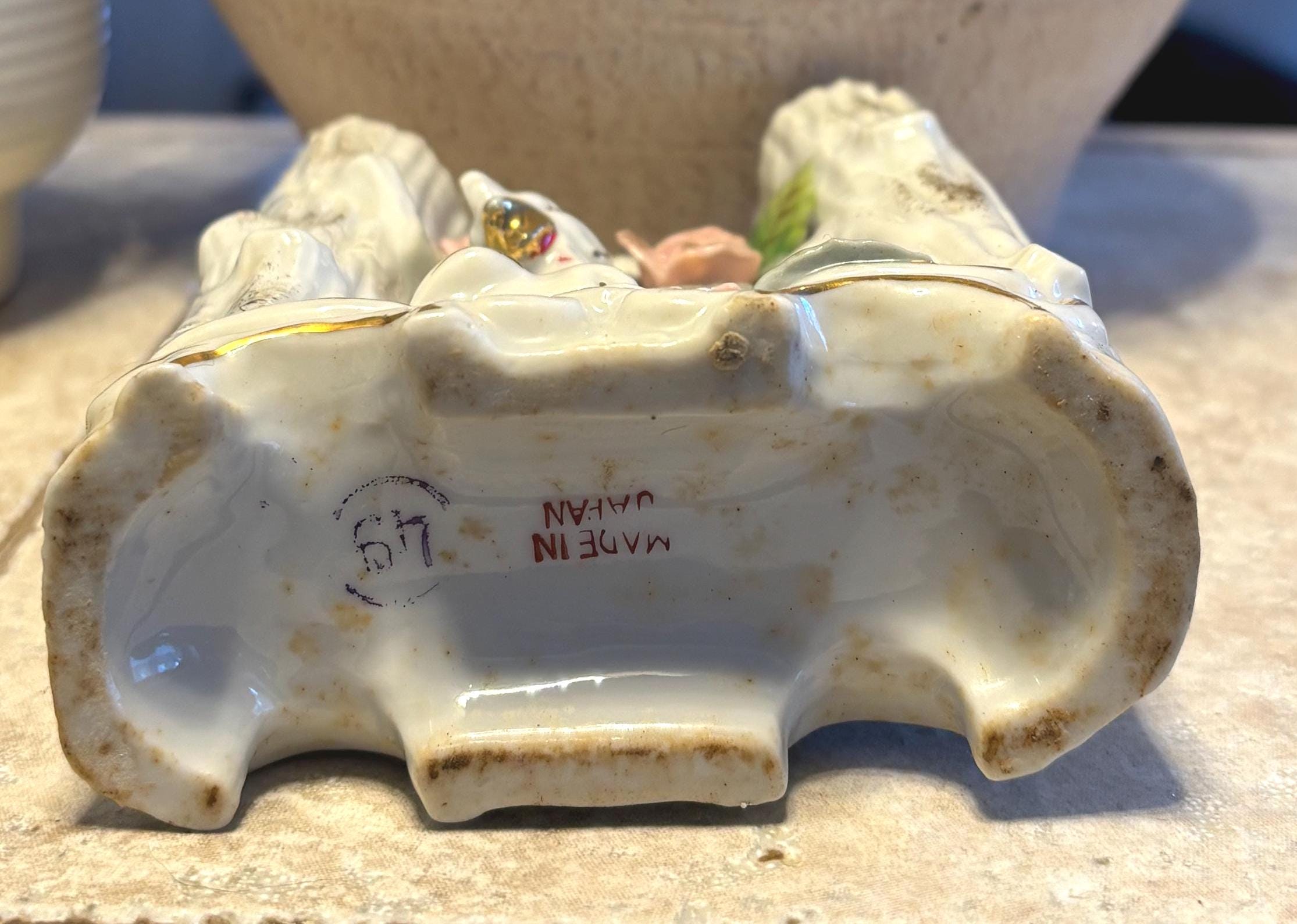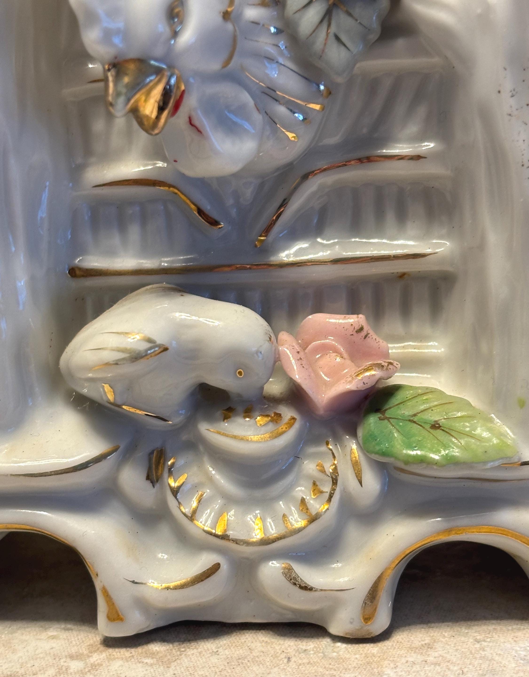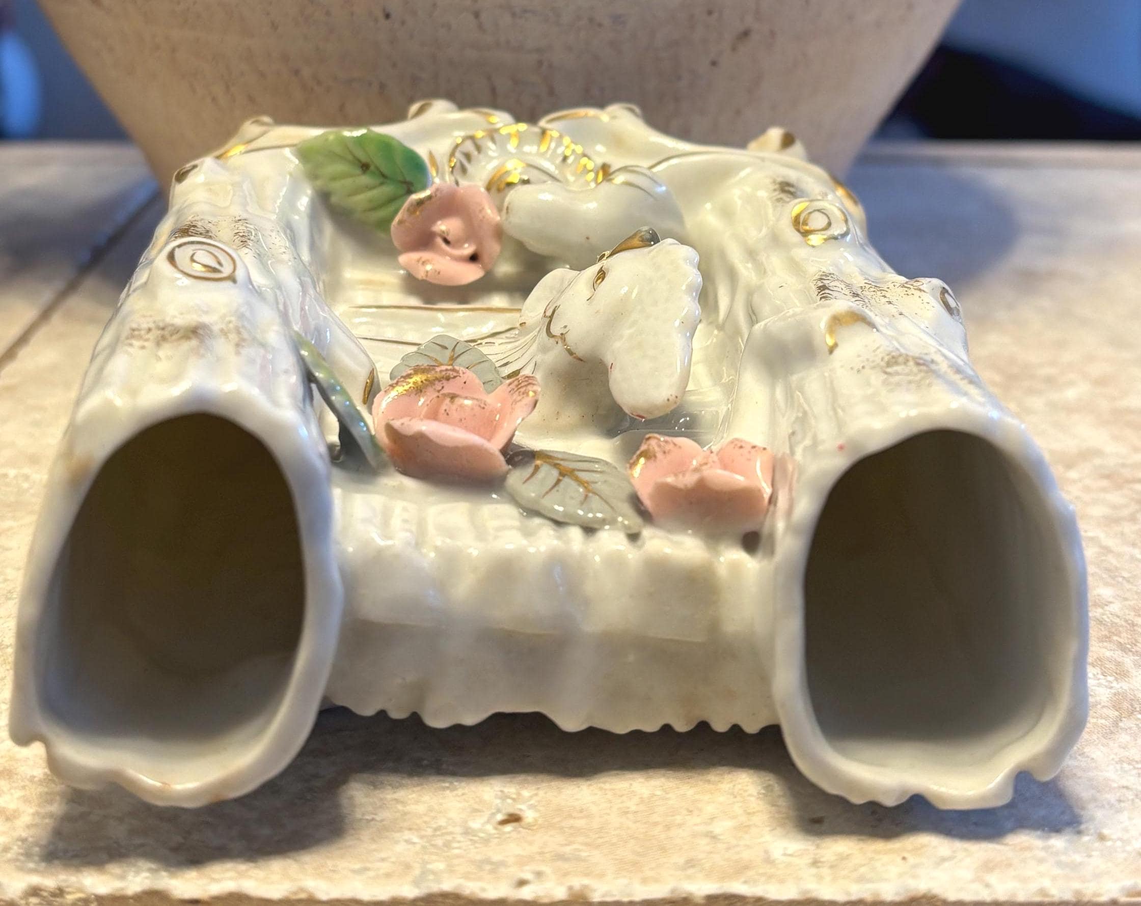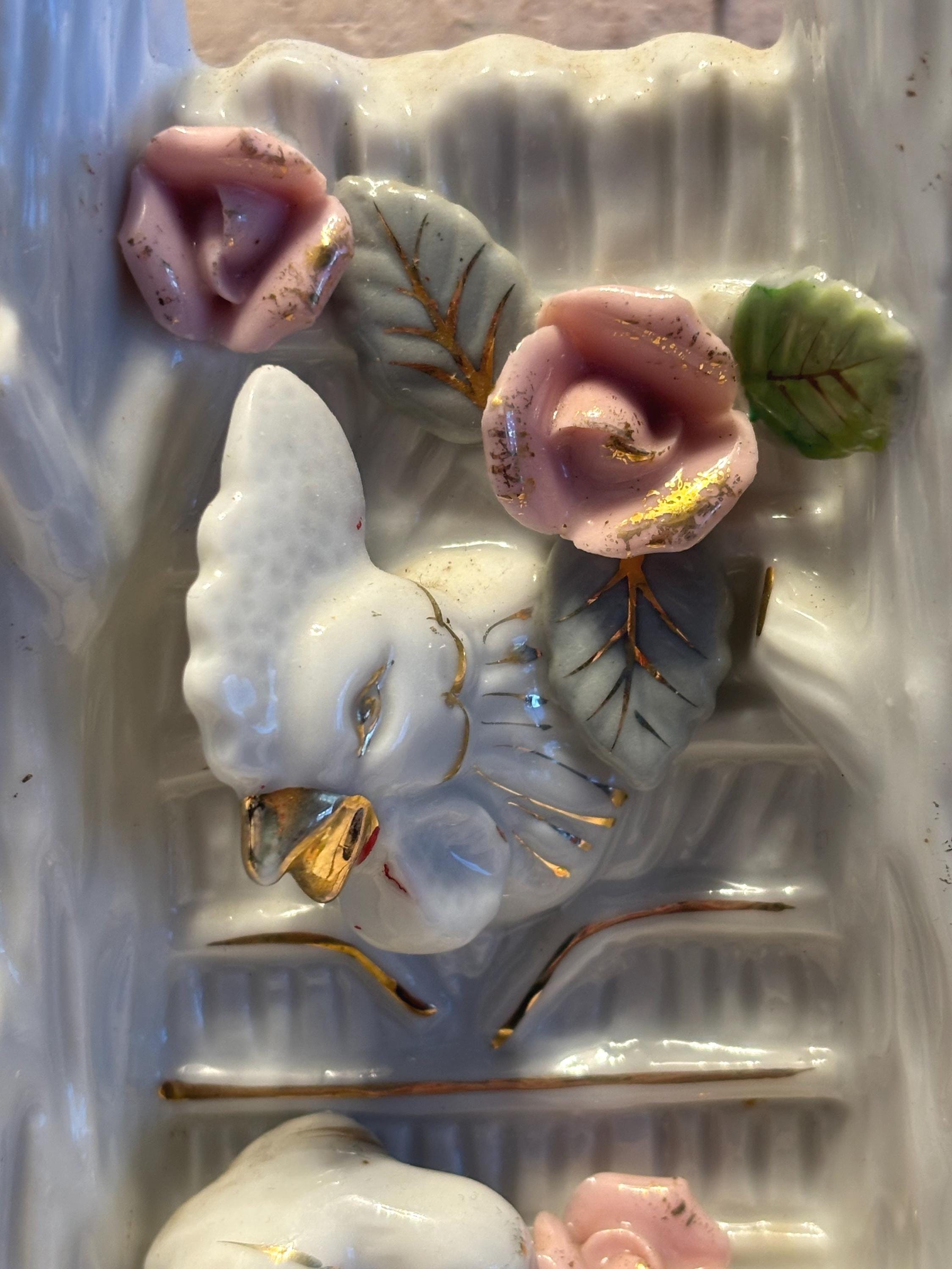 This is a super cute vintage double vase with floral accents and a looming rooster. There are accents of gold and it's really a pretty neat piece.