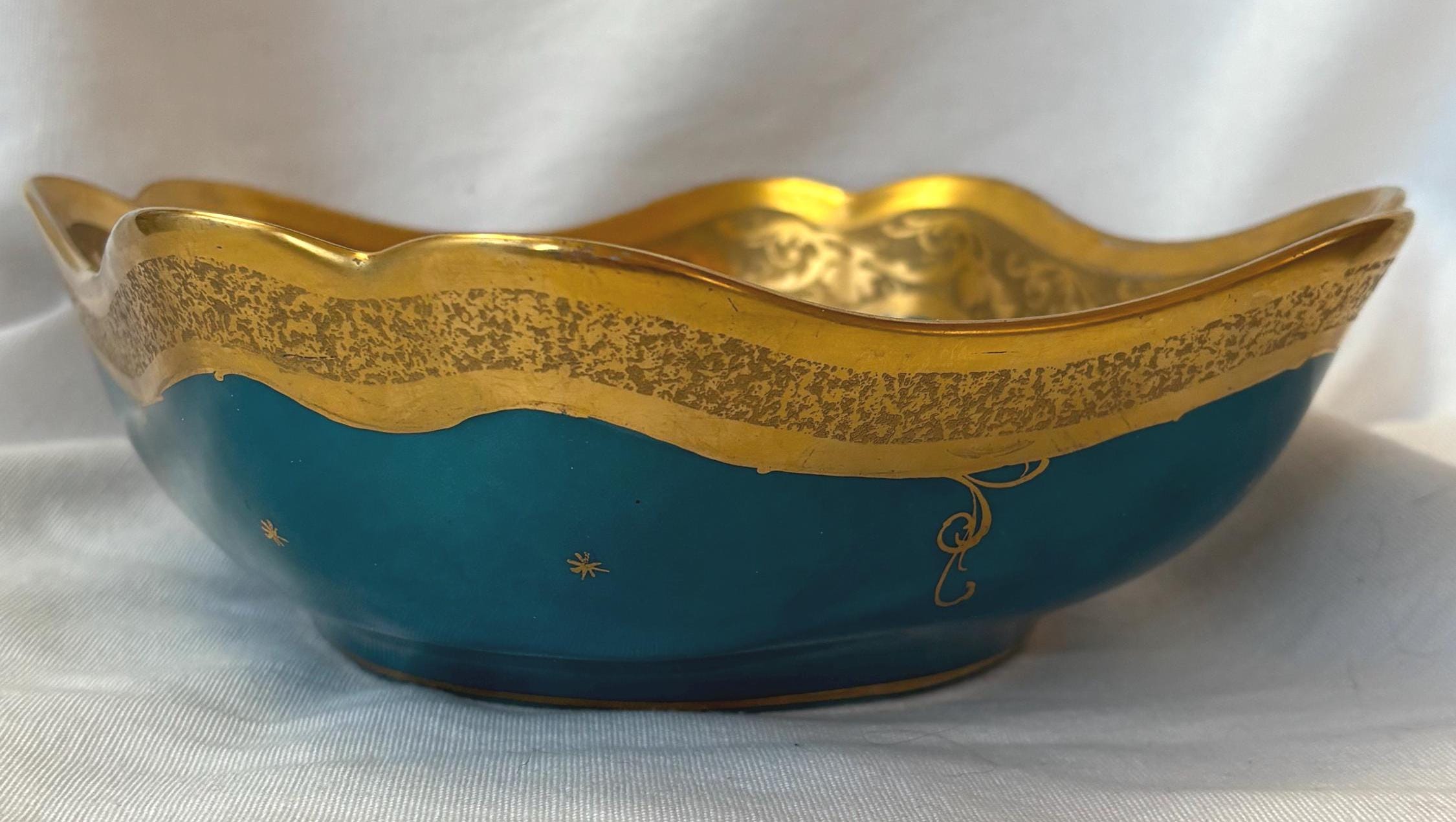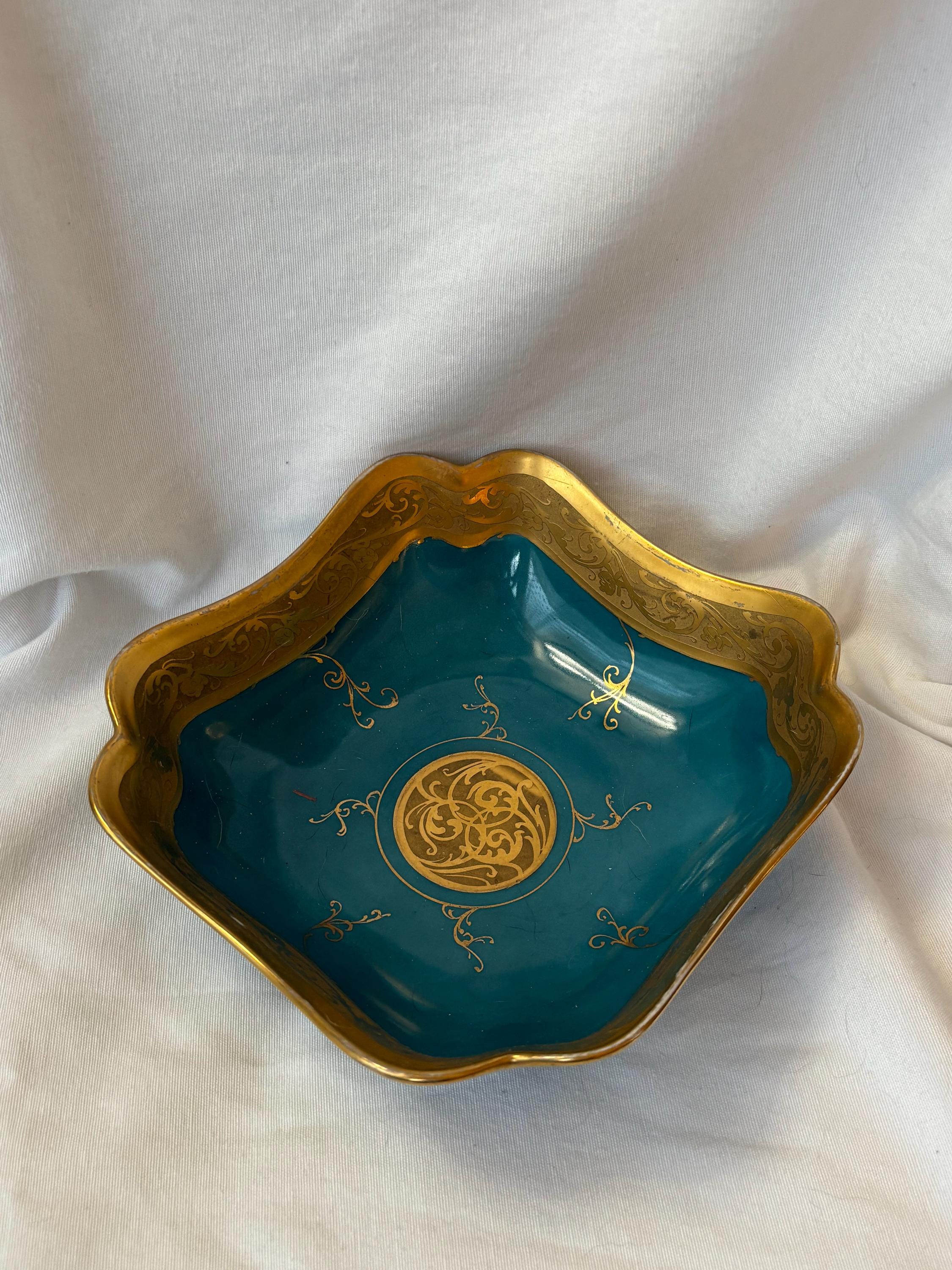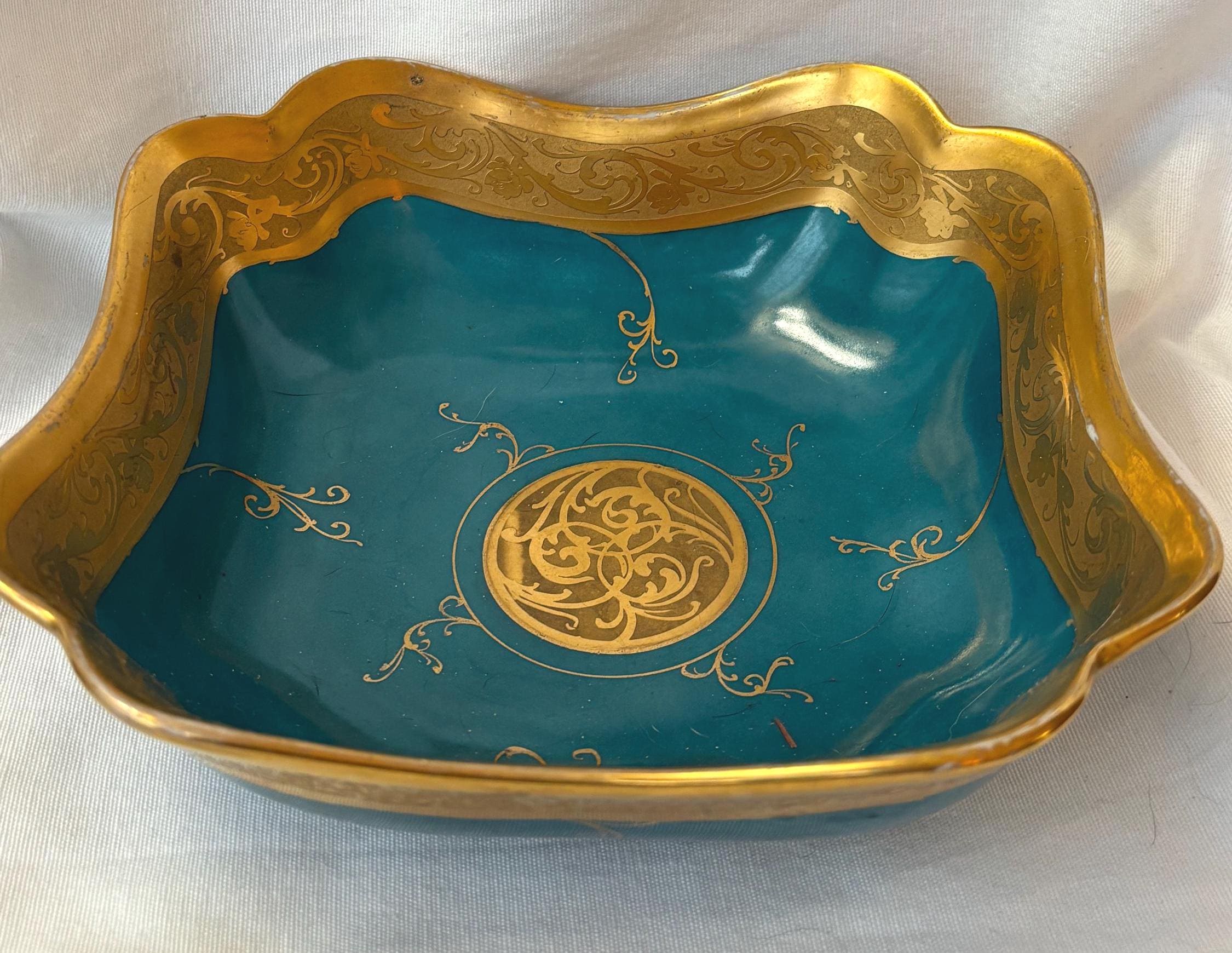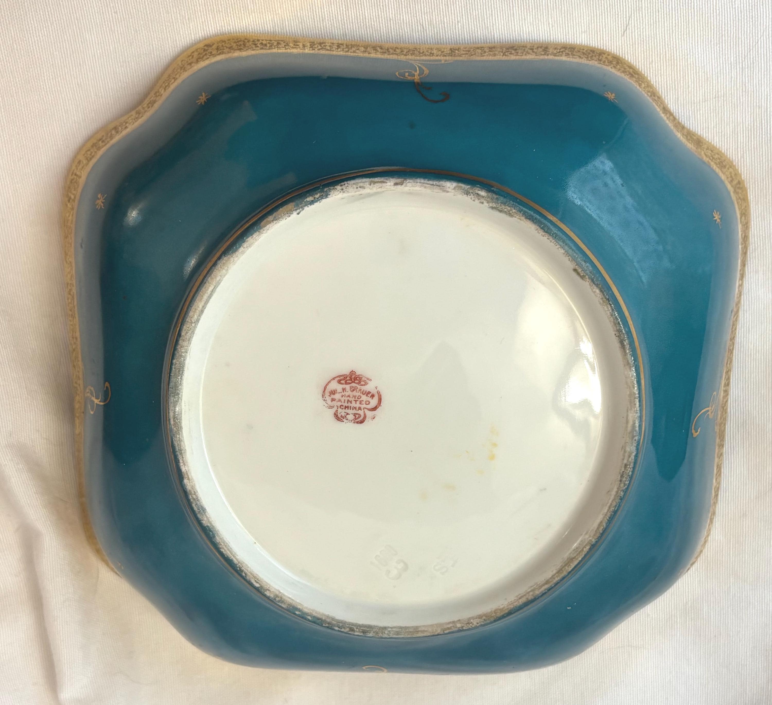 Beautiful art nouveau Julius H Brauer hand painted Octogonal shaped bowl. It features gold accents throughout and is absolutely gorgeous. There is some loss of paint here and there- particularly along the rim. In good condition- especially for its age. A gorgeous piece of fine china to add to a collection. Wear is consistent with age and use.